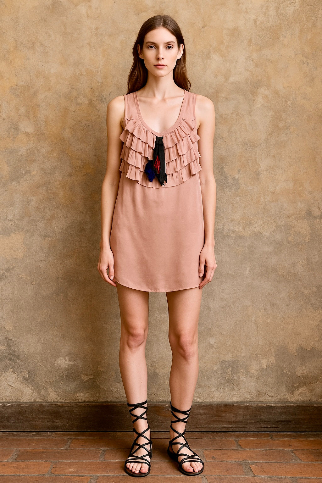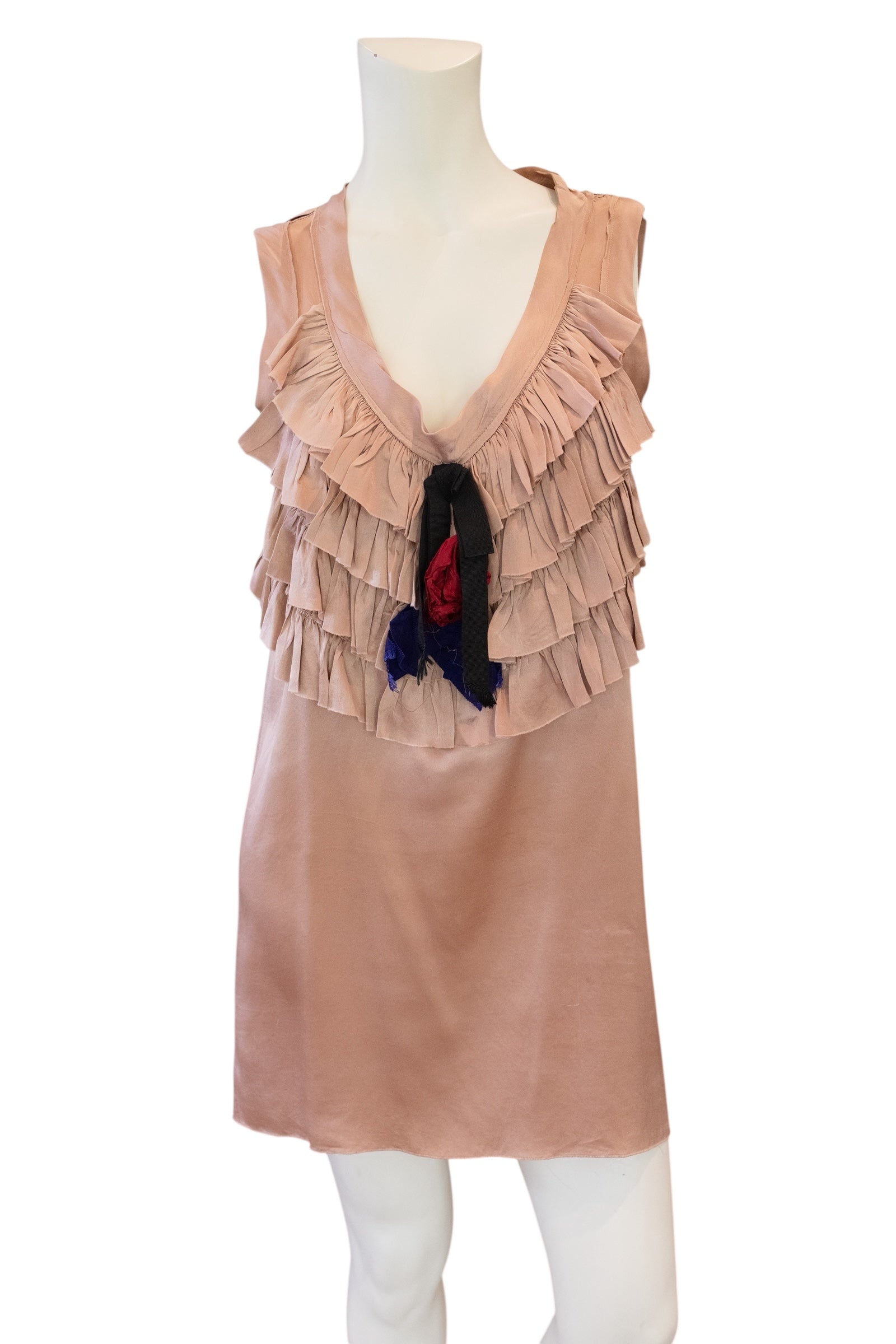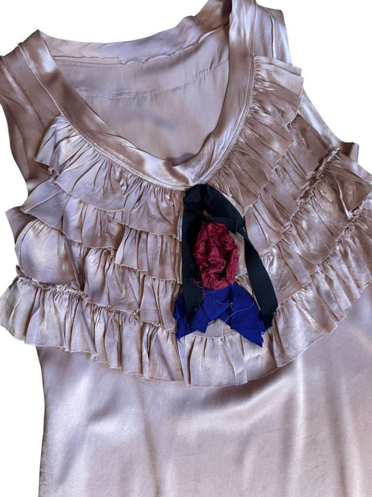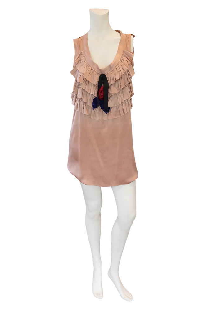 This iconic Lanvin 2004 under Isaac Mizrahi mini dress showcases luxurious pink silk in a sleeveless, straight silhouette. The front features delicate ruffles, enhanced by a floral rosette and a striking black and blue-grey bow, creating an elegant yet effortless look. Perfect for those seeking a timeless piece with refined detailing.