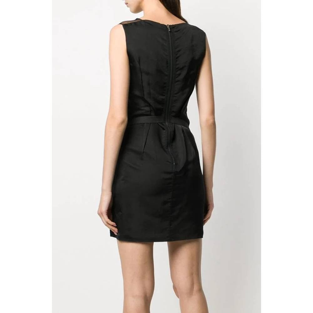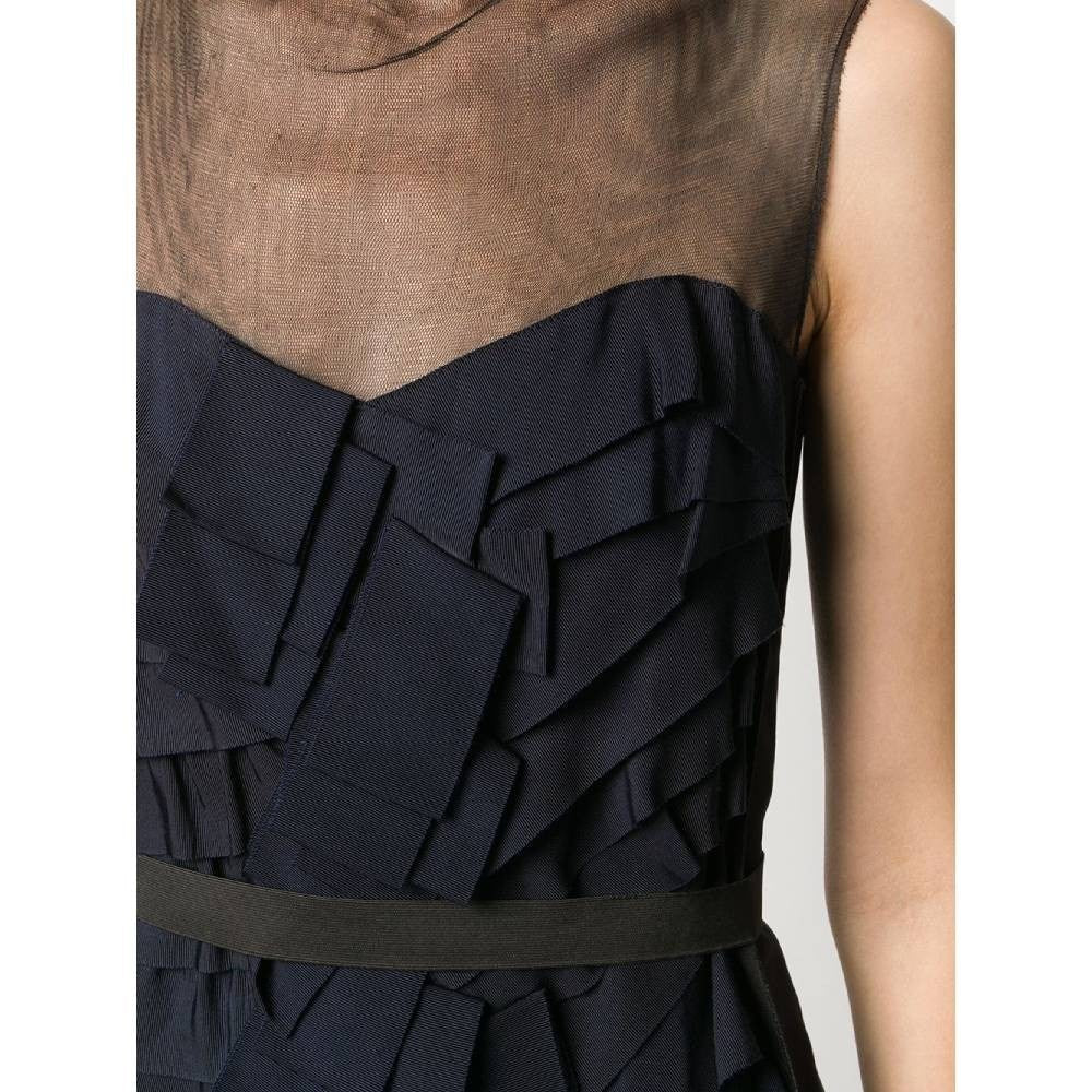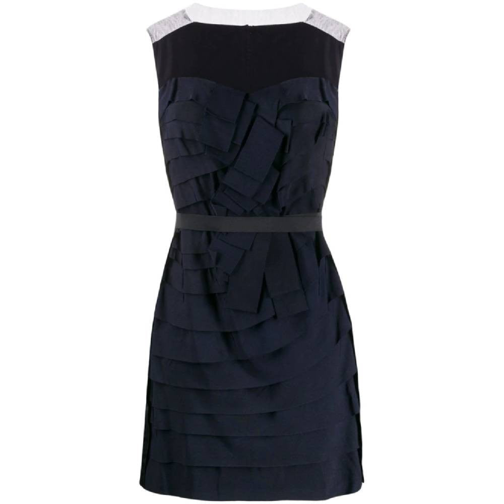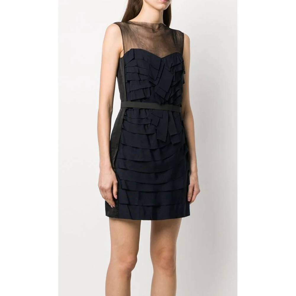 Lanvin dark navy blue silk 2000s sleeveless short dress. Front decorative pleated detail, transparent upper part with round neck, waist with belt. Back closure with concealed zip. Slim fit.