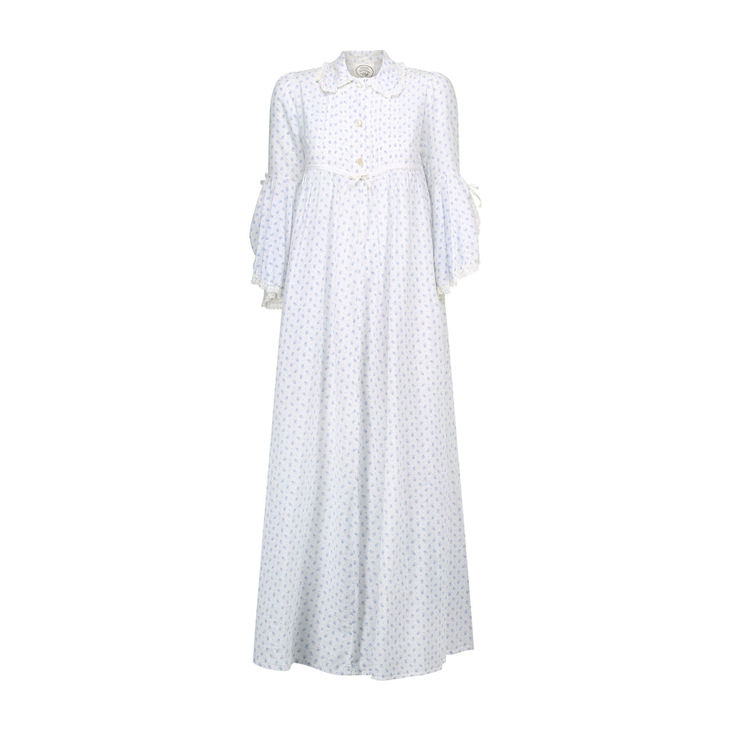 1970s Laura Ashley White Cotton and Blue Cornflower Print Dress