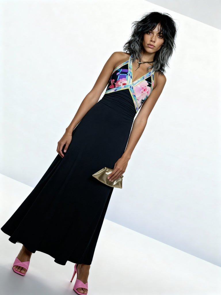 1970's Original Vintage Black Leonard Floral Print Halter Neck Dress UK 8 - 10