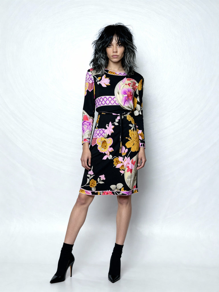 1970s Leonard Poly Jersey Abstract Print Floral Dress