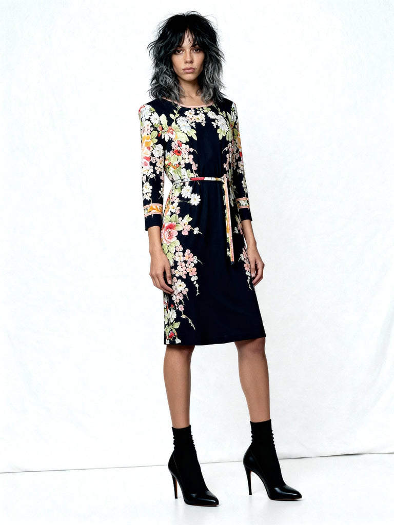 1980'S Original Vintage Black Leonard Floral Silk Dress Uk 10 - 12