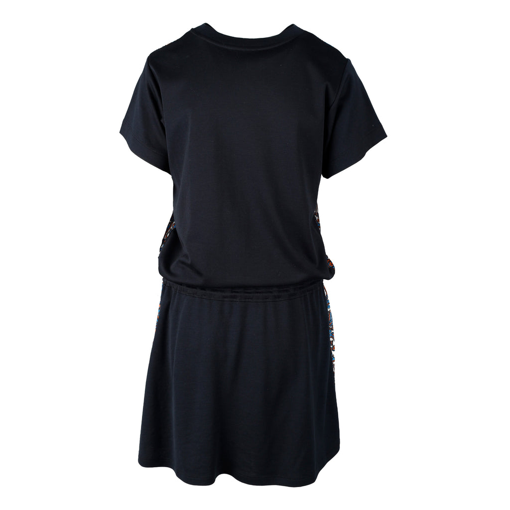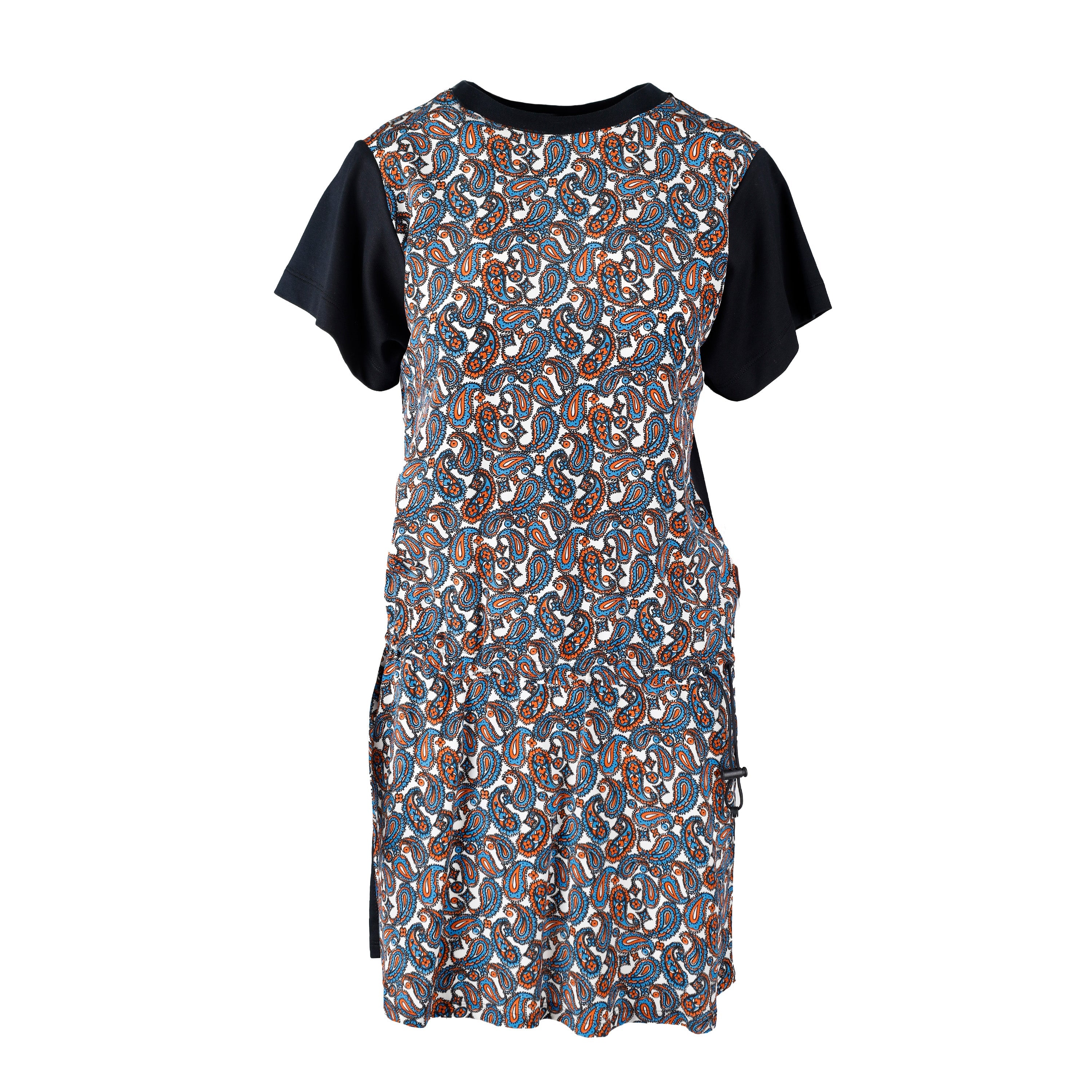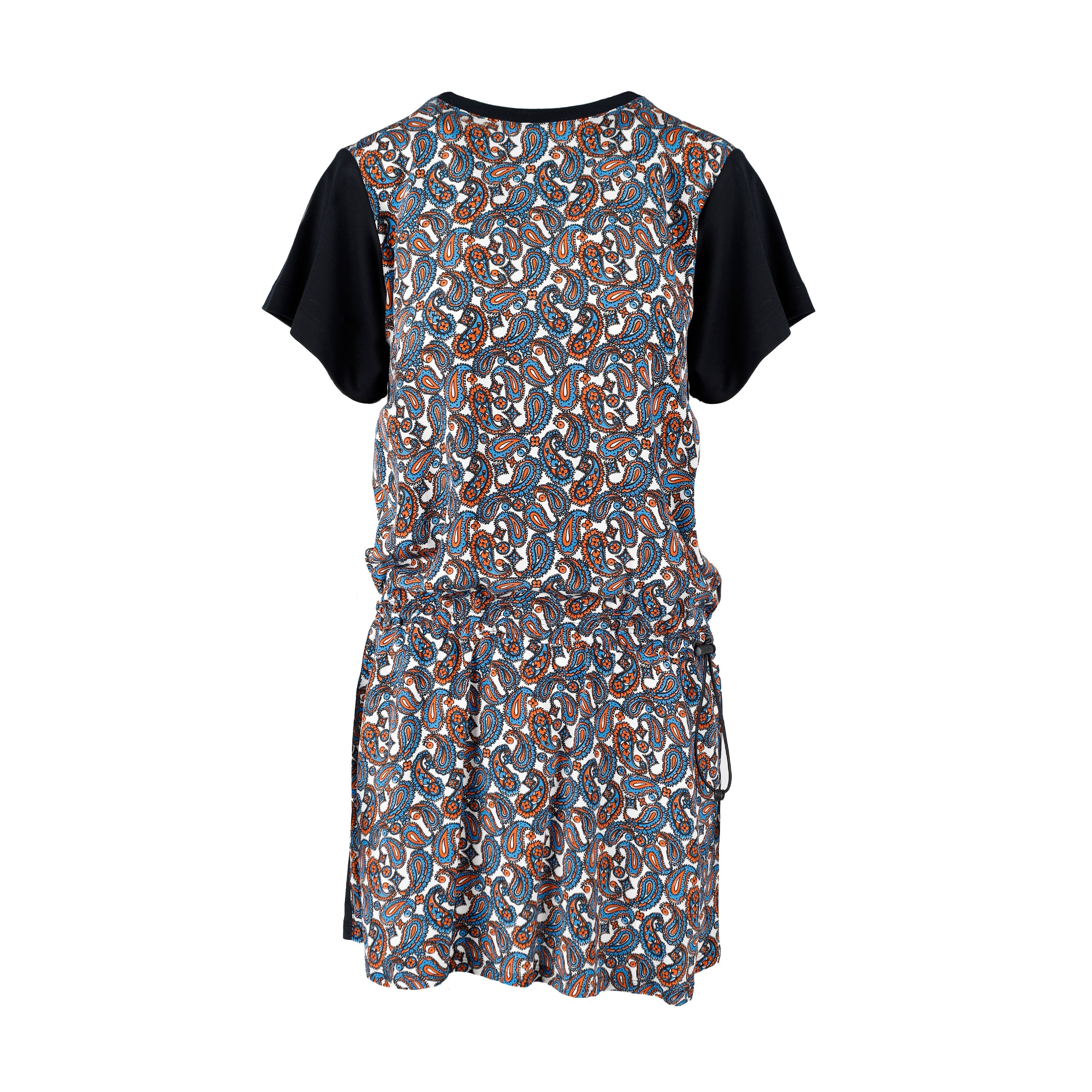 This classic Louis Vuitton dress is crafted from luxurious cotton and silk. The front is adorned with a stunning paisley prints in blue and orange, while the back is a solid black cotton. It is tailored with short sleeves and is finished with an elastic waistband for a flattering, tunic-style fit.