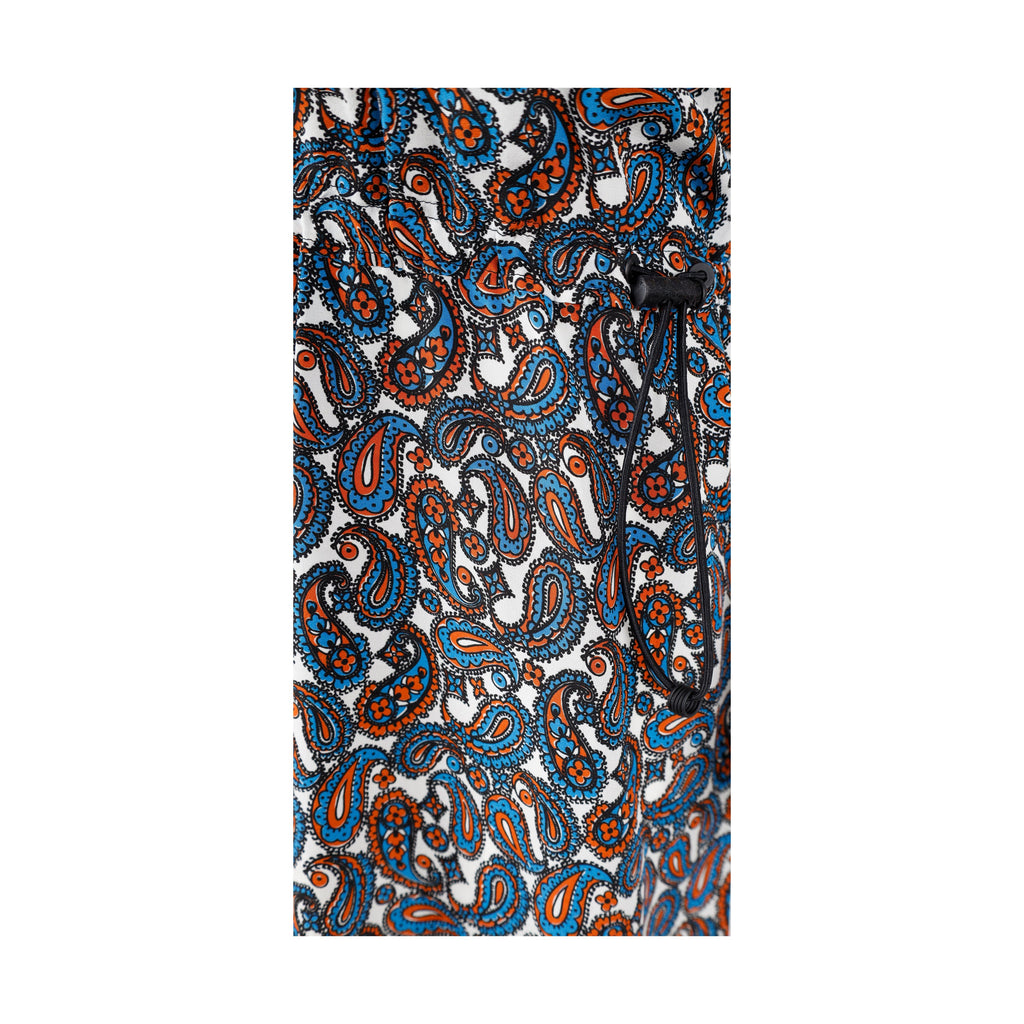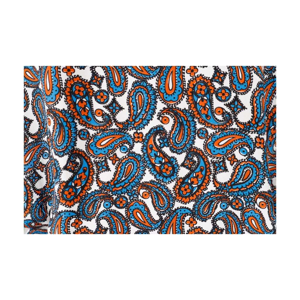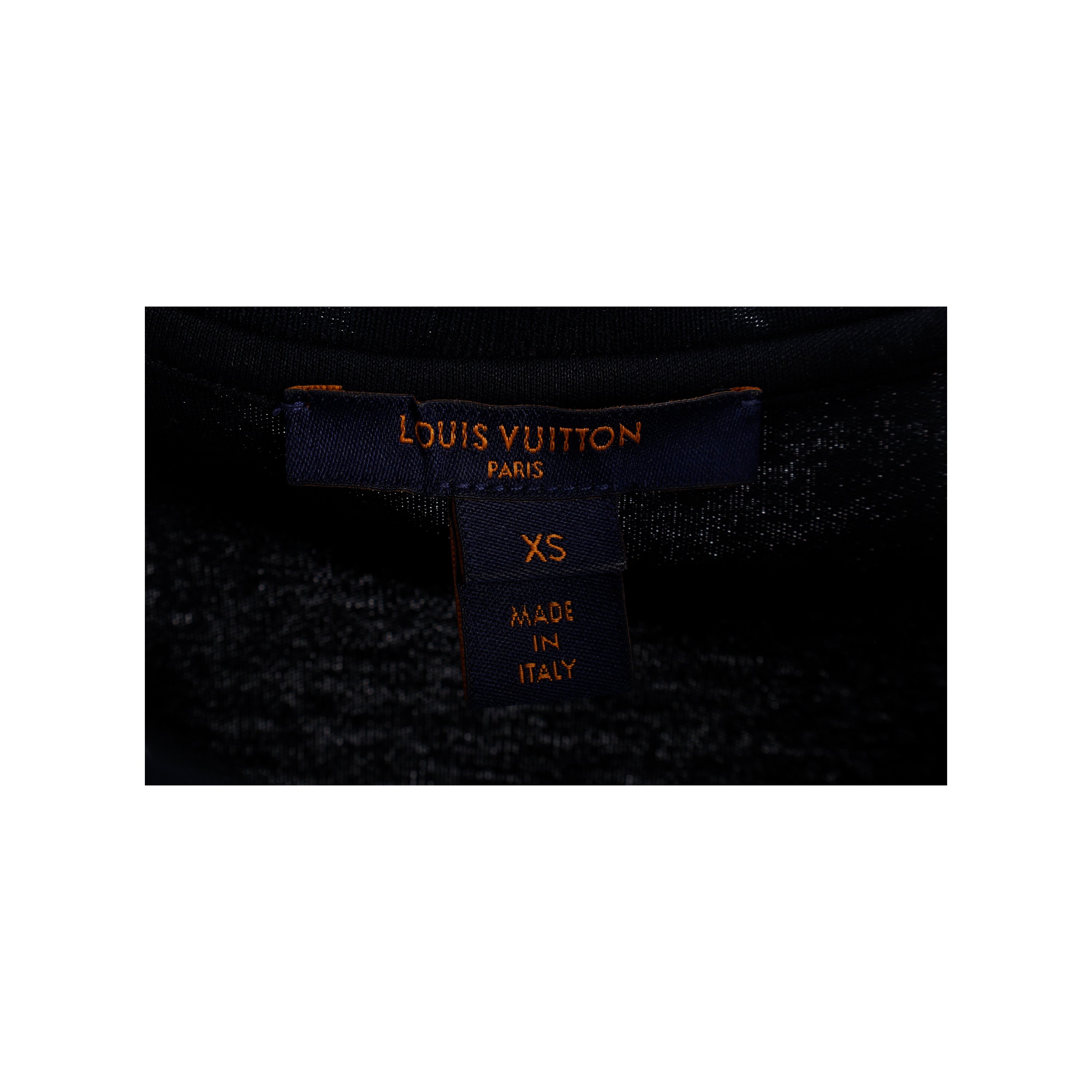 This classic Louis Vuitton dress is crafted from luxurious cotton and silk. The front is adorned with a stunning paisley prints in blue and orange, while the back is a solid black cotton. It is tailored with short sleeves and is finished with an elastic waistband for a flattering, tunic-style fit.