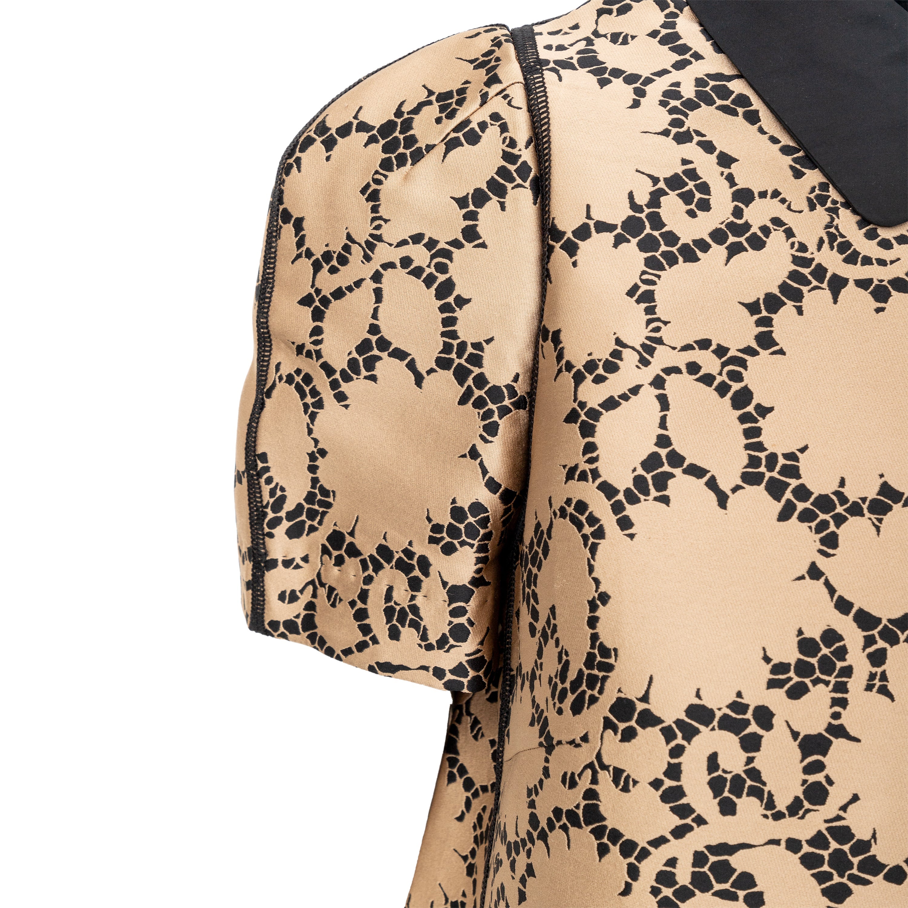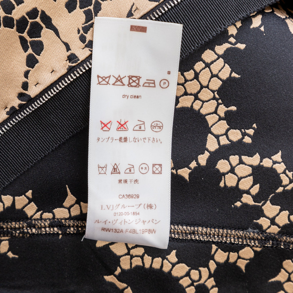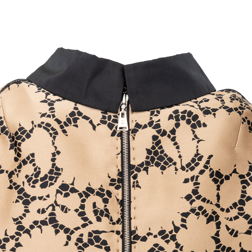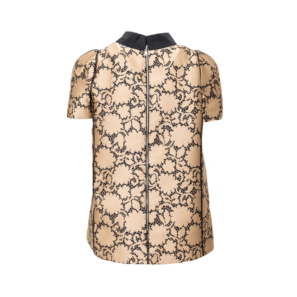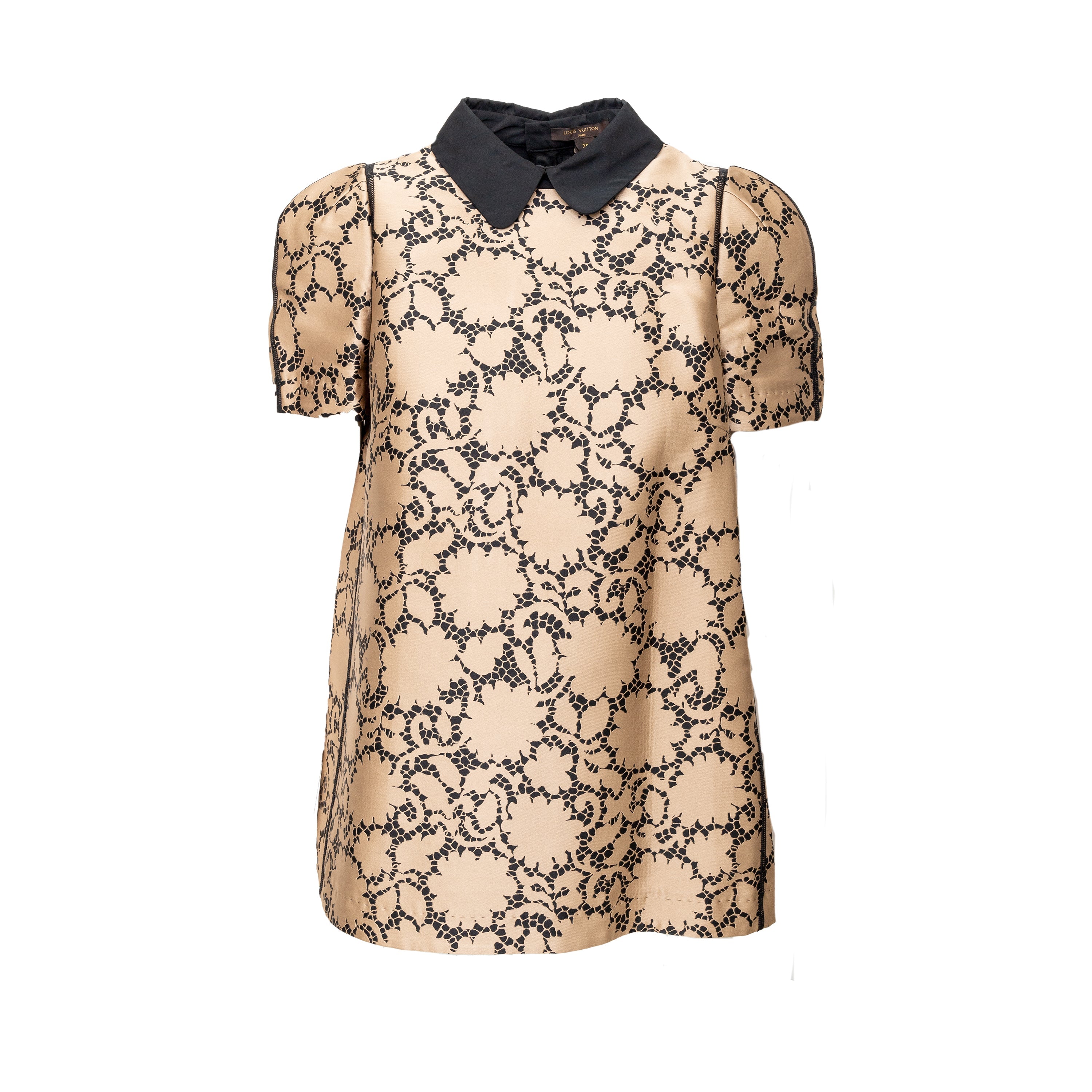 This elegant Louis Vuitton top is crafted from golden-bronze silk fabric adorned by a beautiful black lace print. The classic Peter Pan collar and unique pleated short sleeves create a sophisticated and puffy look.