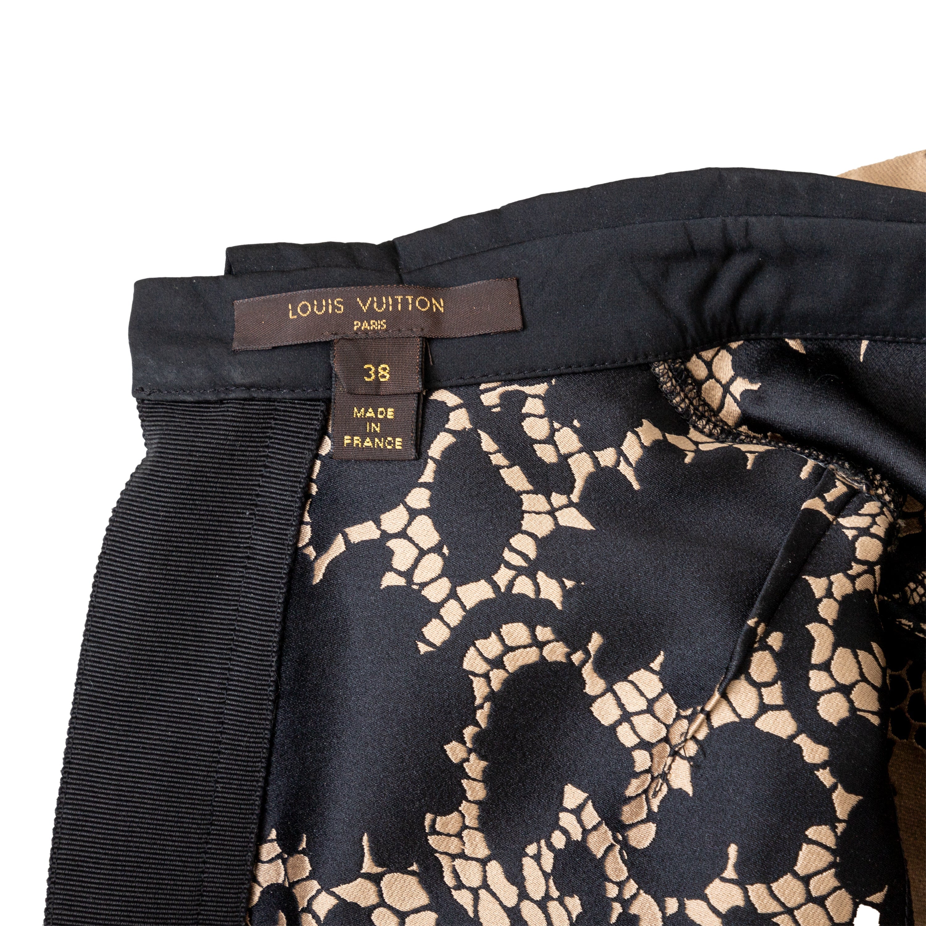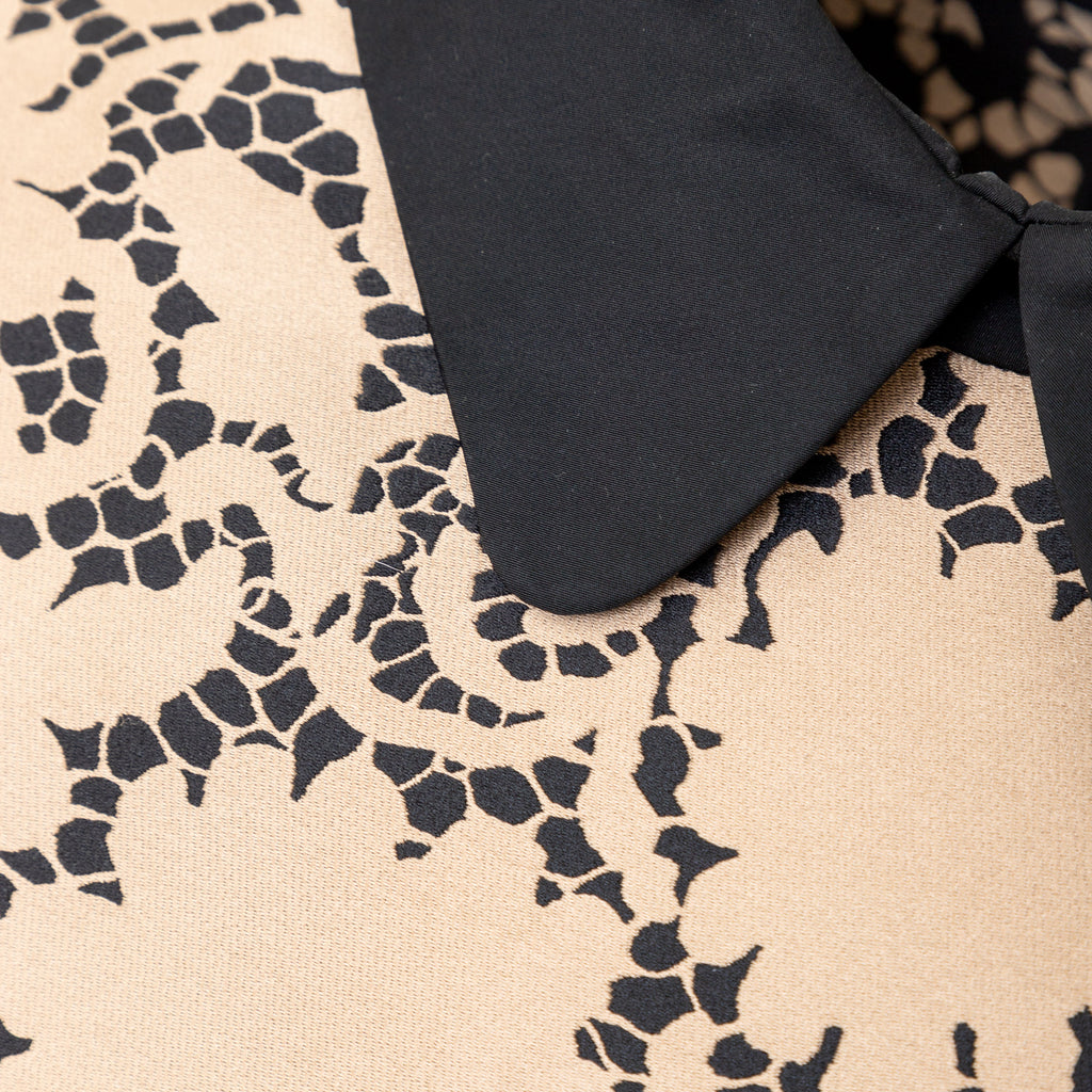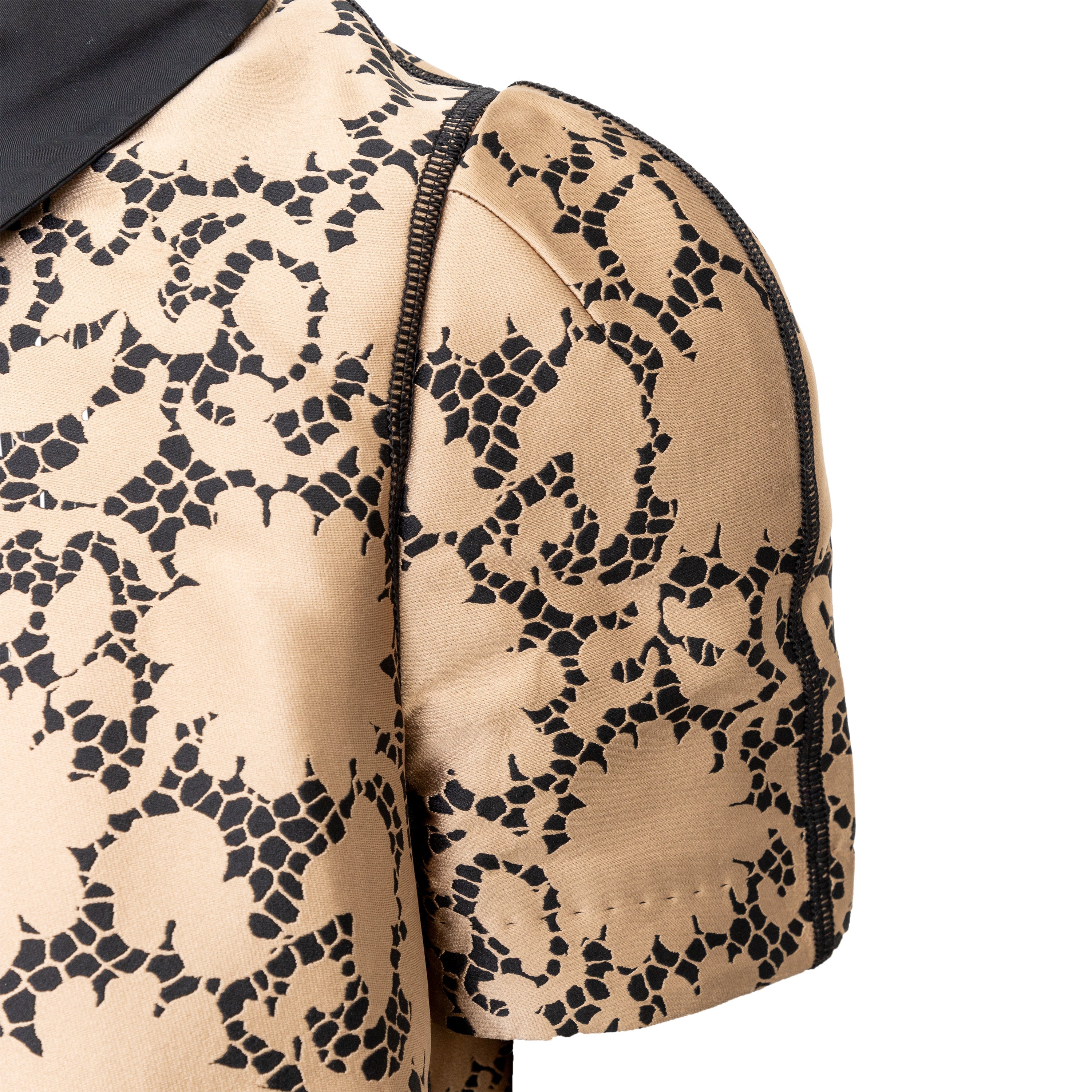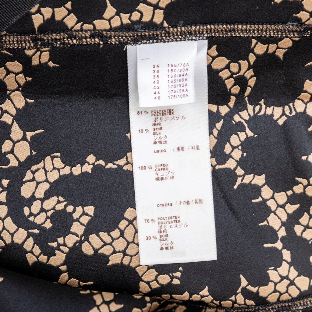 This elegant Louis Vuitton top is crafted from golden-bronze silk fabric adorned by a beautiful black lace print. The classic Peter Pan collar and unique pleated short sleeves create a sophisticated and puffy look.
