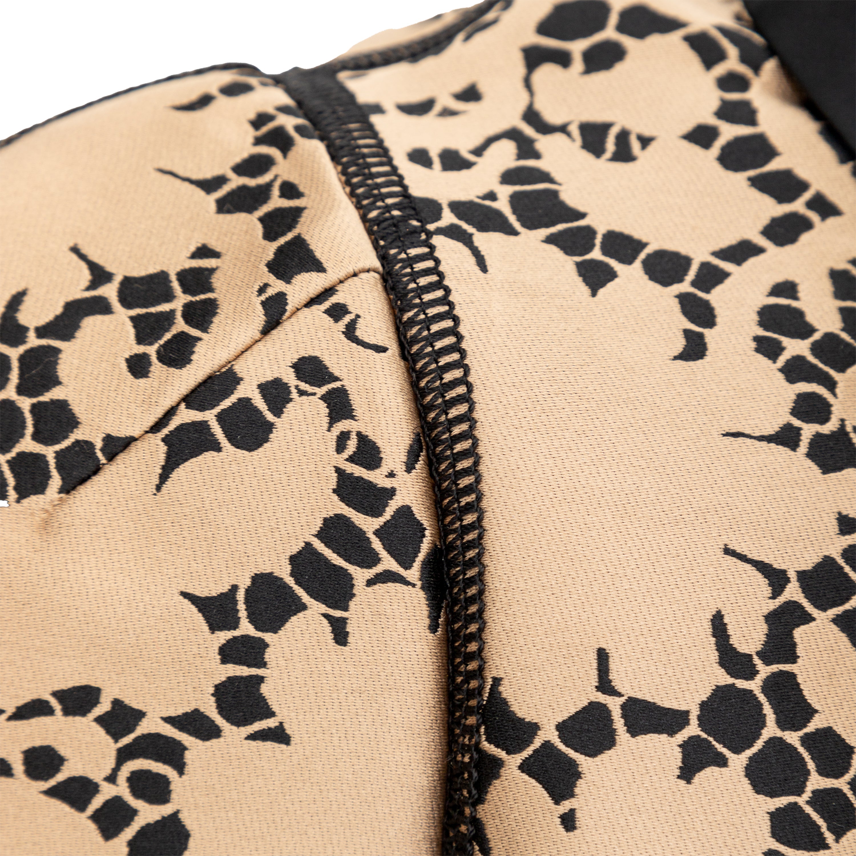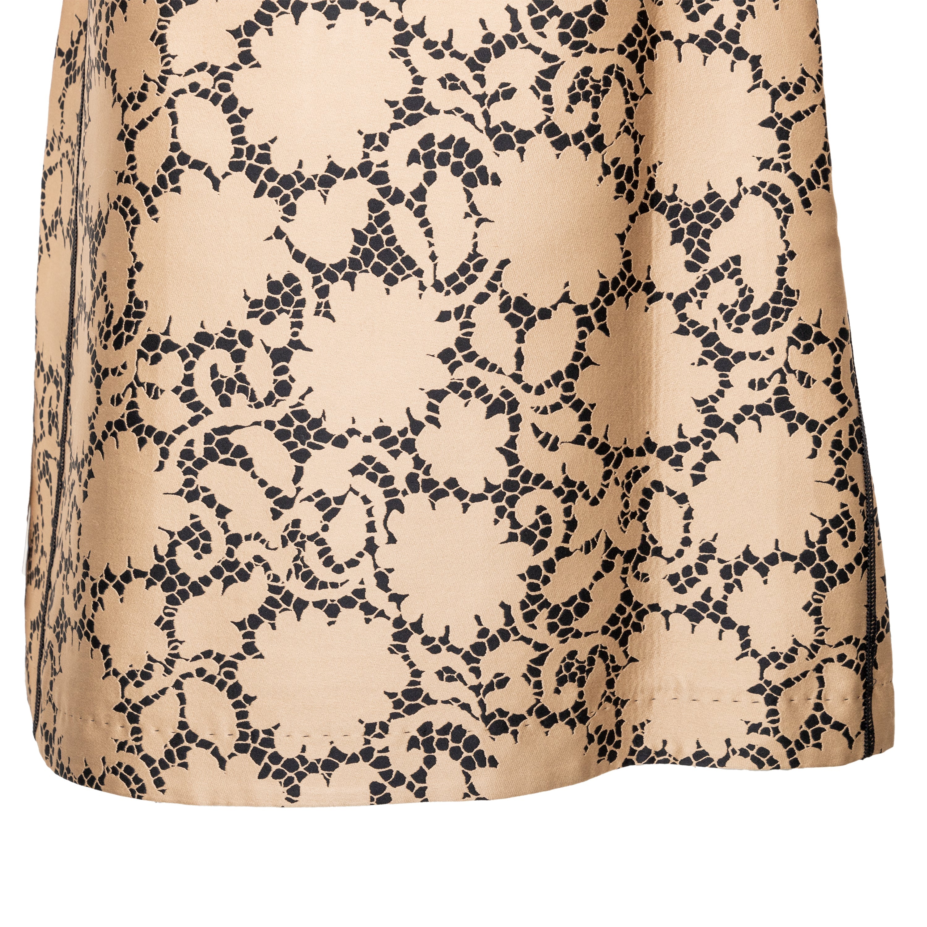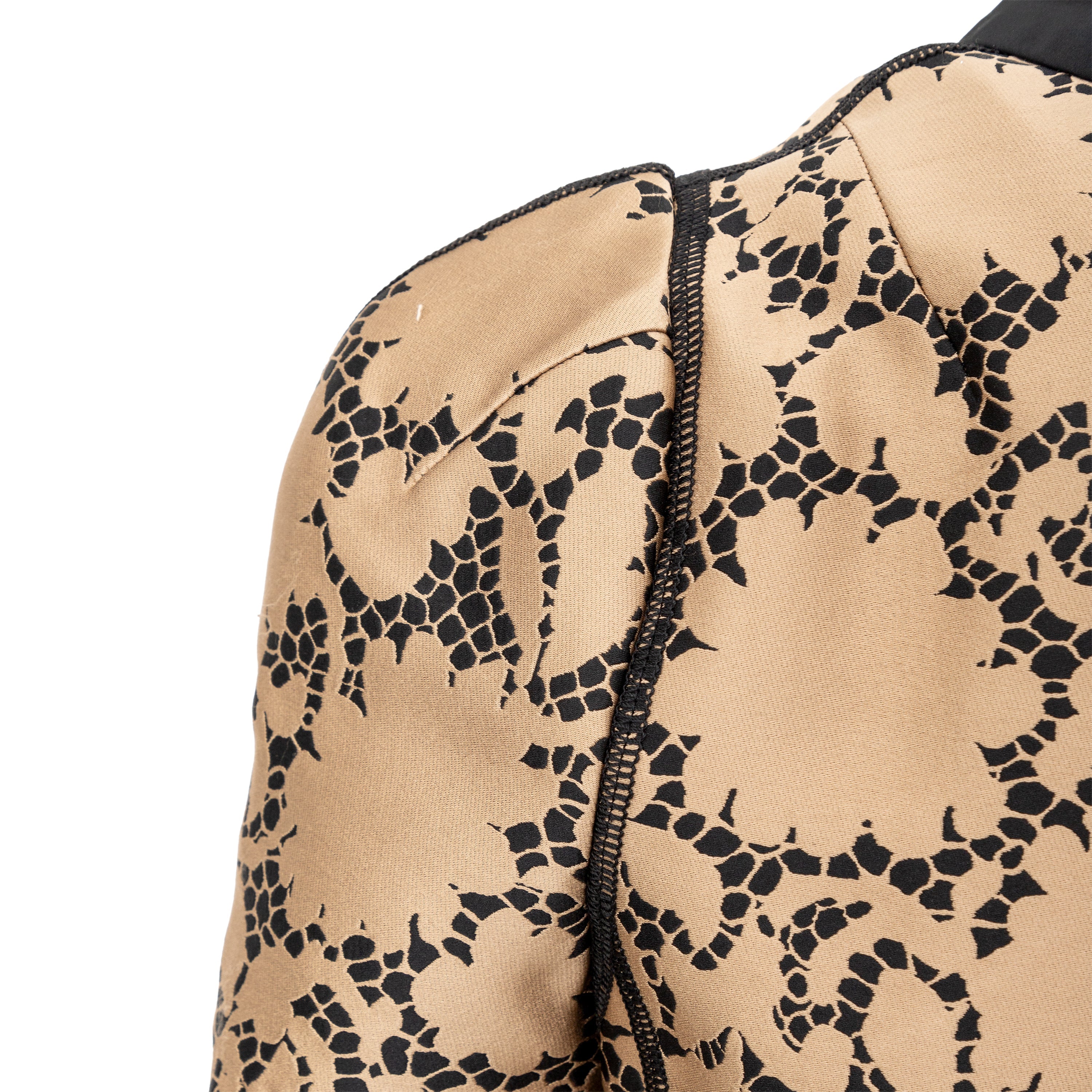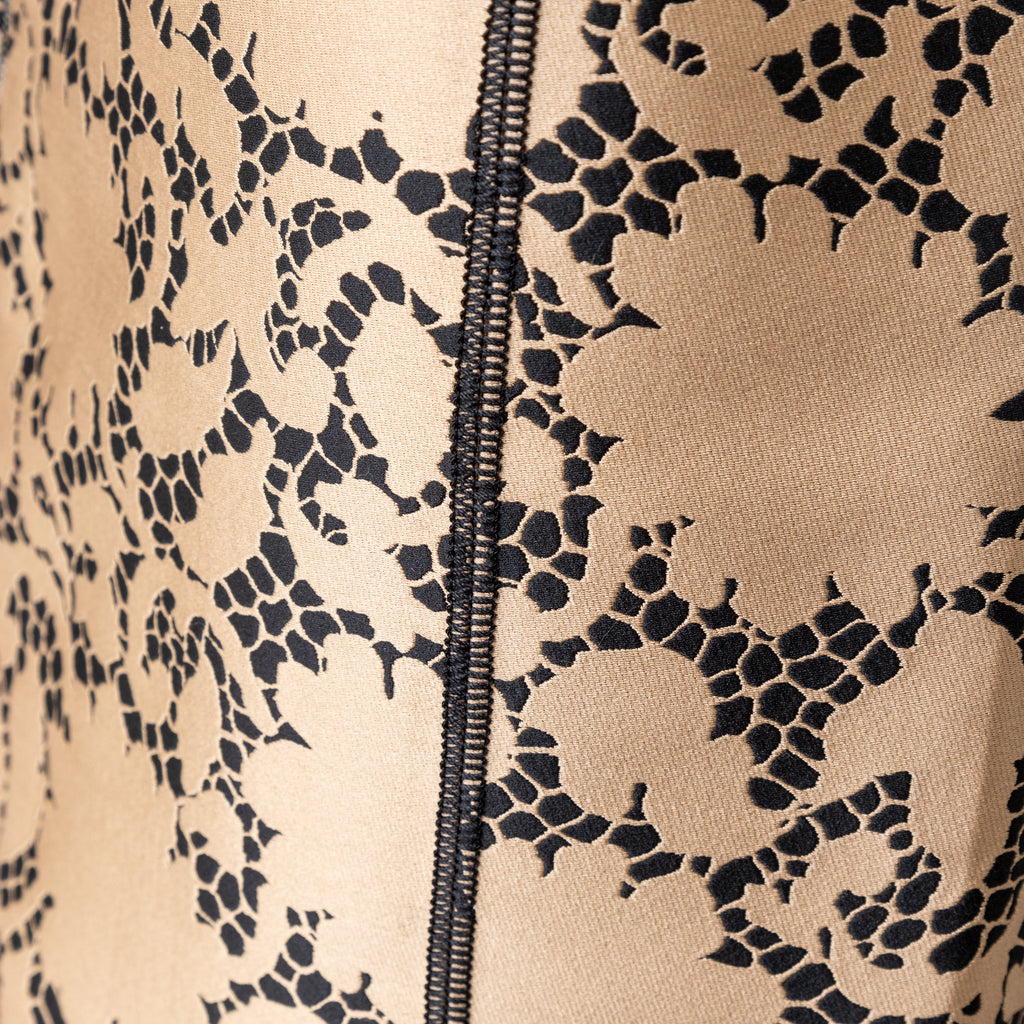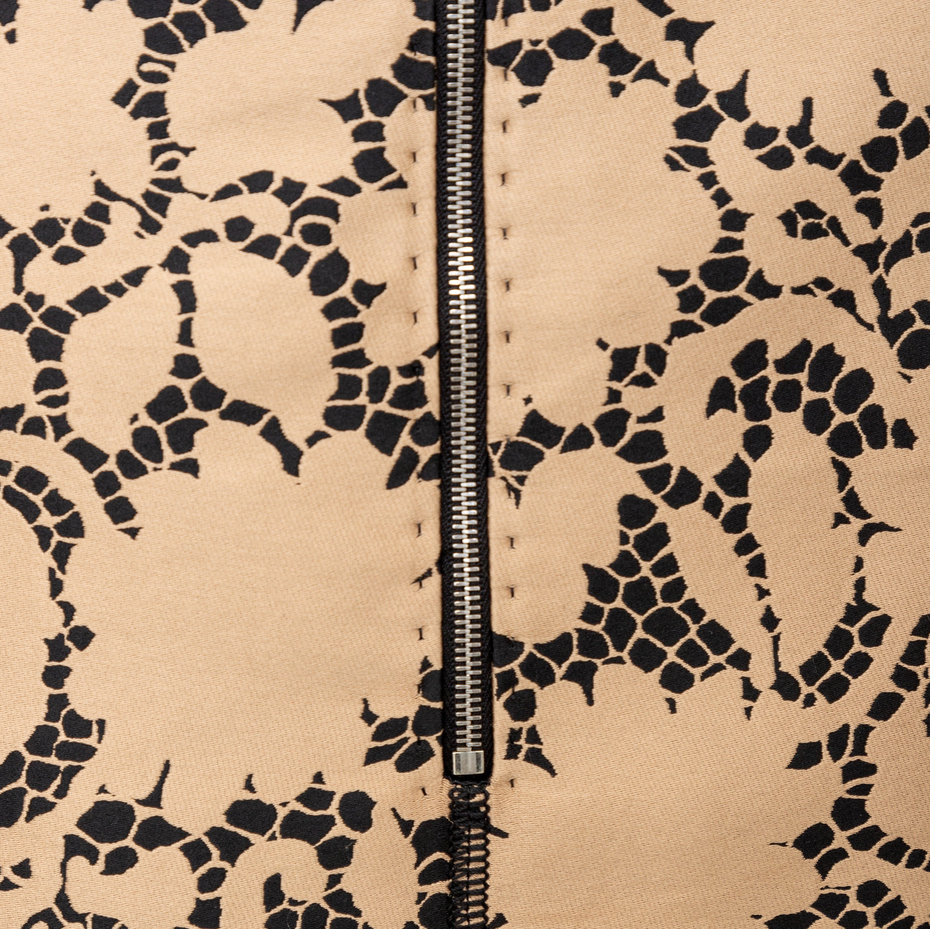 This elegant Louis Vuitton top is crafted from golden-bronze silk fabric adorned by a beautiful black lace print. The classic Peter Pan collar and unique pleated short sleeves create a sophisticated and puffy look.