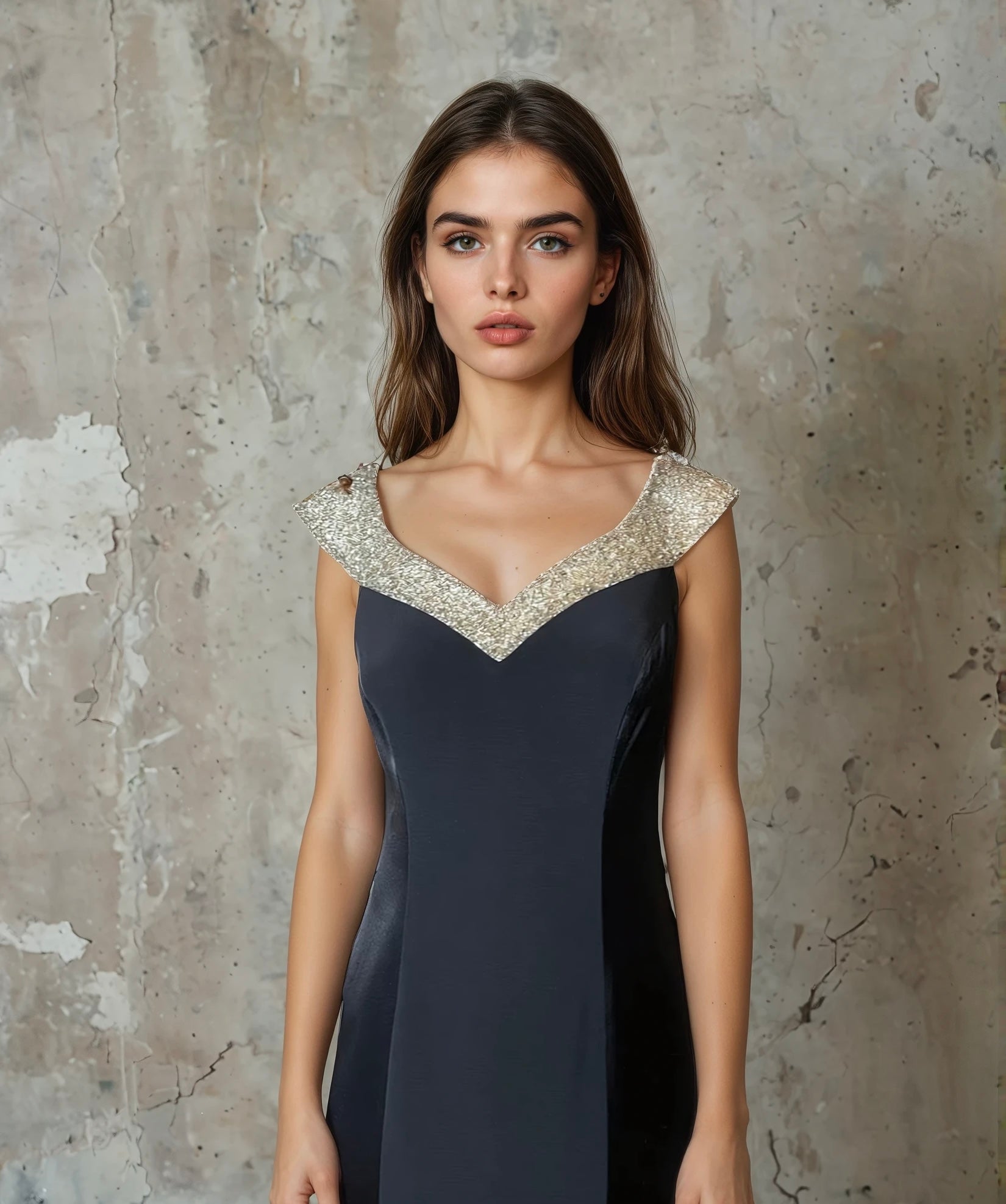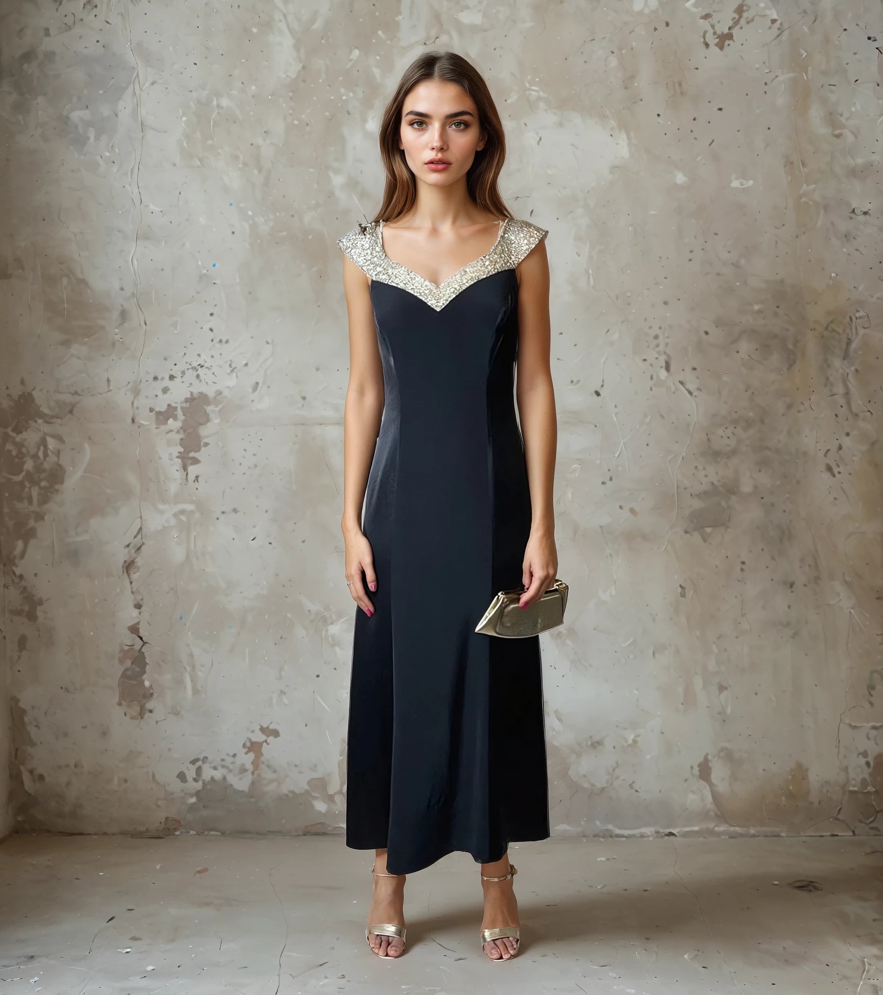 This Vintage 1990's Black Crepe/Satin & Silver Beaded Dress by "John Charles" is in great condition. It features silver beads over the top part with satin panel sides, a zip up the back and is fully lined. It would fit a UK size 12 but please do check the measurements to avoid disappointment.