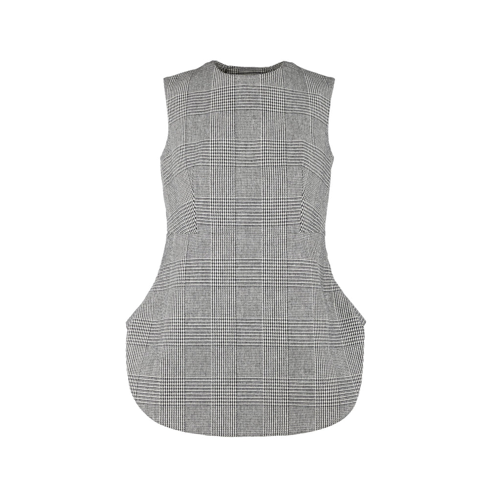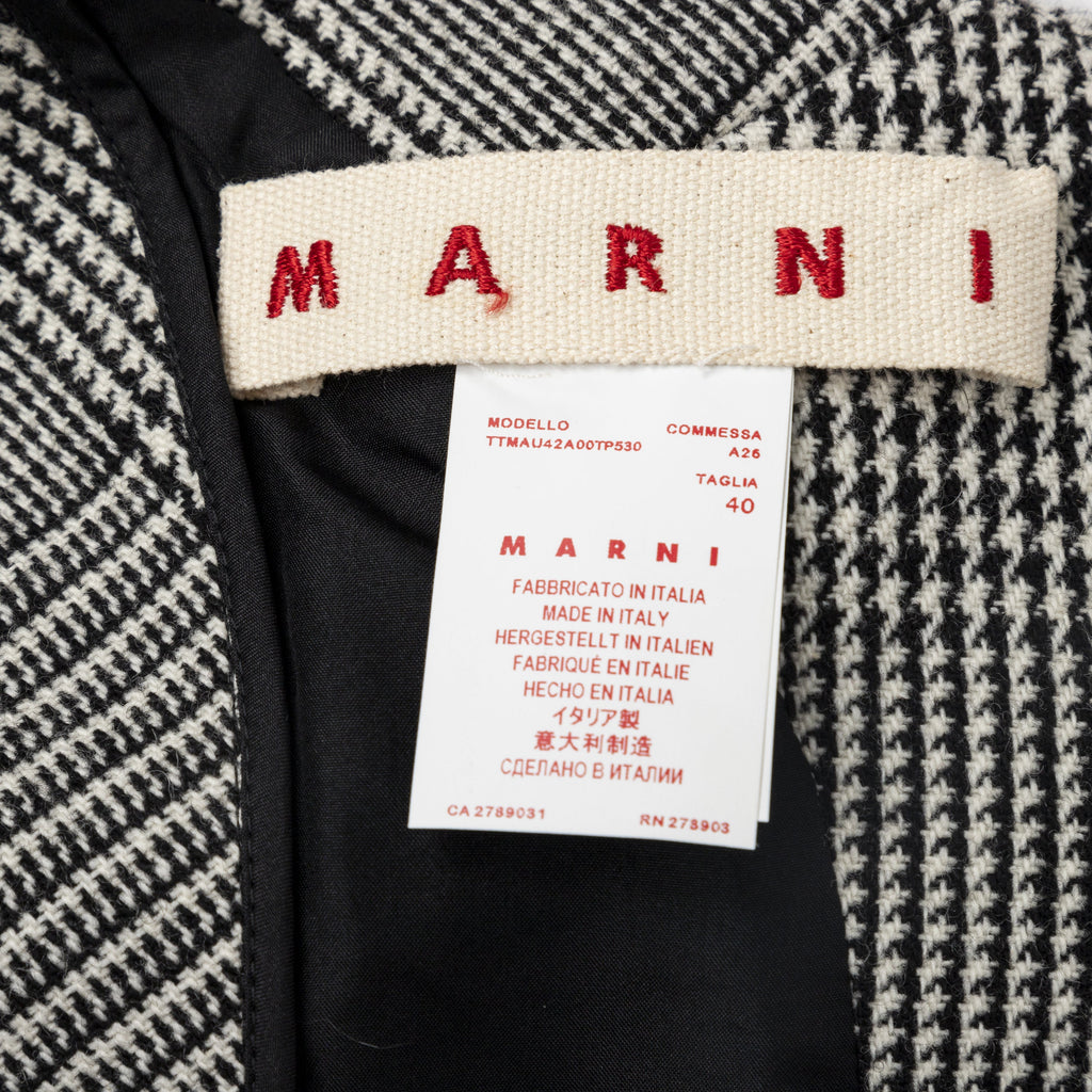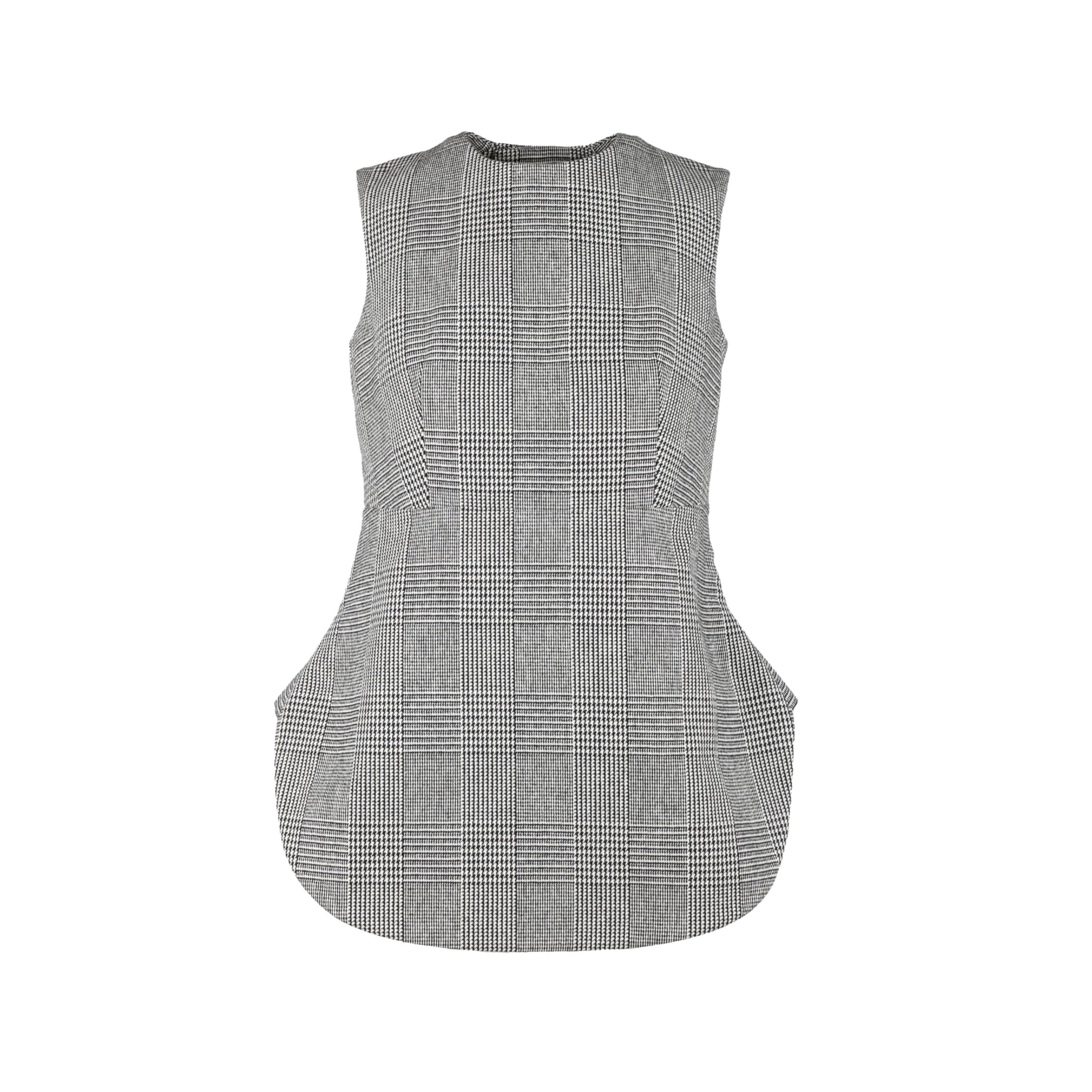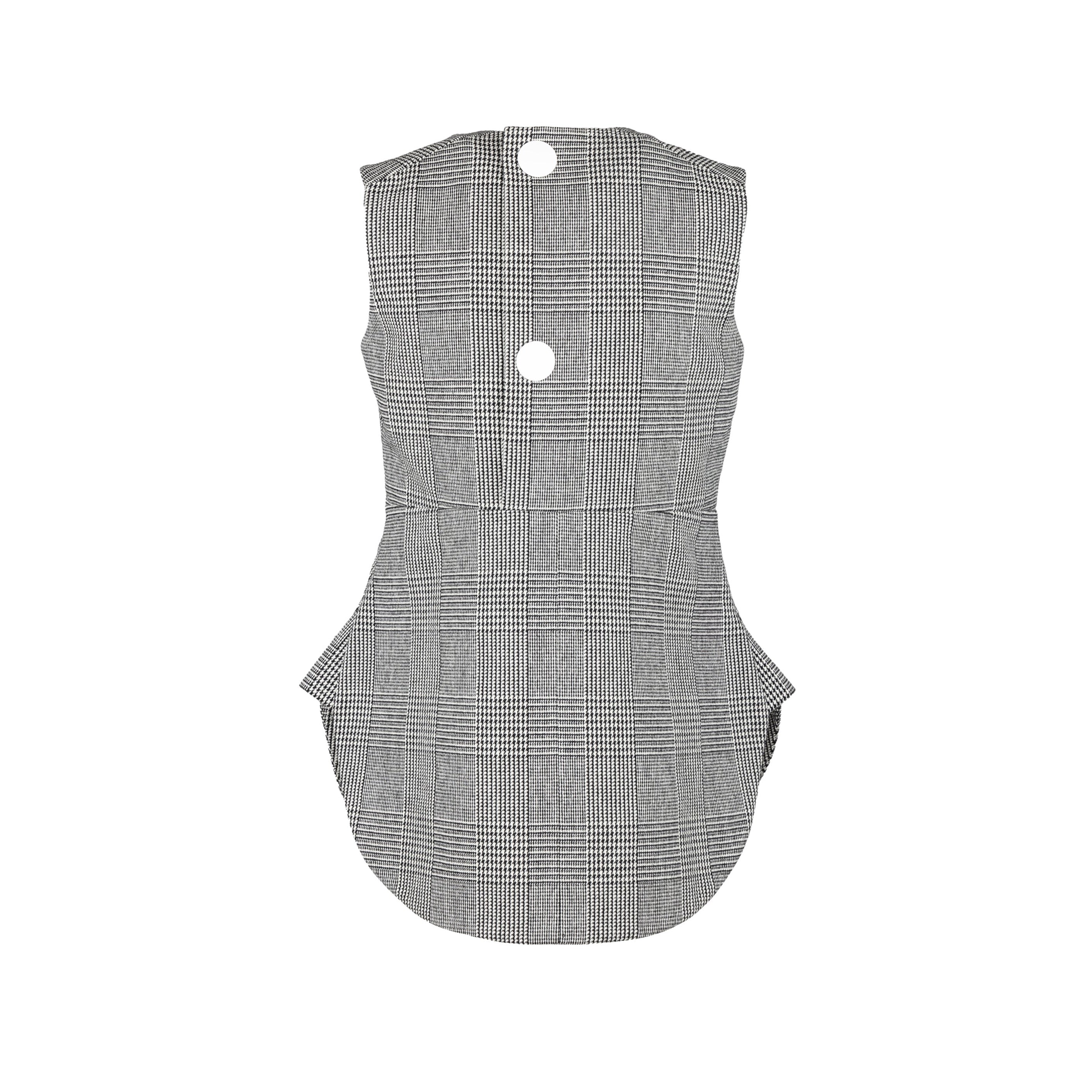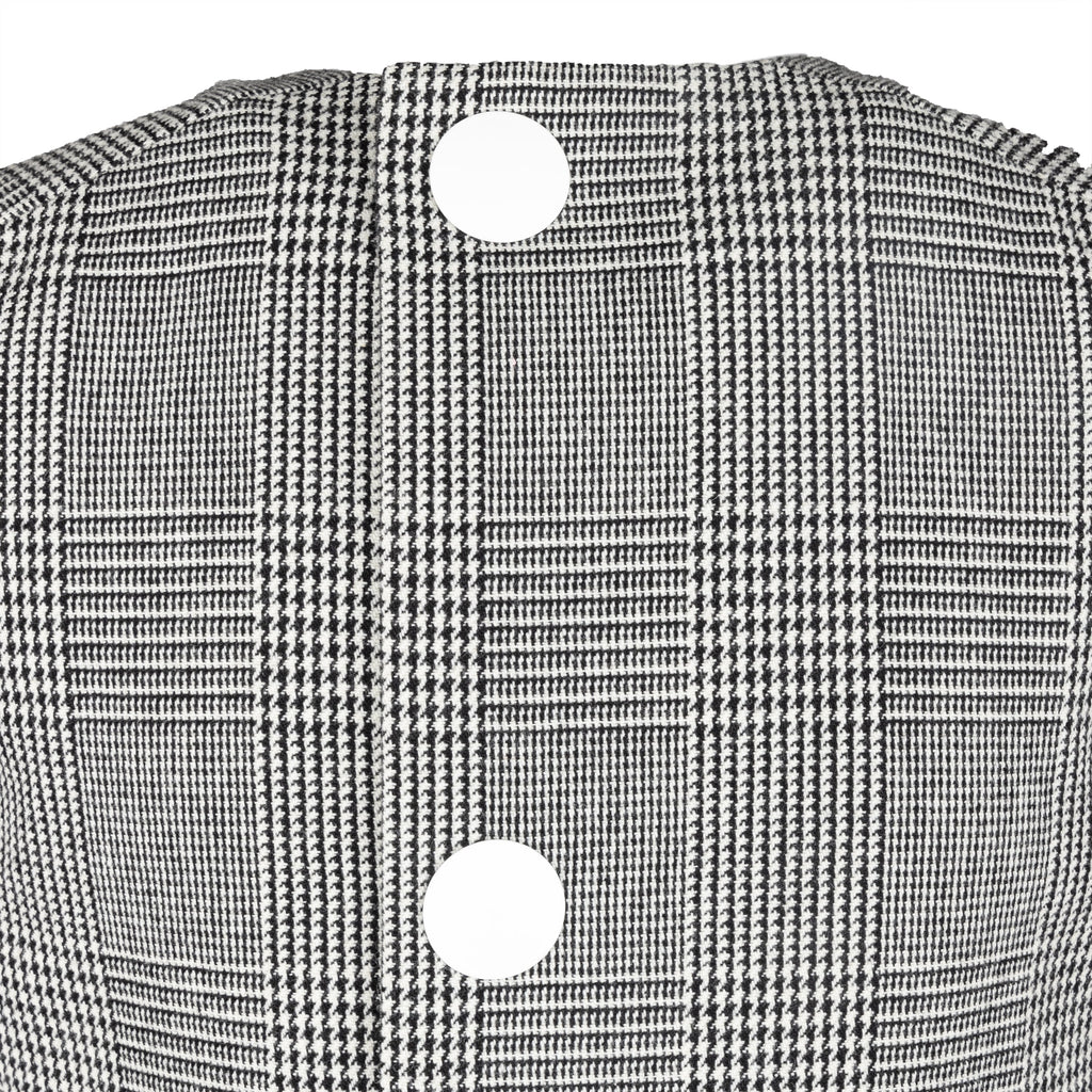Expertly crafted with prince of Wales checkered pattern in classic black and white, this Marni peplum top is sleeveless with a round neck. The peplum cut accentuates your waist while the back button closure adds a touch of elegance with two white buttons.
