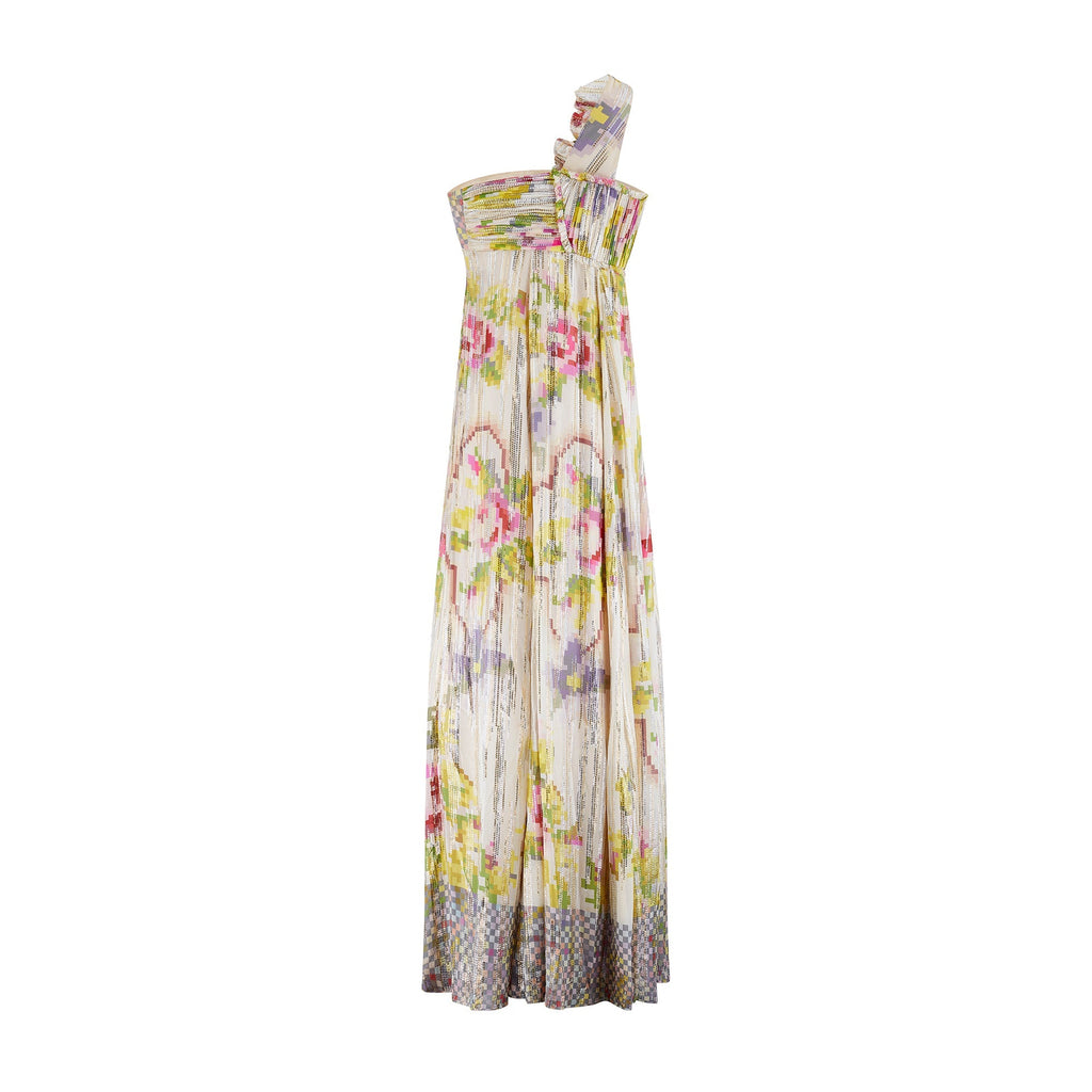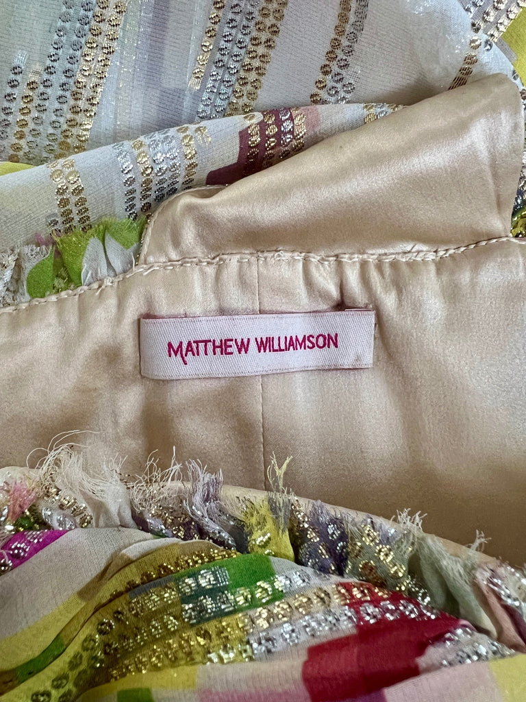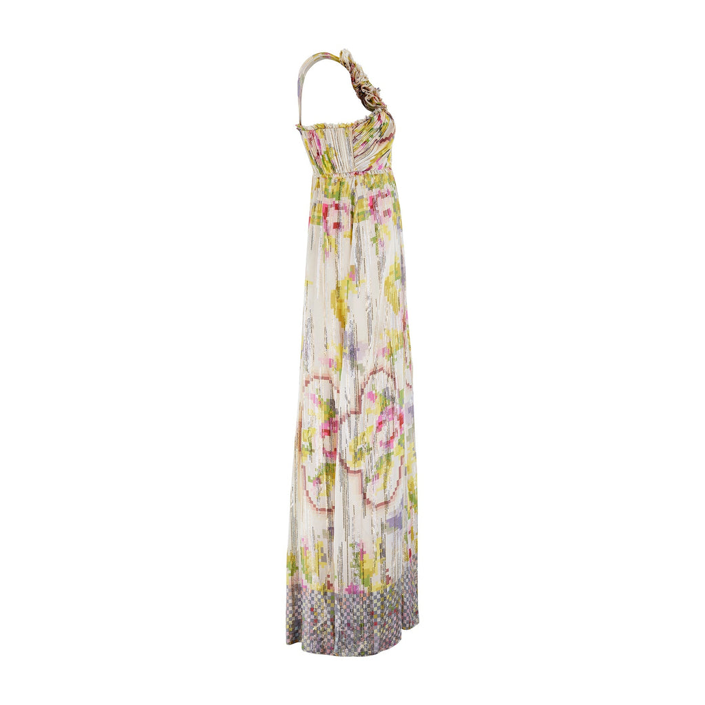 This dress walked the finale on the runway as part of Matthew Williamson’s Fall 2008 collection and was the very last Look of the presentation. The designer said, “I had a vision of a girl in the depths of the countryside, rustic and earthy.” This maxi-length gown is tailored from a flamboyant silk adorned with the geometric floral prints that the designer did so well. A flowing champagne silk with a hint of stretch, the print is of vibrant fuchsia roses and pistachio green leaves. Described by Vogue as “the faded wallpaper you’d find in a cozy cottage”, the designer has updated it from the 21st century by pixelating it. This digital print adds a contemporary feel and was popular during the late-noughties. The cloth is finished with tiny circles of metallic thread in gold and silver that form jagged stripes across the fabric, and many of the hems are left raw. The dress has a one-shoulder empire cut and is decadently gathered across the shoulder, with plumes of fabric gathered at the chest. The bust is adorned with five roses crafted from the same fabric with prettily frayed edges. The dress falls to the floor with cascading plumes of silk. Inside, the dress is lined with nude satin. An internal corset with a padded chest fastens with three rows of hook-and-eye clasps along the side. The dress fastens under the arm with a hidden tonal zip and hook-and-eye clasp.