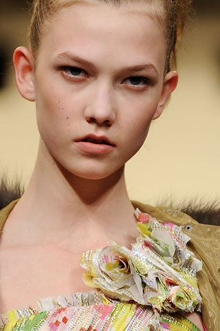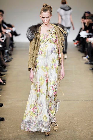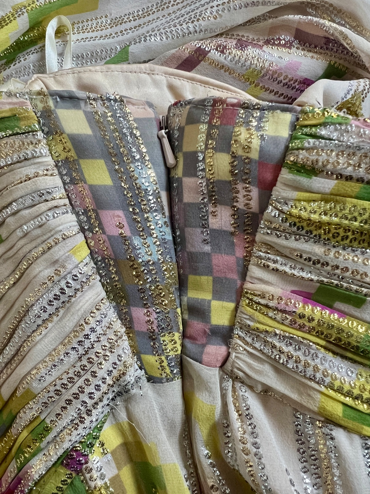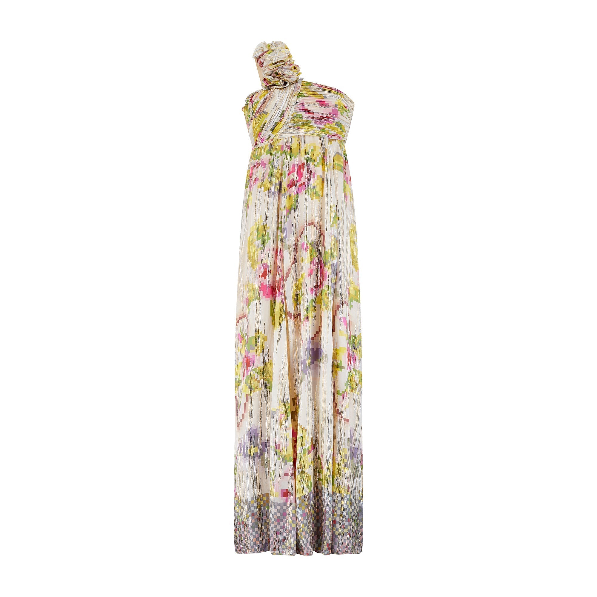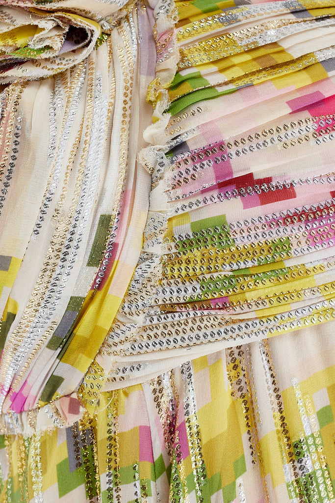 This dress walked the finale on the runway as part of Matthew Williamson’s Fall 2008 collection and was the very last Look of the presentation. The designer said, “I had a vision of a girl in the depths of the countryside, rustic and earthy.” This maxi-length gown is tailored from a flamboyant silk adorned with the geometric floral prints that the designer did so well. A flowing champagne silk with a hint of stretch, the print is of vibrant fuchsia roses and pistachio green leaves. Described by Vogue as “the faded wallpaper you’d find in a cozy cottage”, the designer has updated it from the 21st century by pixelating it. This digital print adds a contemporary feel and was popular during the late-noughties. The cloth is finished with tiny circles of metallic thread in gold and silver that form jagged stripes across the fabric, and many of the hems are left raw. The dress has a one-shoulder empire cut and is decadently gathered across the shoulder, with plumes of fabric gathered at the chest. The bust is adorned with five roses crafted from the same fabric with prettily frayed edges. The dress falls to the floor with cascading plumes of silk. Inside, the dress is lined with nude satin. An internal corset with a padded chest fastens with three rows of hook-and-eye clasps along the side. The dress fastens under the arm with a hidden tonal zip and hook-and-eye clasp.