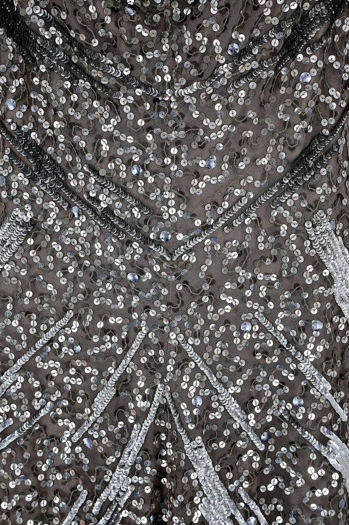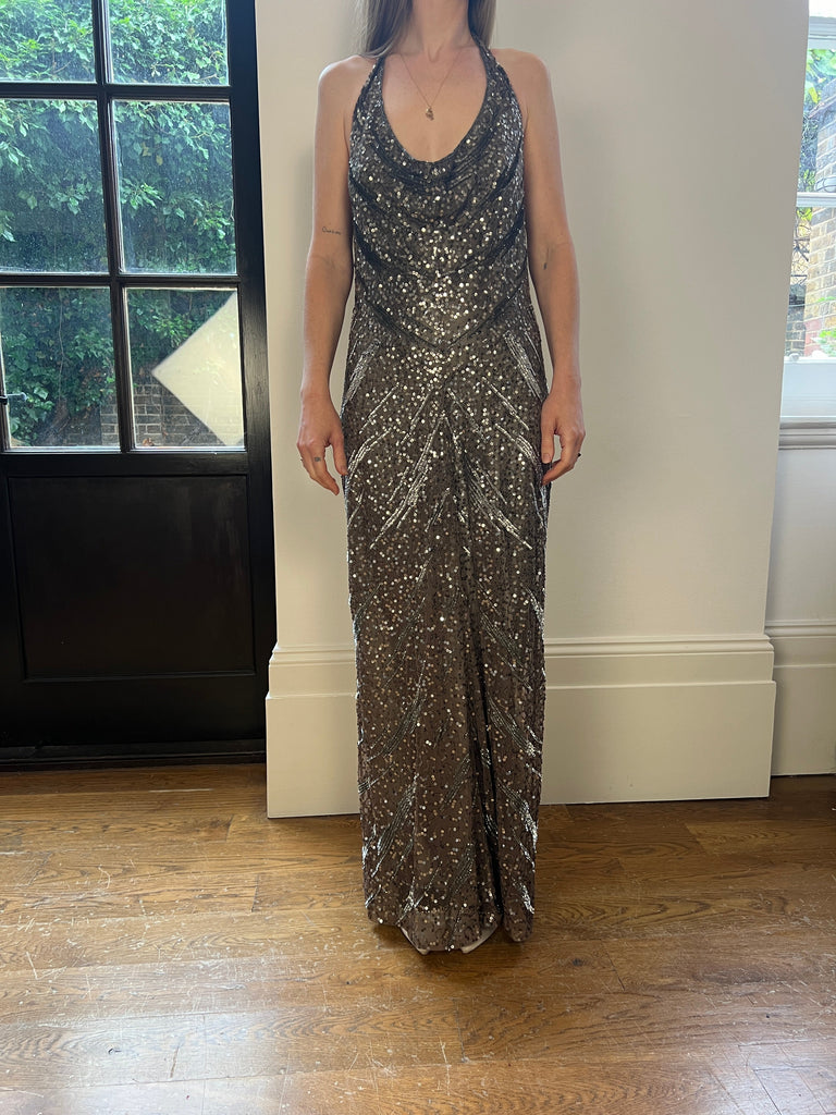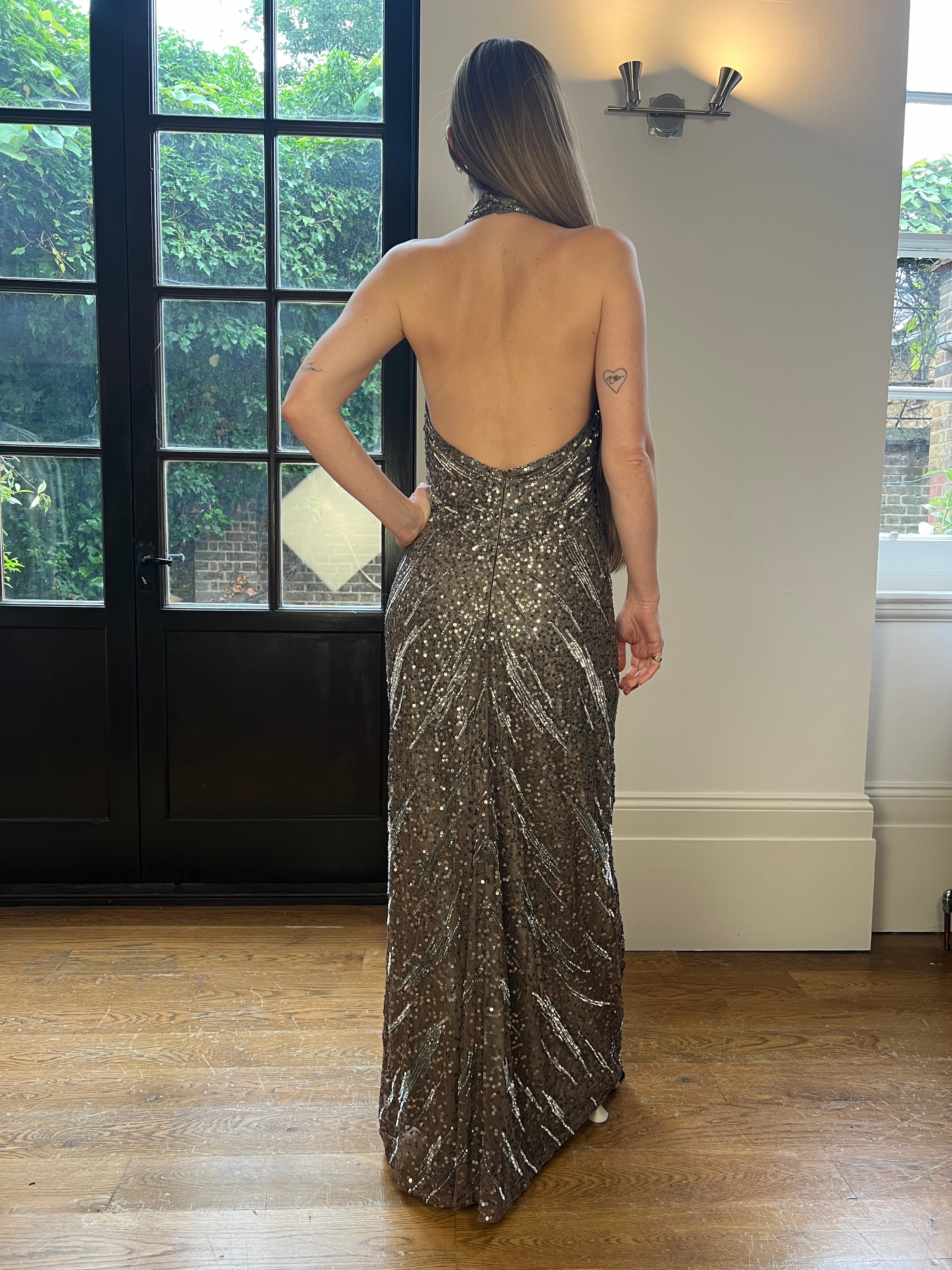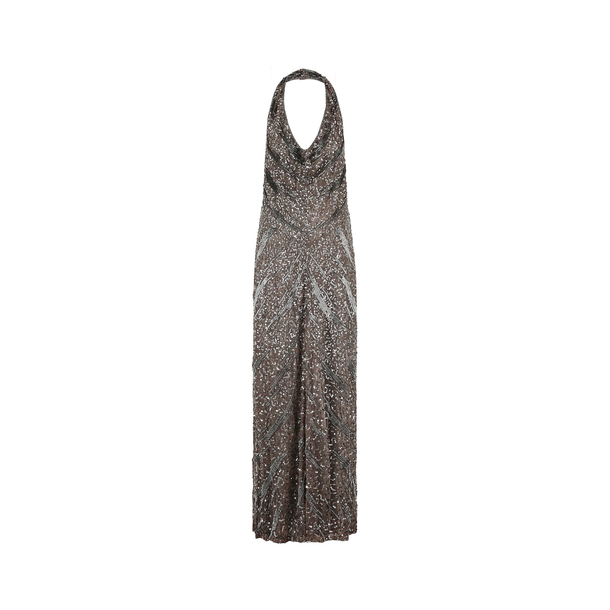 You're sure to turn eyes wearing this Max Mara evening gown, circa 2006-2007, just in time for the holiday and awards season. This showstopper of a dress reflects the 2000s Max Mara aesthetic and perfectly encapsulates the 'quiet luxury' trend for timeless investment pieces. It is entirely embellished by hand and adorned allover with 2 types of metallic sequins onto a warm grey mesh. The satin finish lining is visible through the mesh and together with the magnificent arrangement of sequins, provides an elegant multidimensional finish to the dress. A plunging, but not distasteful, halter top secures the dress around the wear's neck for a party ready look. An invisible zipper closes at the middle back of the dress.