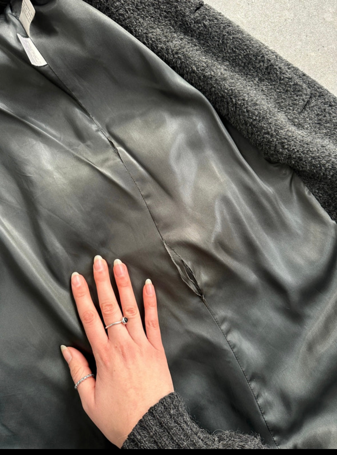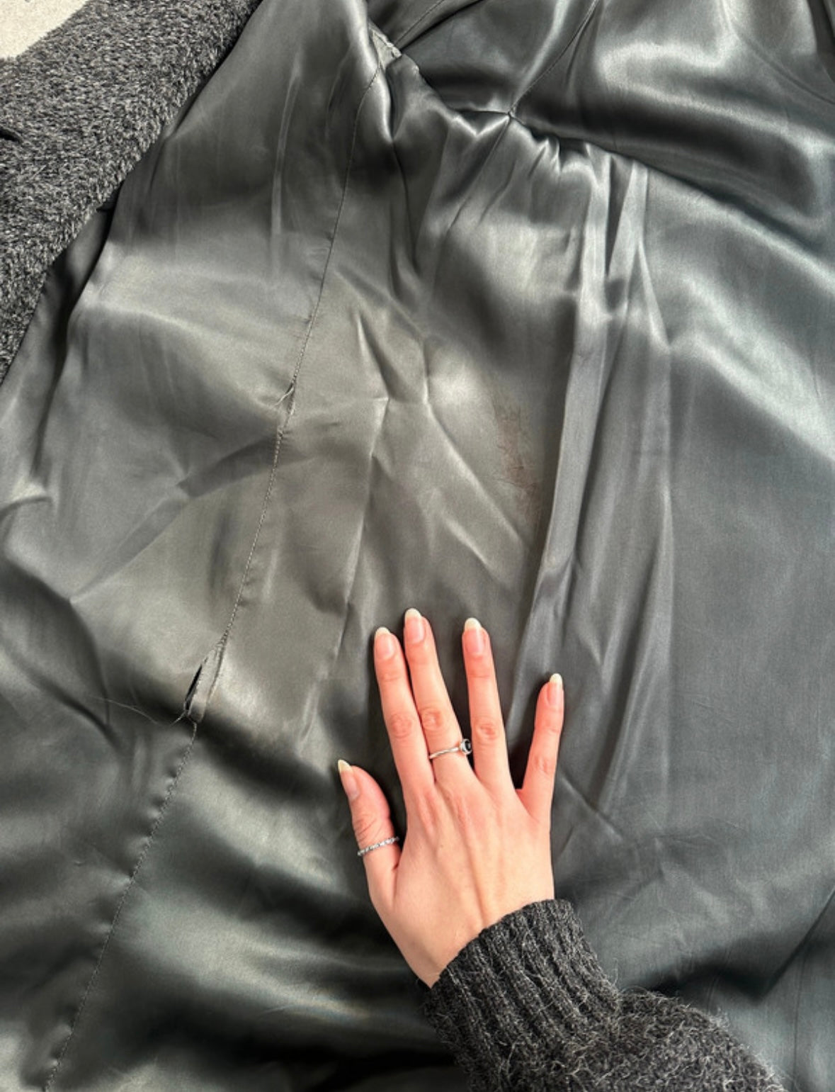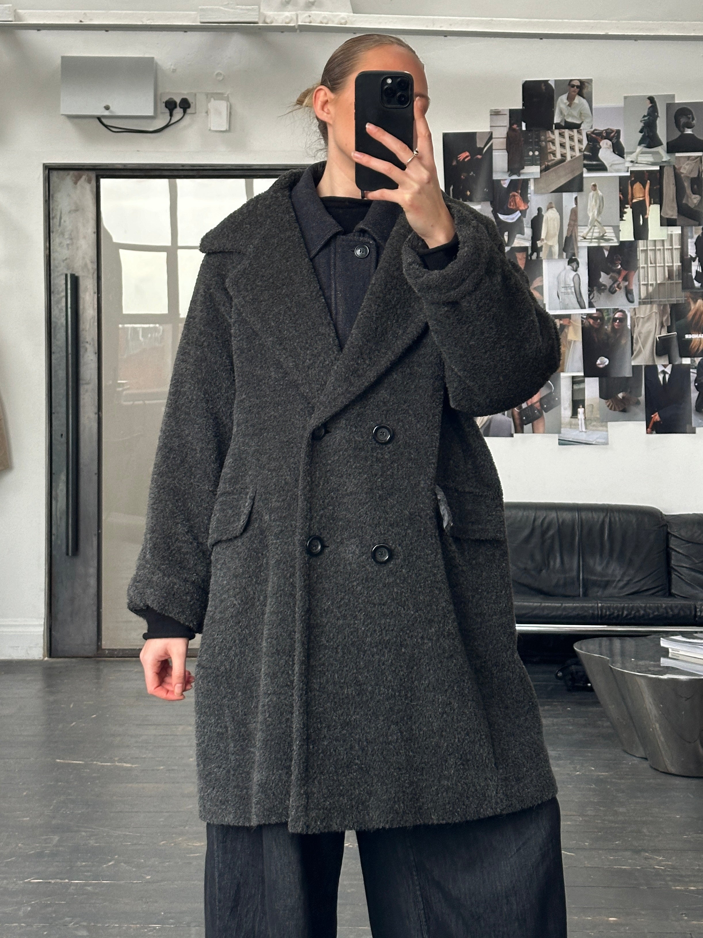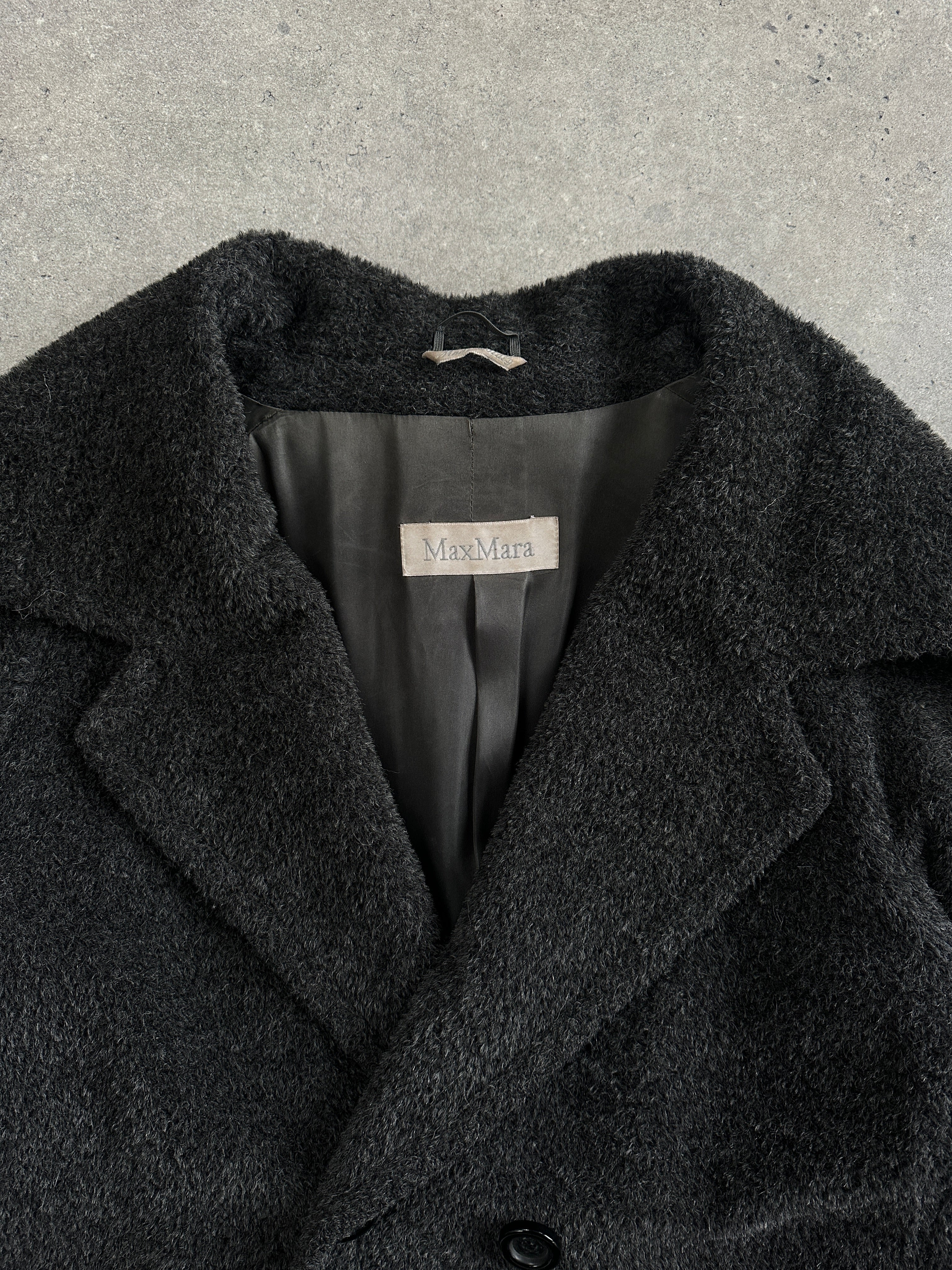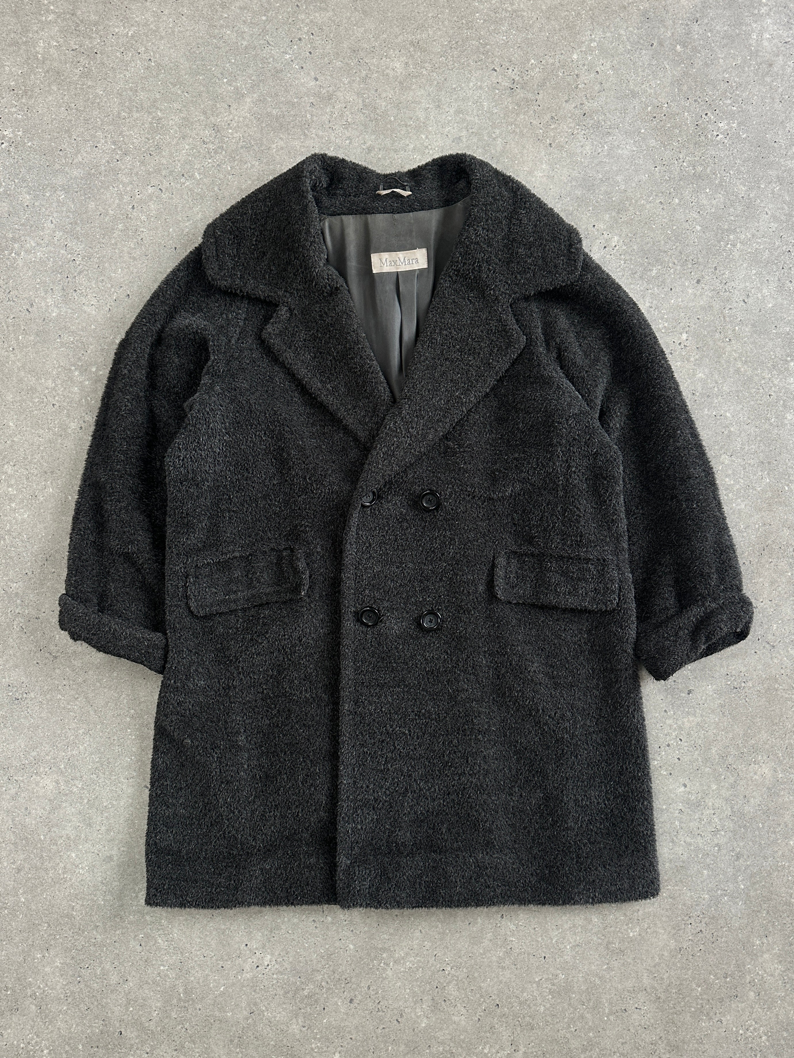 A softly structured vintage 1990s Max Mara coat in a charcoal grey tone, crafted in a plush alpaca-blend with a relaxed, cocoon-like drape. Designed with a double breasted front, subtle shoulder structure and turned-up cuffs.