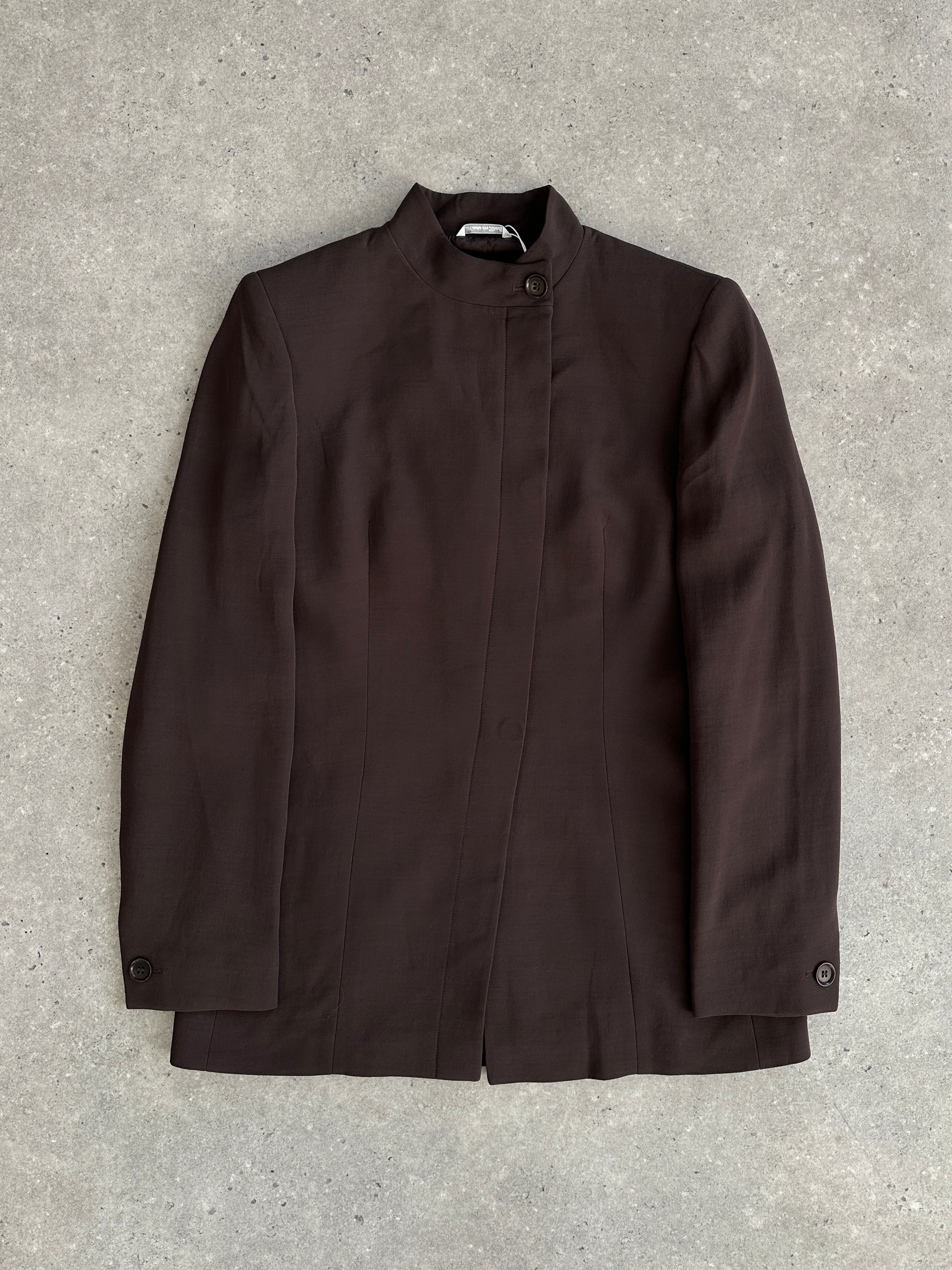 Max Mara 2000s tailored blazer featuring a high stand collar, concealed plackey and vertical dart seams for a streamlined asymmetrical silhouette.