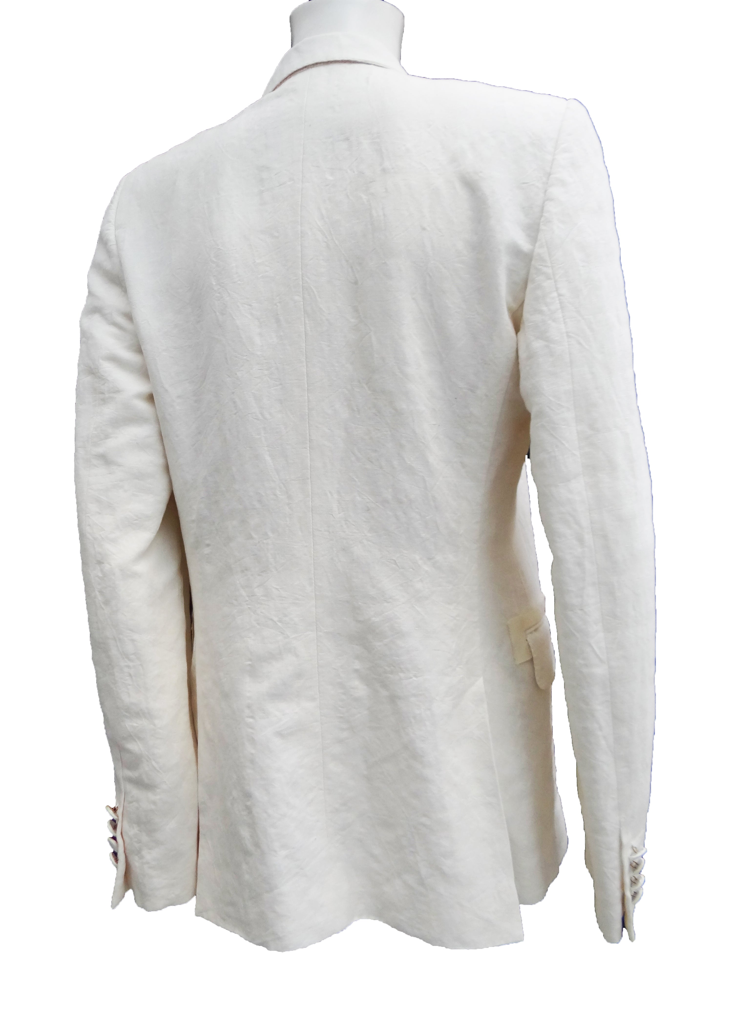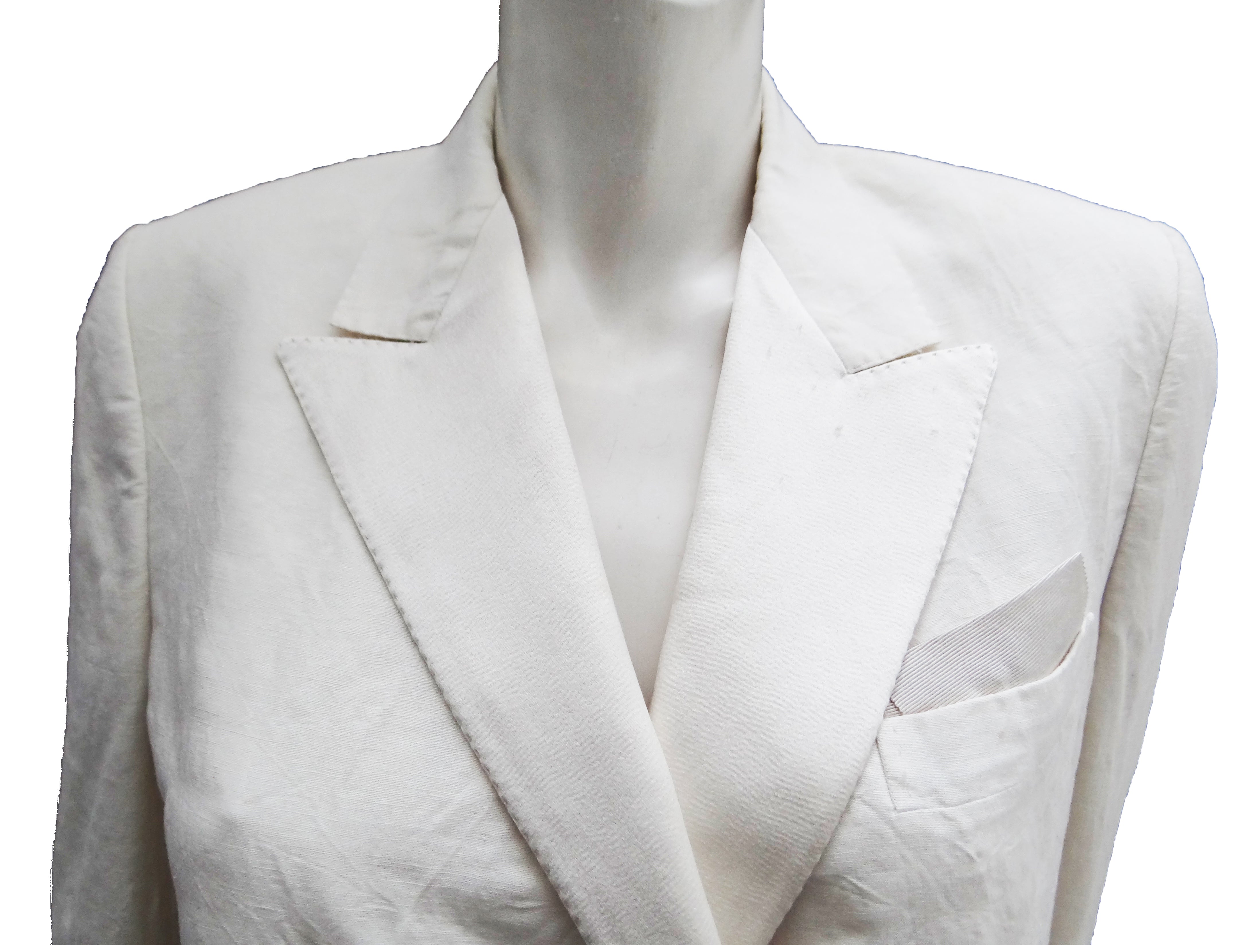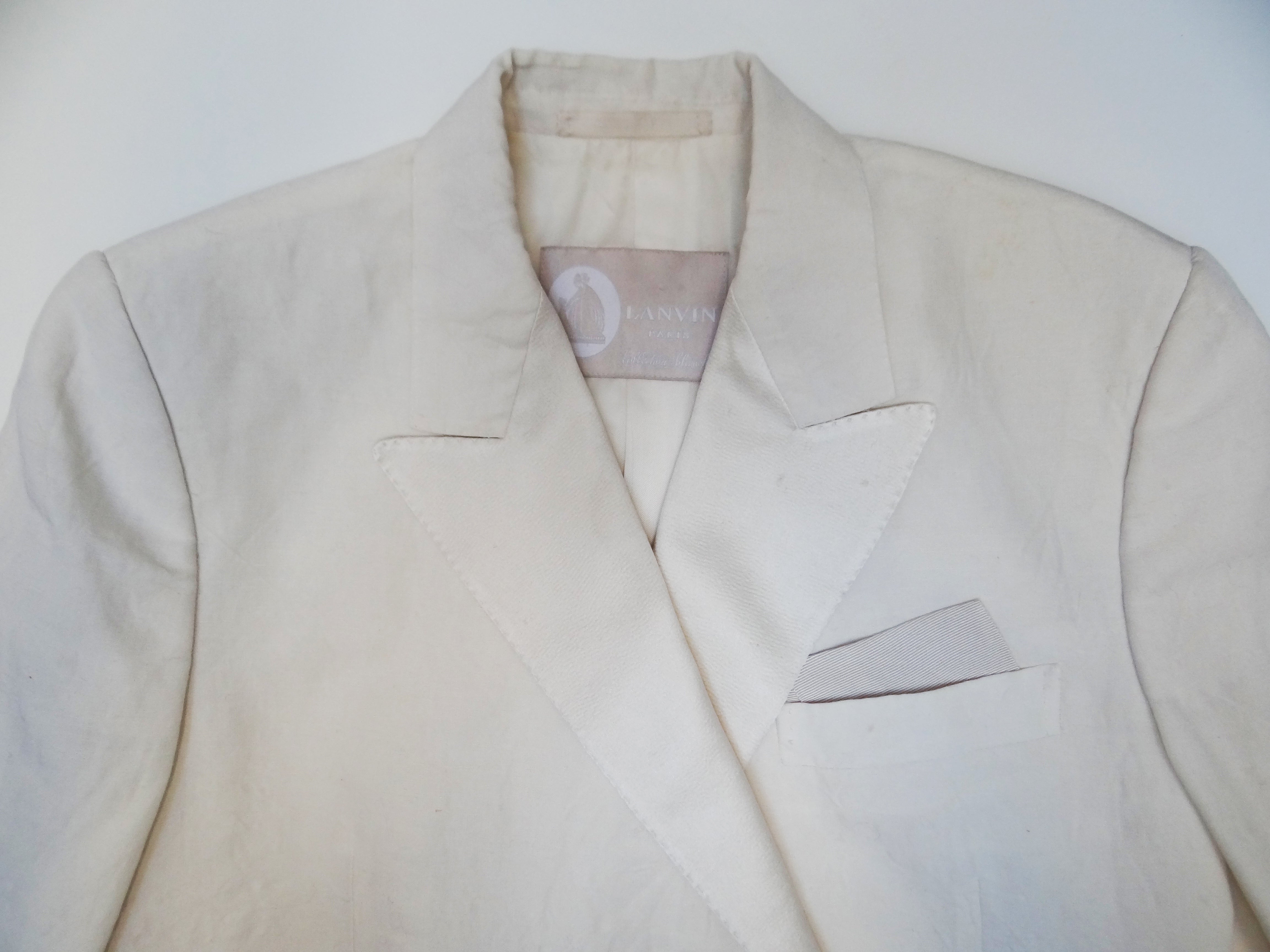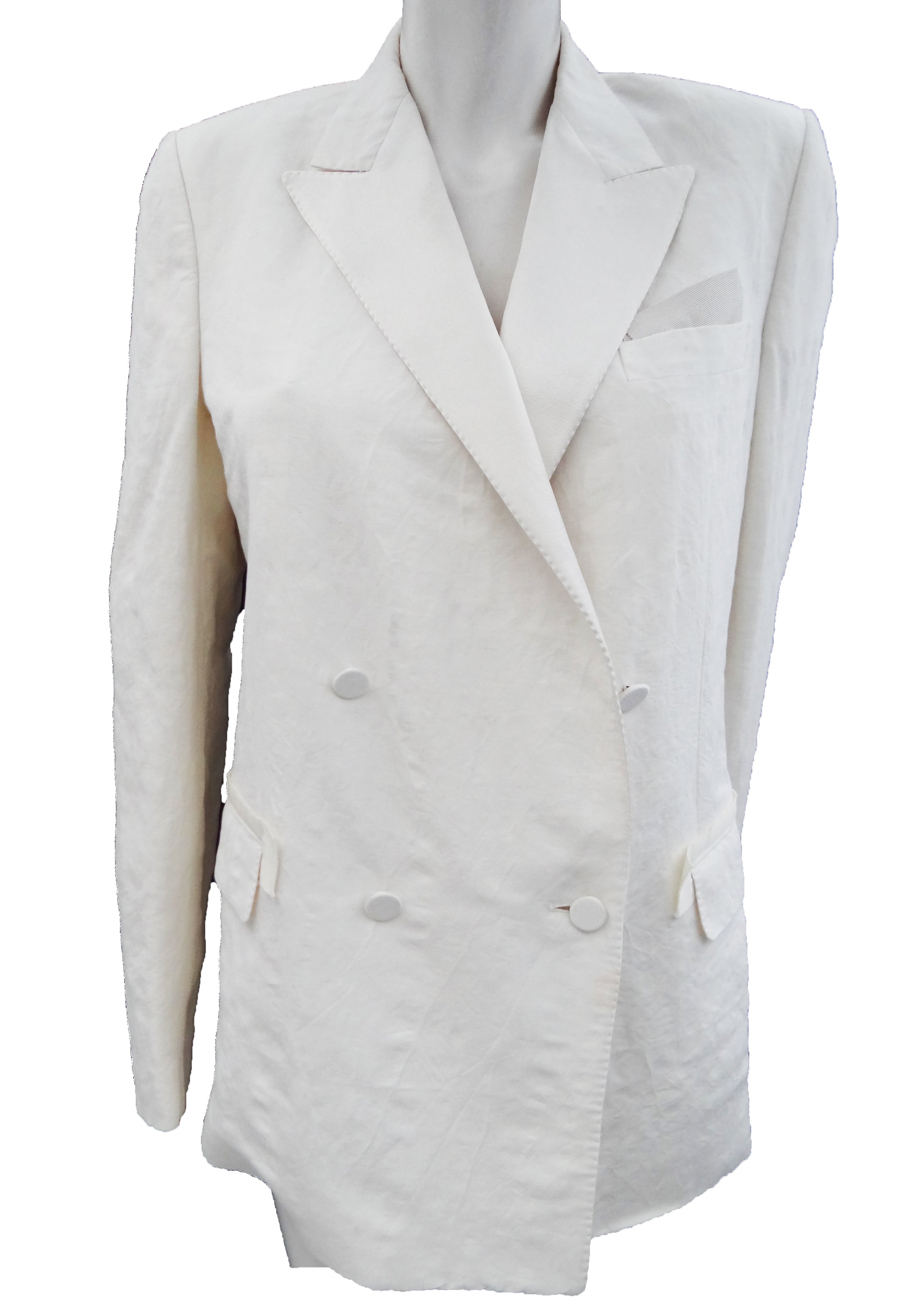 A glamorous tailored double breasted tuxedo in ivory crushed linen and cotton, by Lanvin. It is a square cut jacket, with 4 covered buttons, notched satin effect lapels, and 4 covered buttons on the sleeves. It has flat pockets with matching faille trim, and breast pocket with matching faille faux handkerchief. Hip length, fully lined. A fabulous look for a wedding.