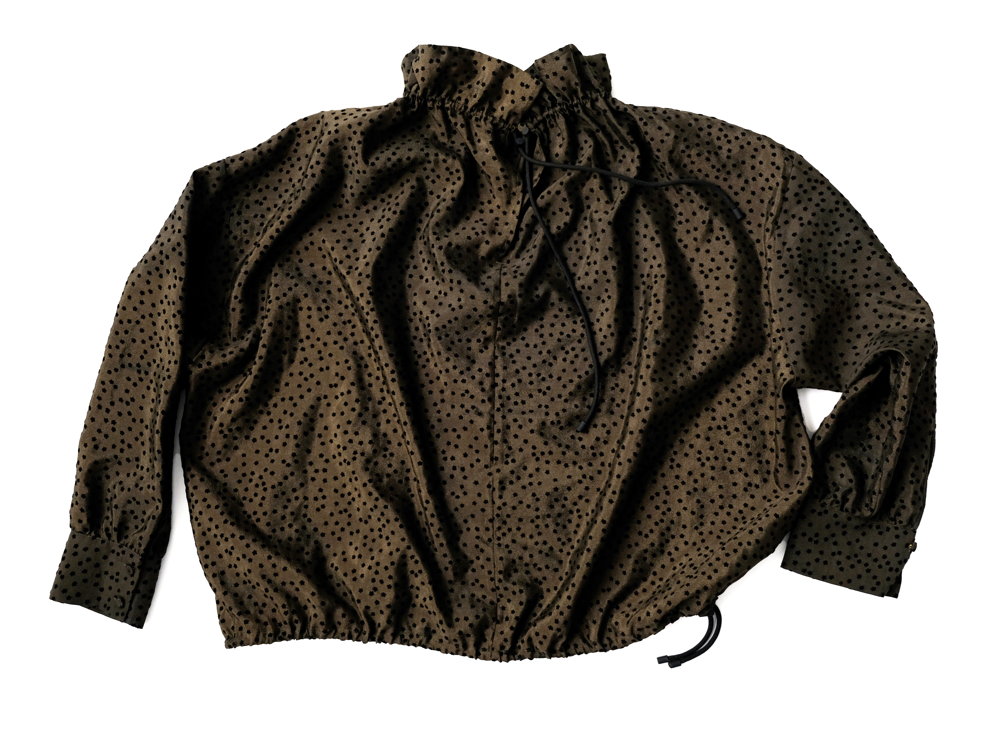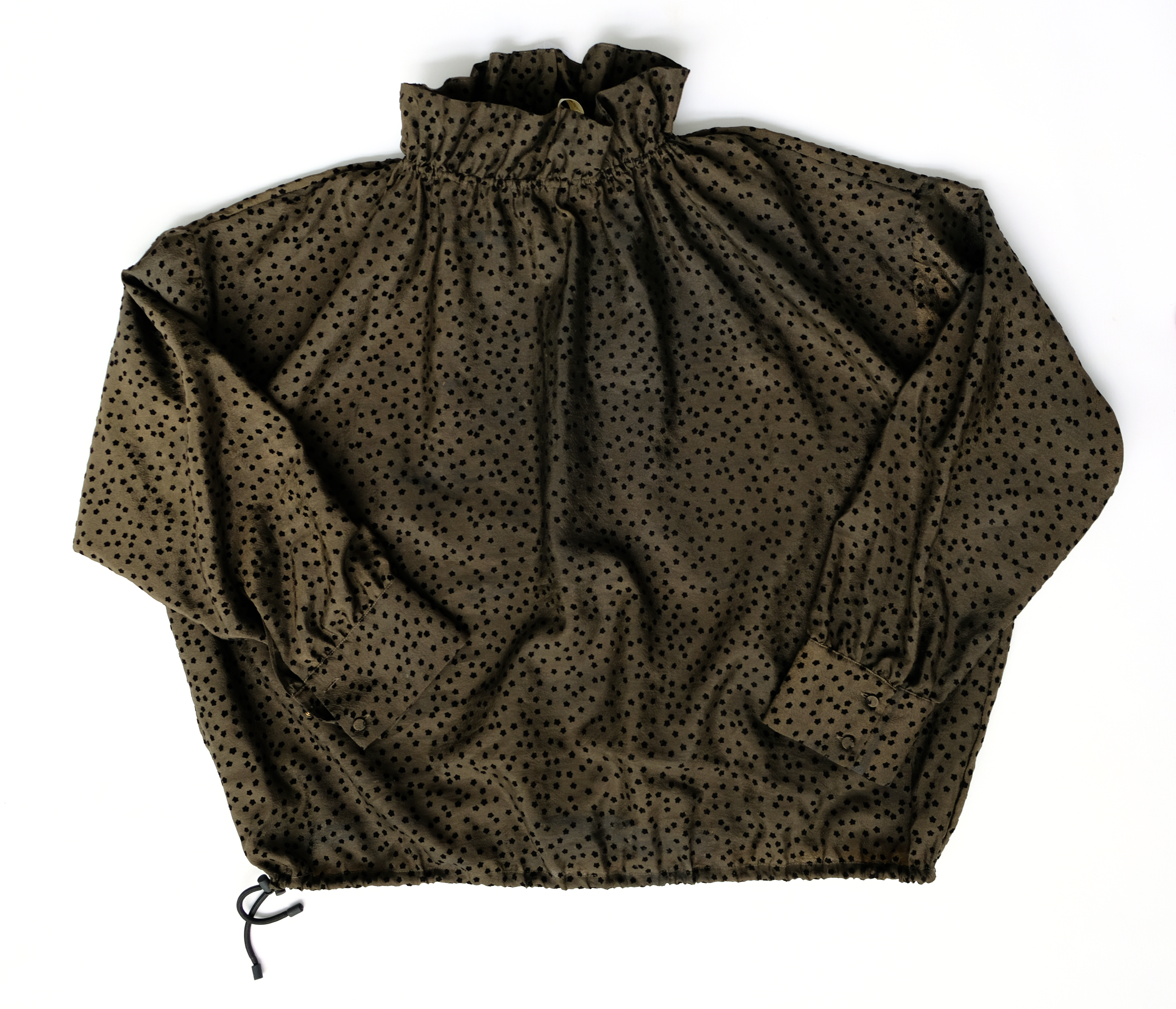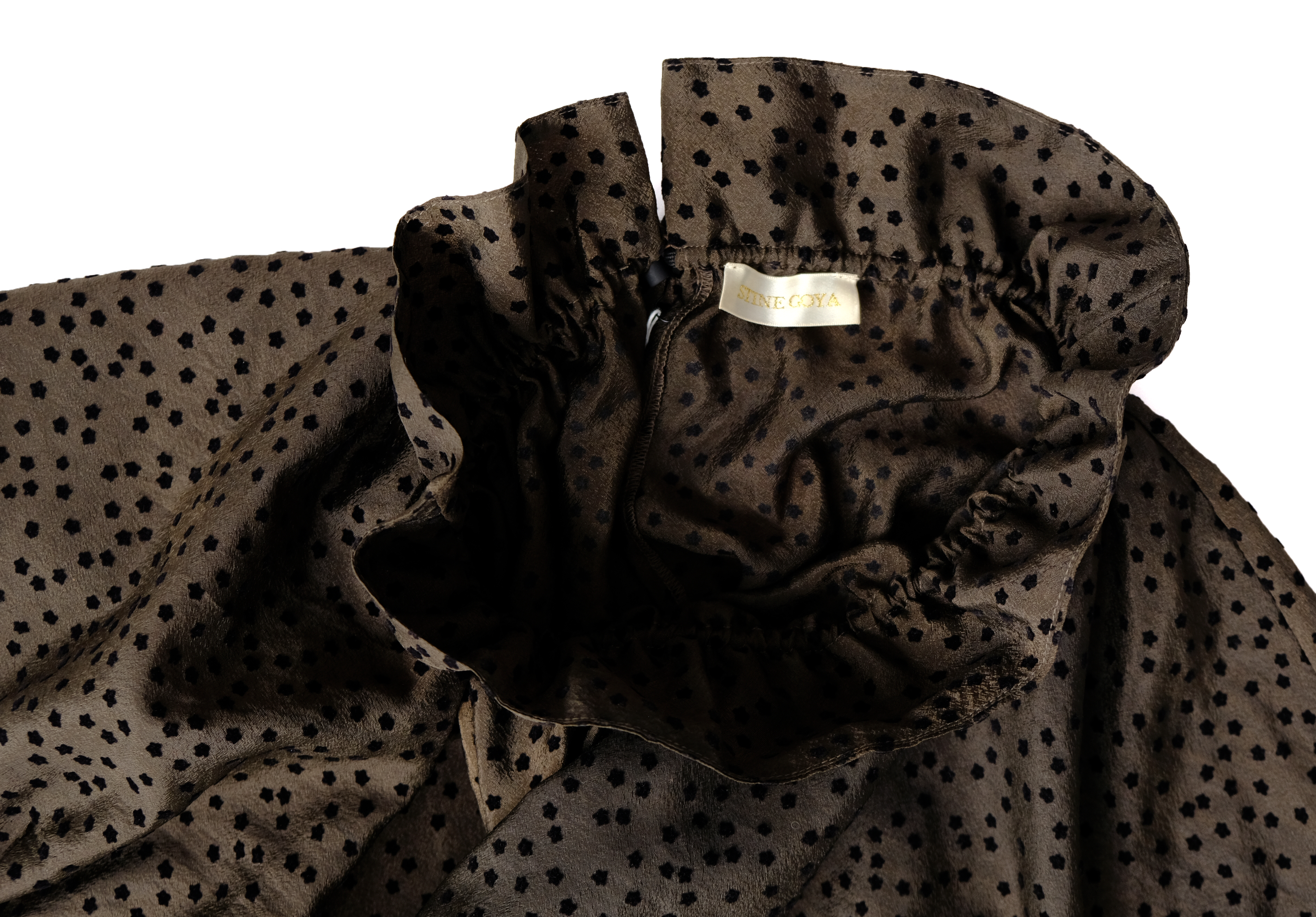 An interesting blouse by Stine Goya, in fine dark greenish brown fabric with metallic sheen, scattered with tiny black velvet stars.