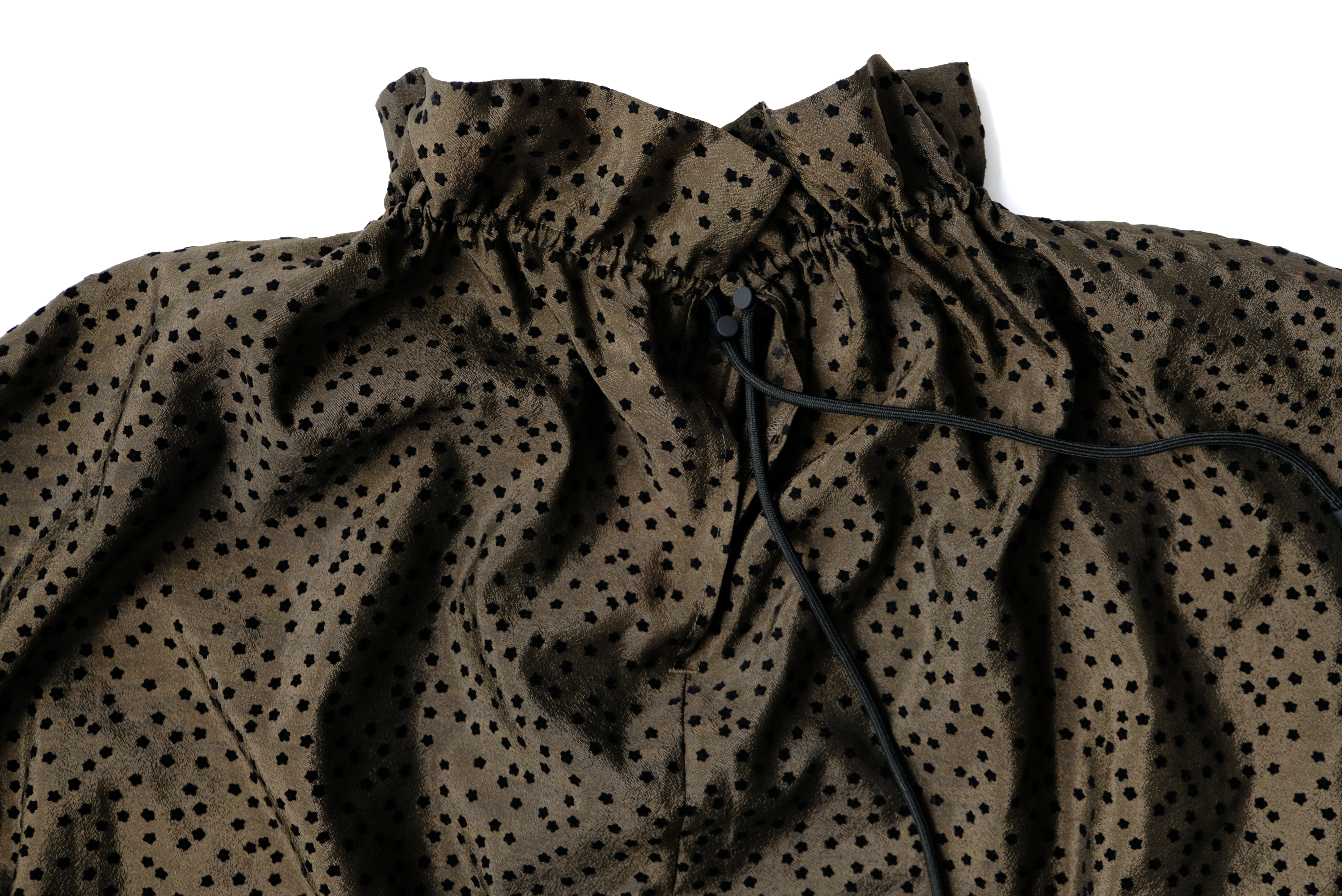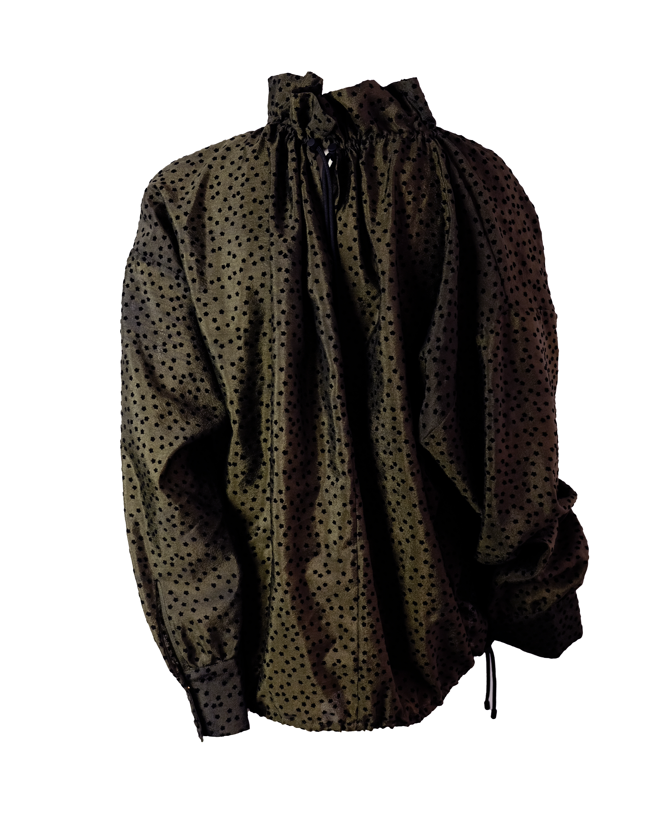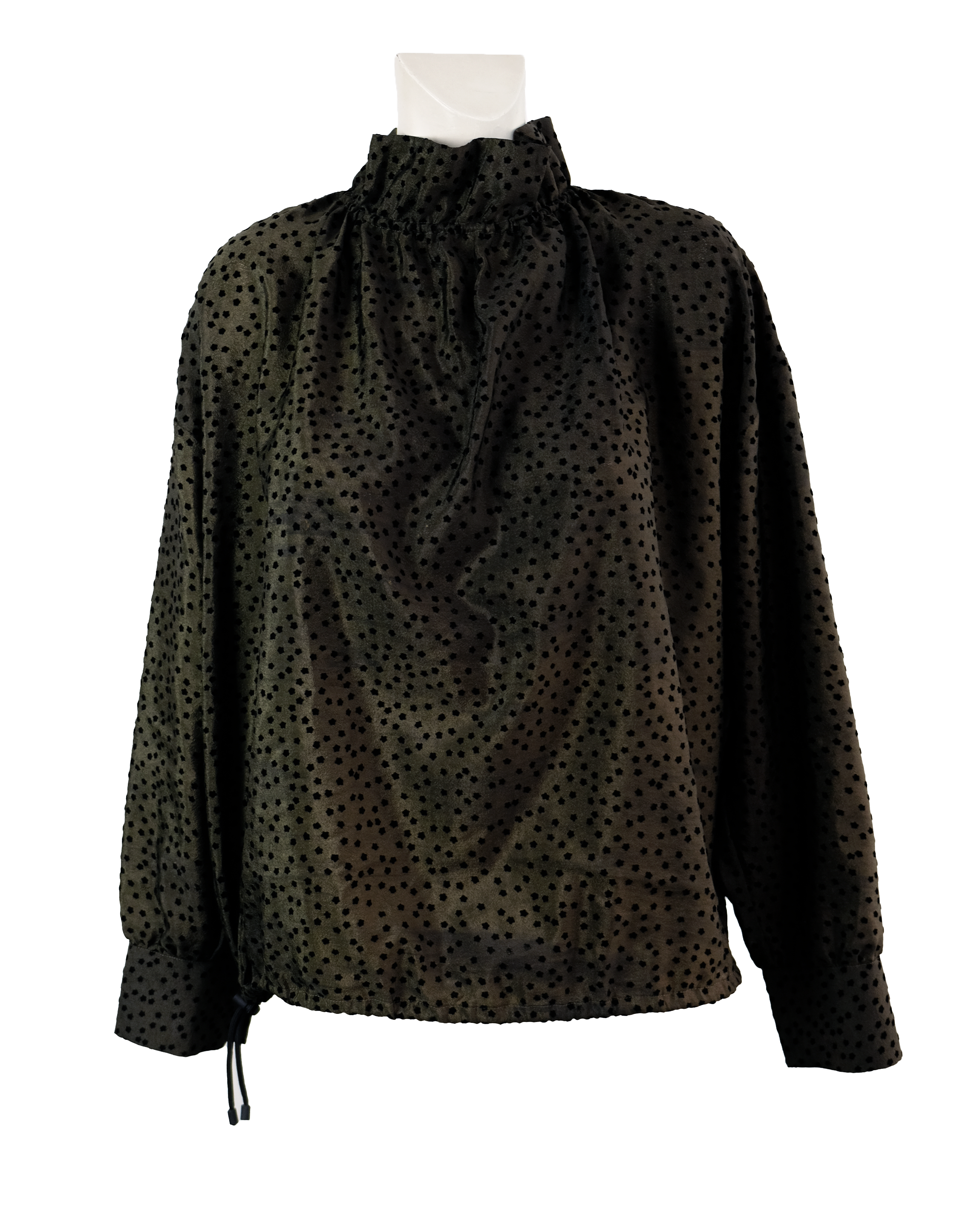 An interesting blouse by Stine Goya, in fine dark greenish brown fabric with metallic sheen, scattered with tiny black velvet stars.