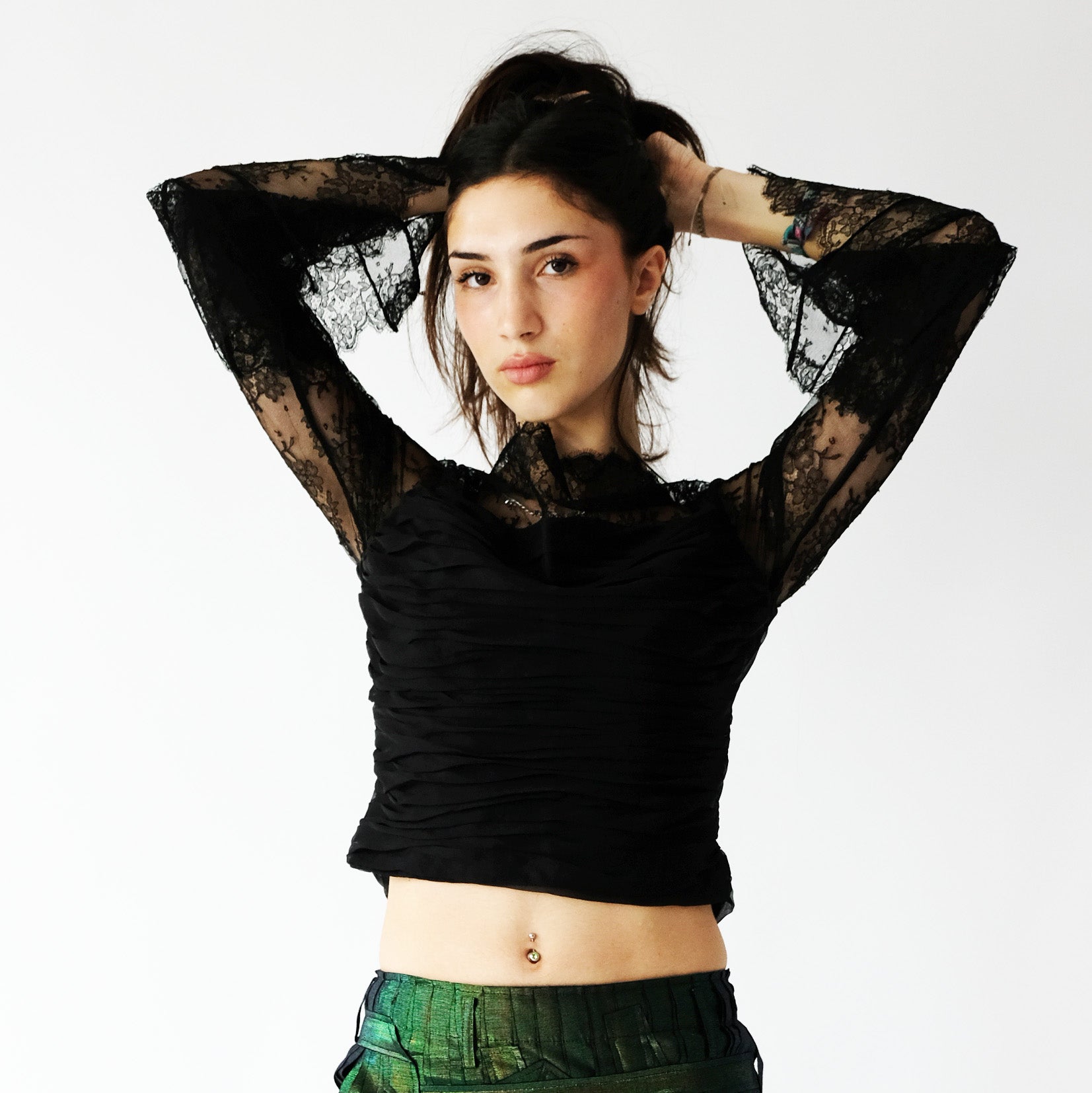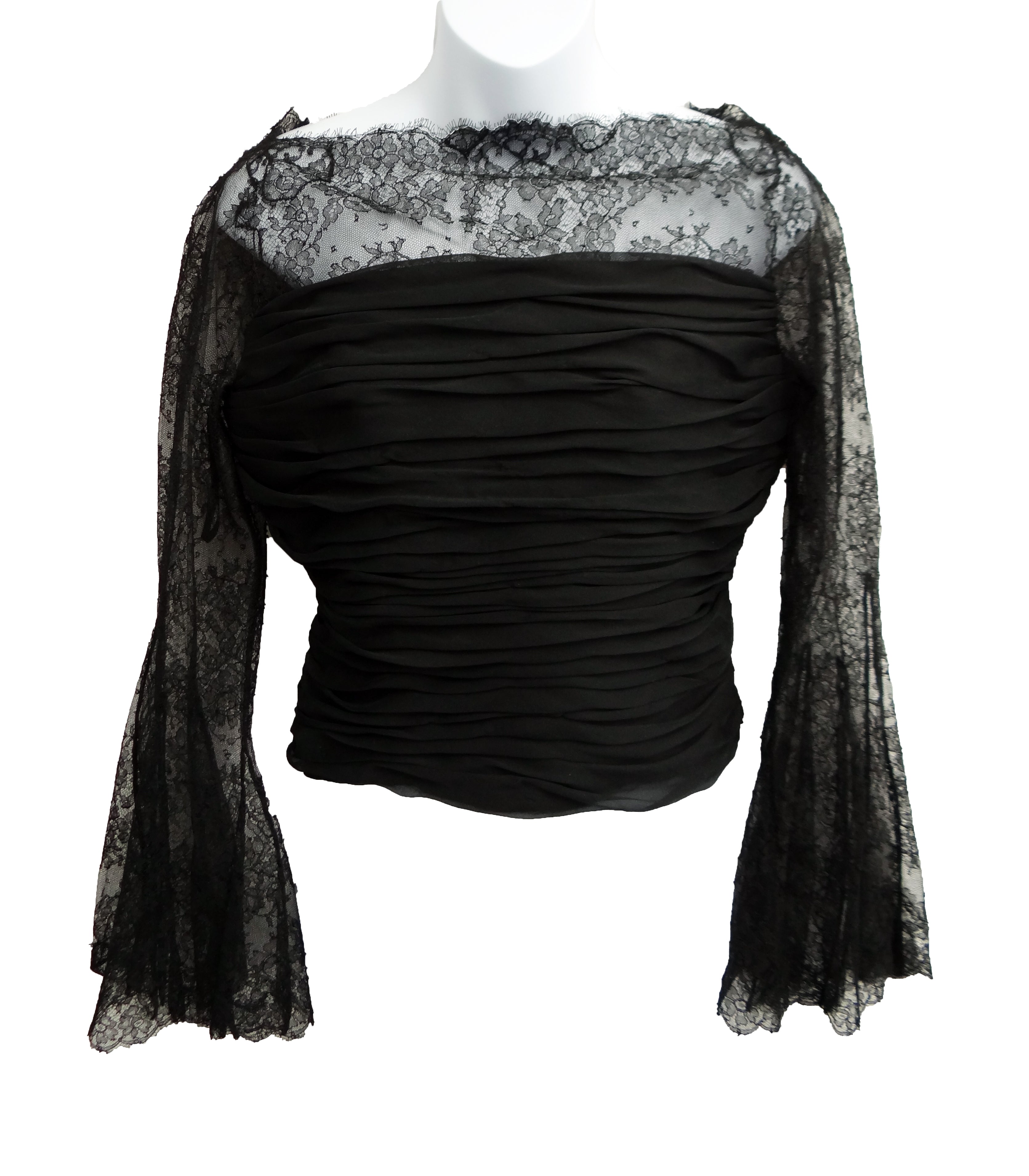 A sensational evening top in fine black lace, with a body of ruched silk, by Valentino.