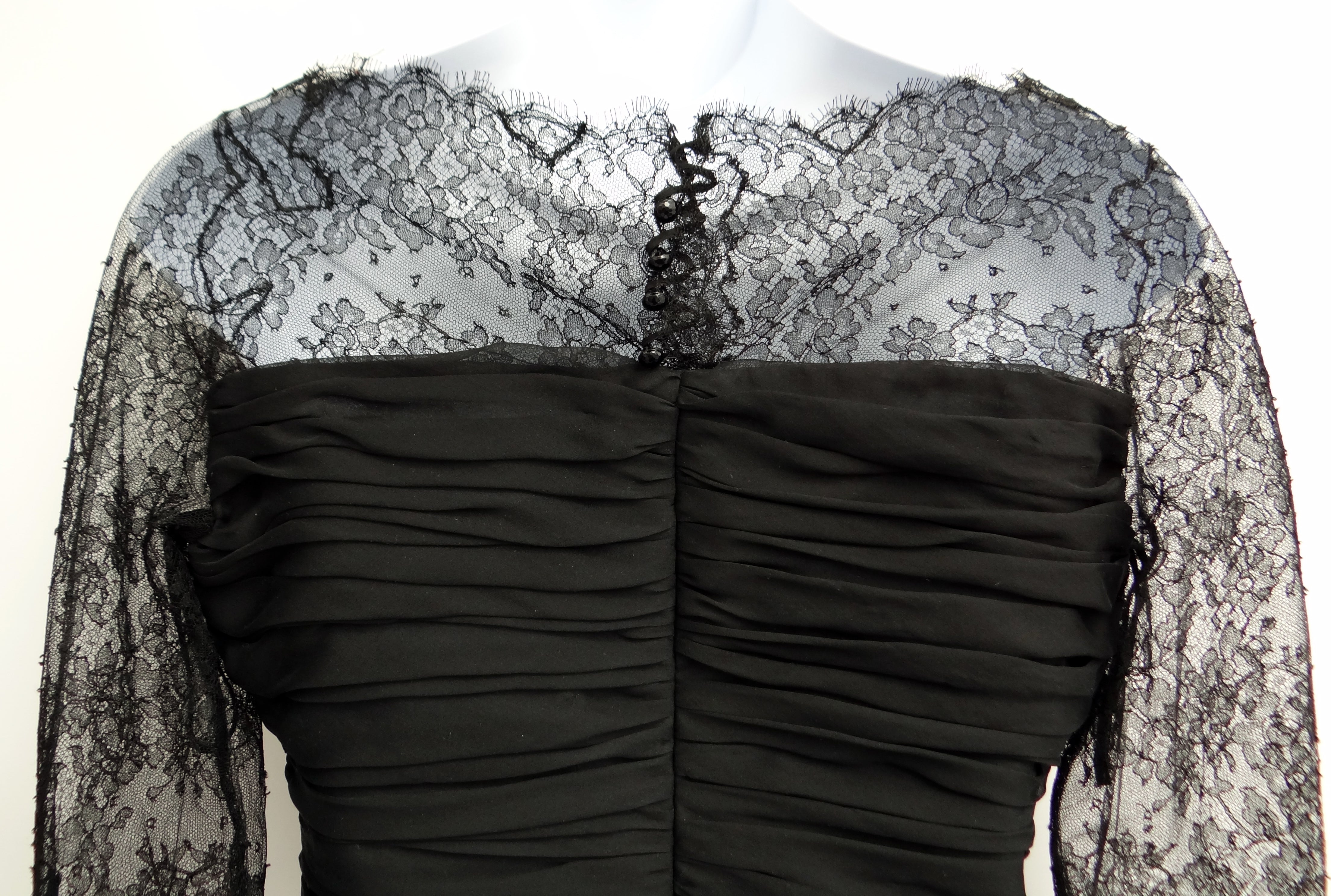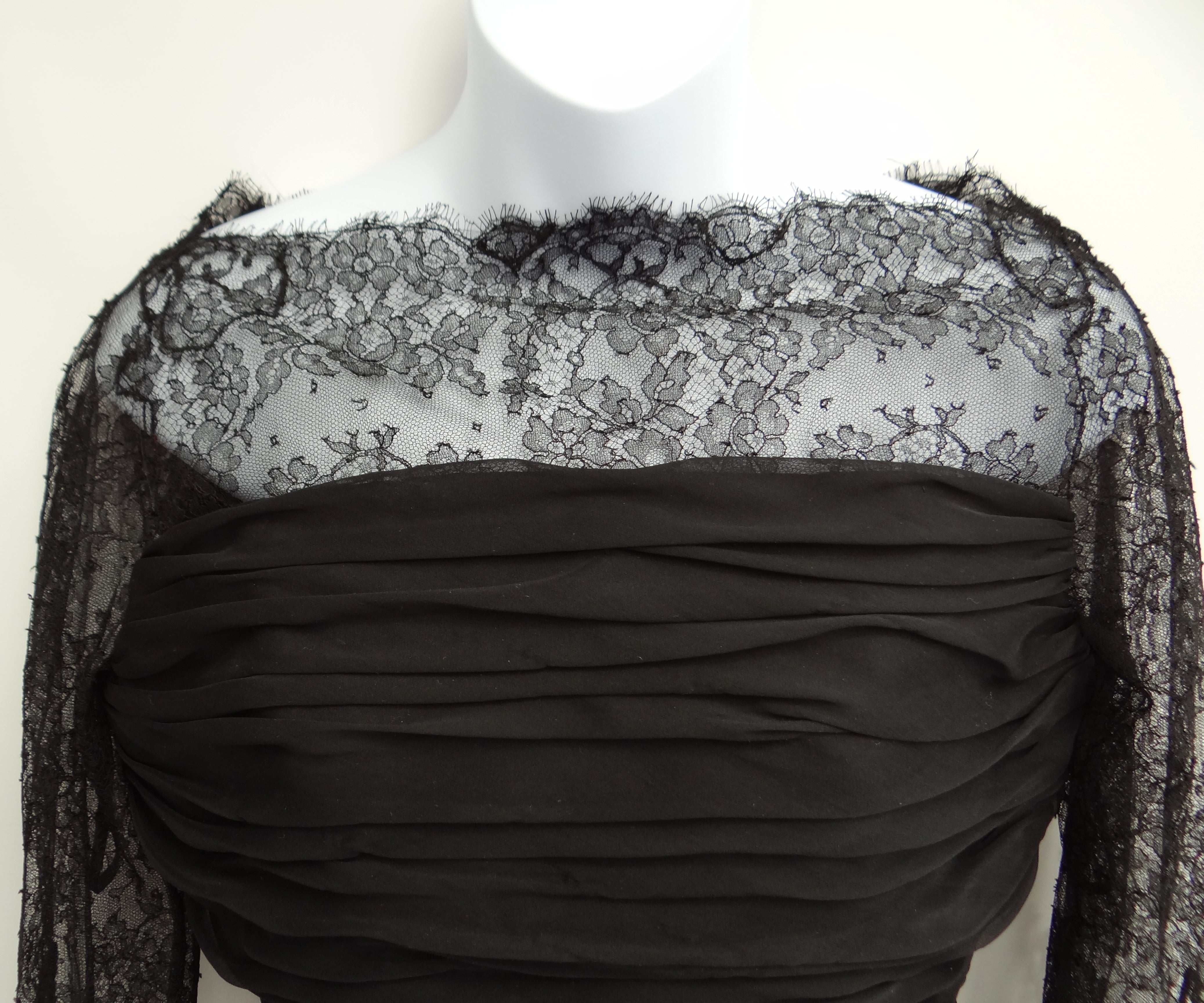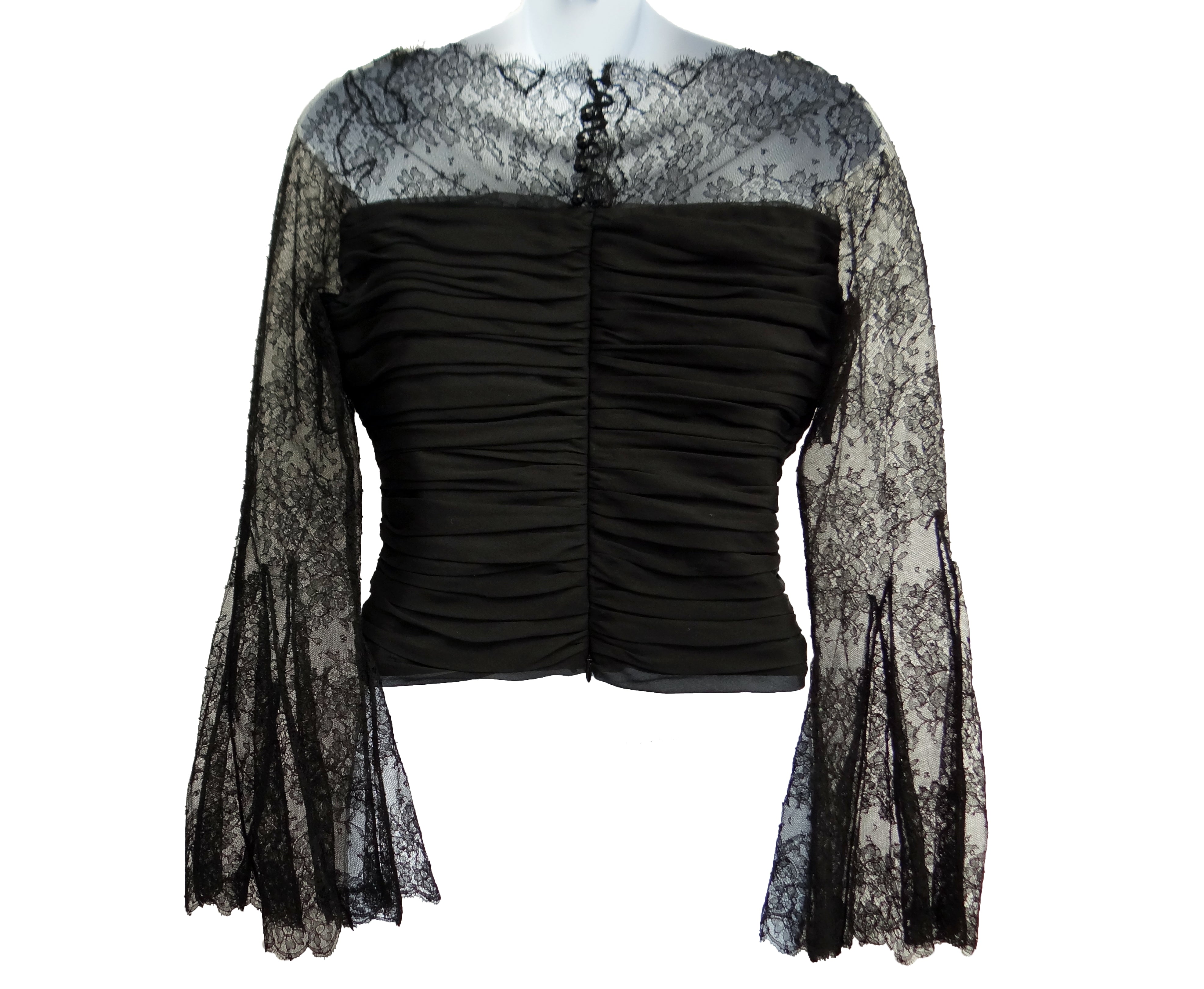 It has a scalloped high slash neck and long fluted sleeves made of delicate Chantilly lace. It gathers around the body in a fitted bodice of ruched black silk, fastening with a hidden zip and delicate buttons at the back.