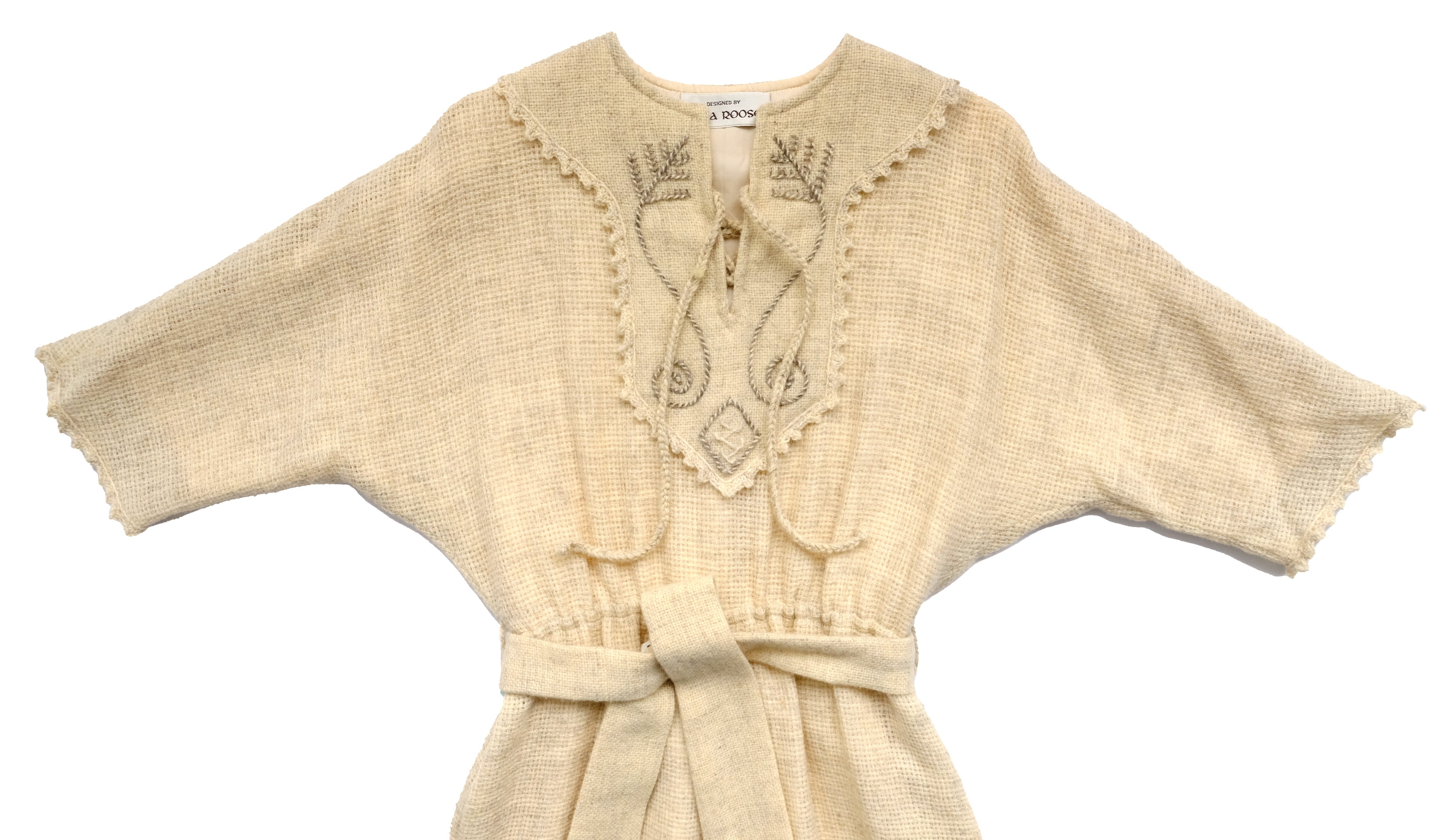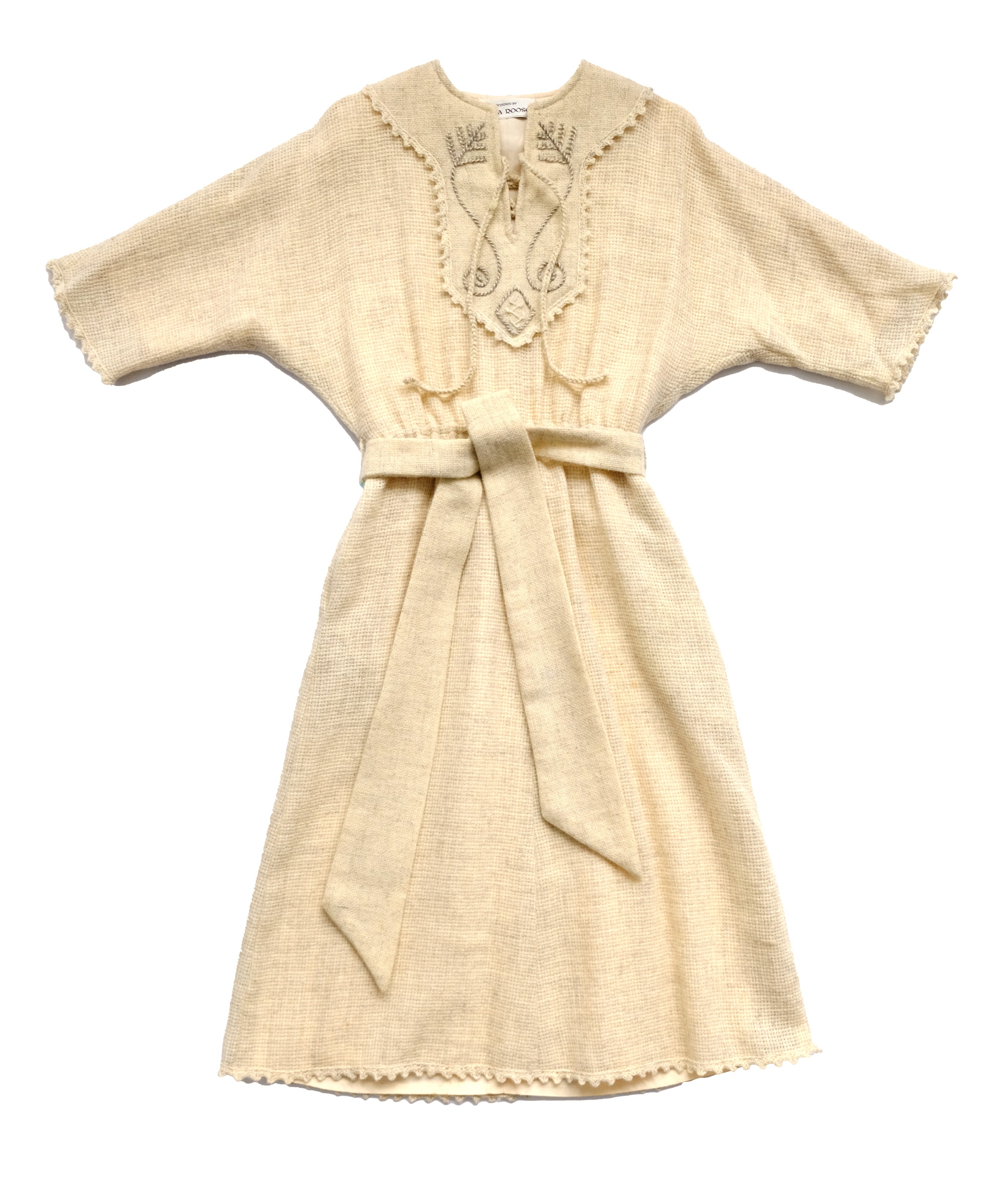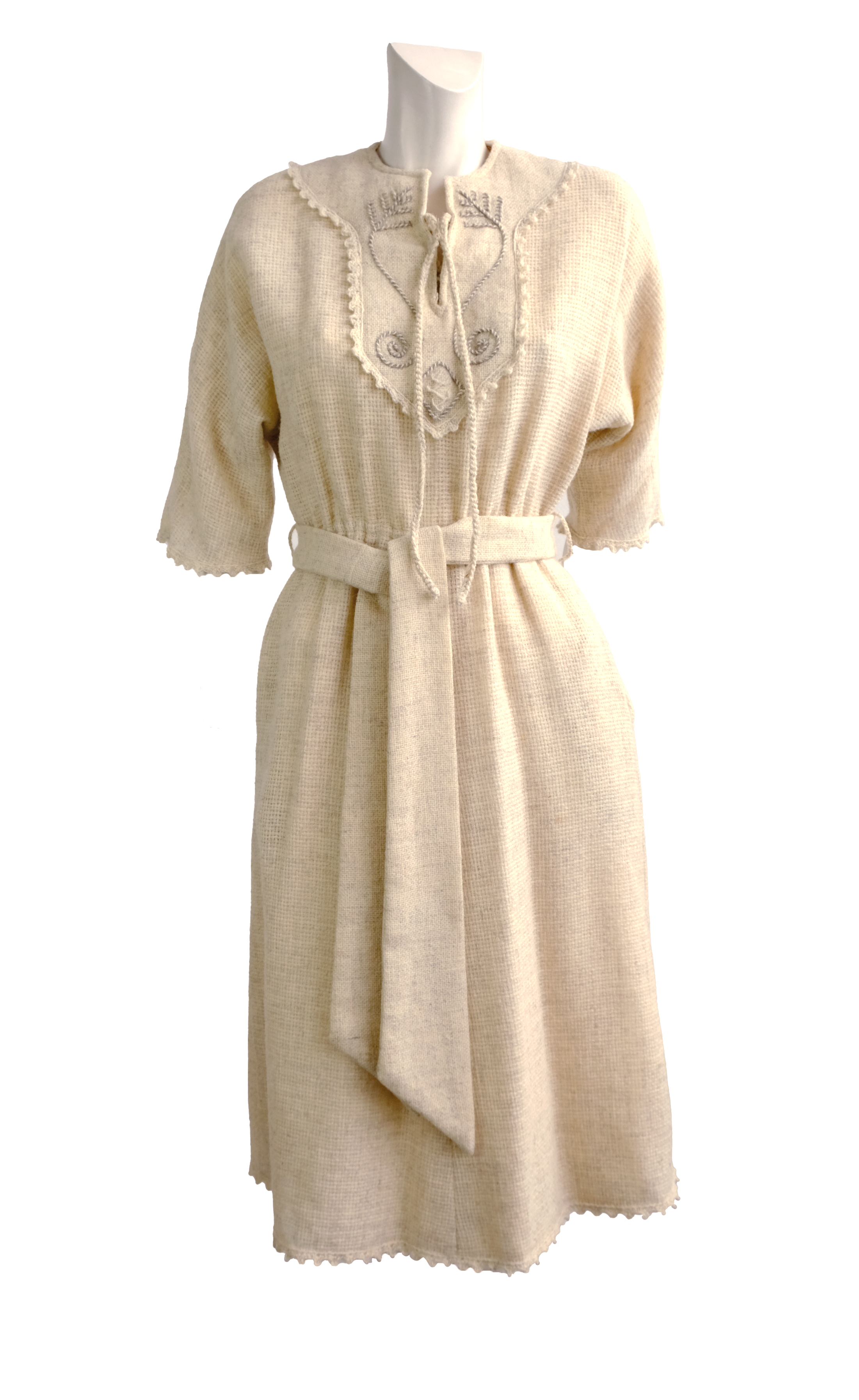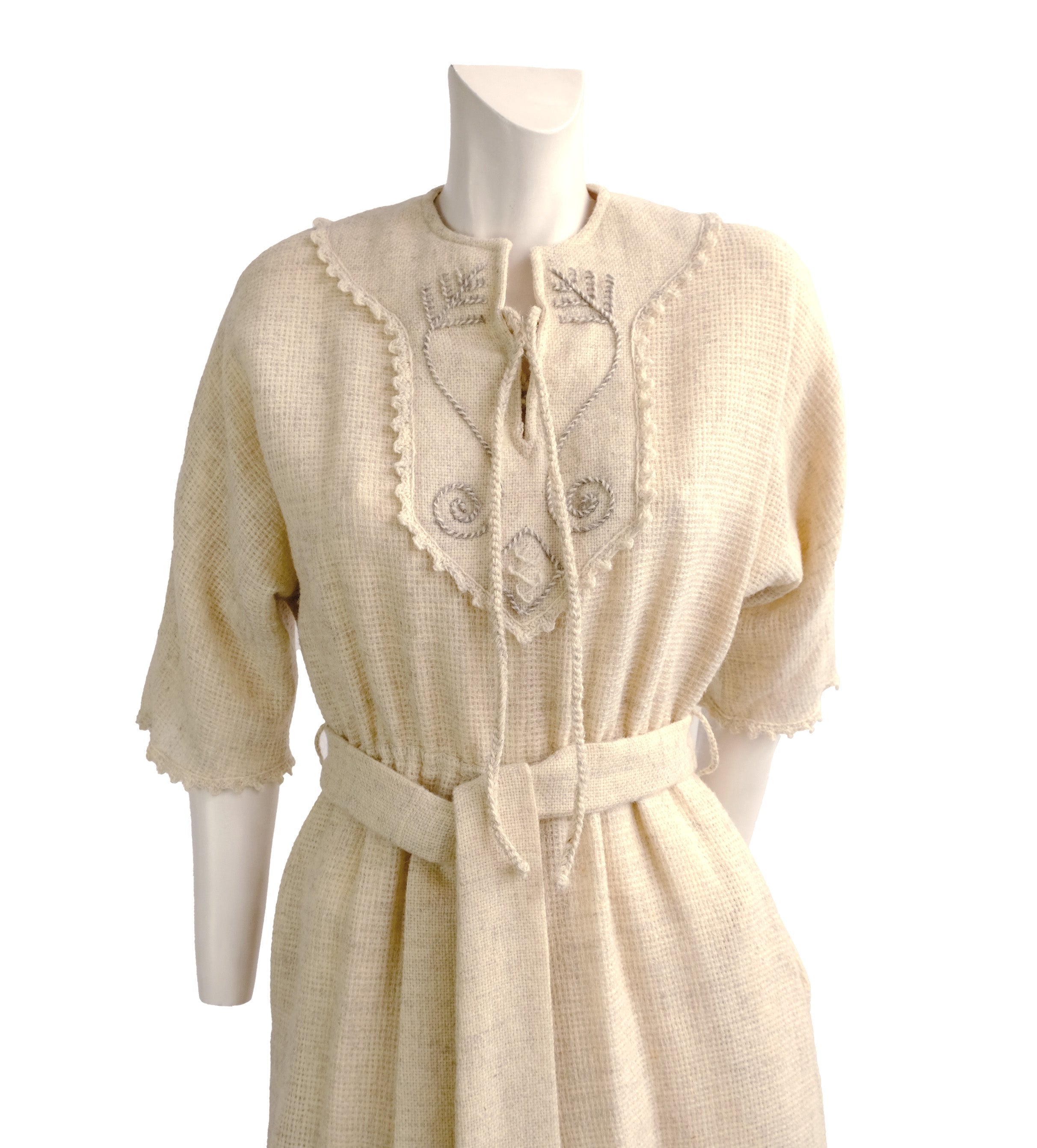 Anna Roose 1970s Vintage Dress in Loose Weave Wool, Embroidered, Small