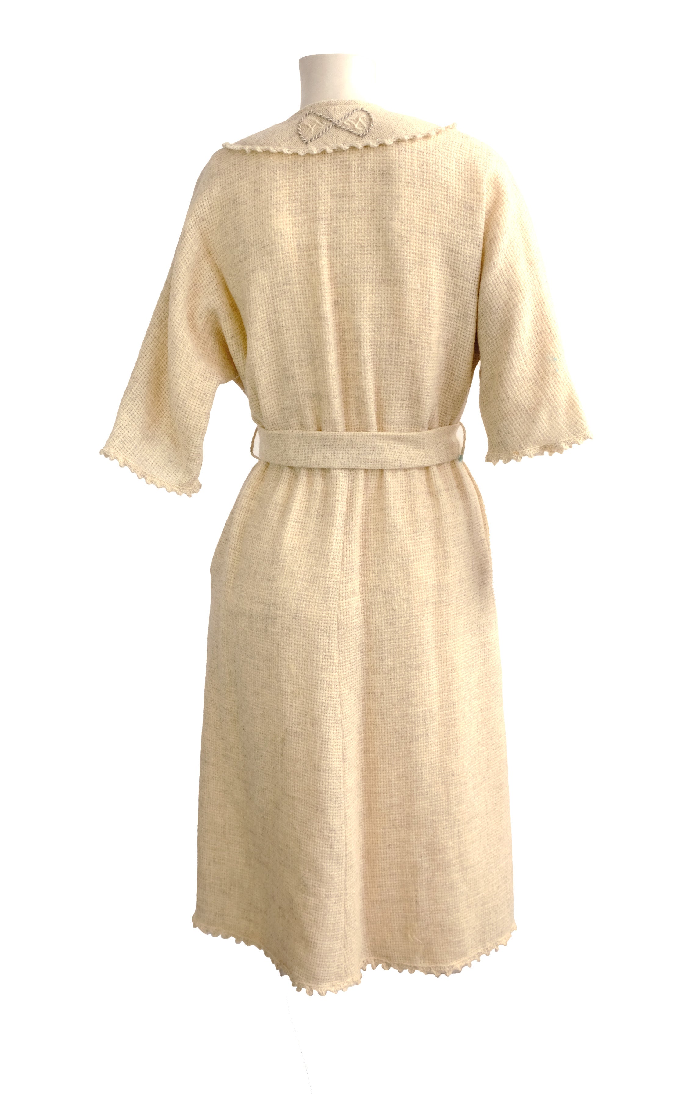 Dolman sleeves to elbow length, elasticated waIst with tie belt, straight skirt to below the knee, concealed side pockets. All edges trimmed with narrow crochet scalloped finish. Lined.