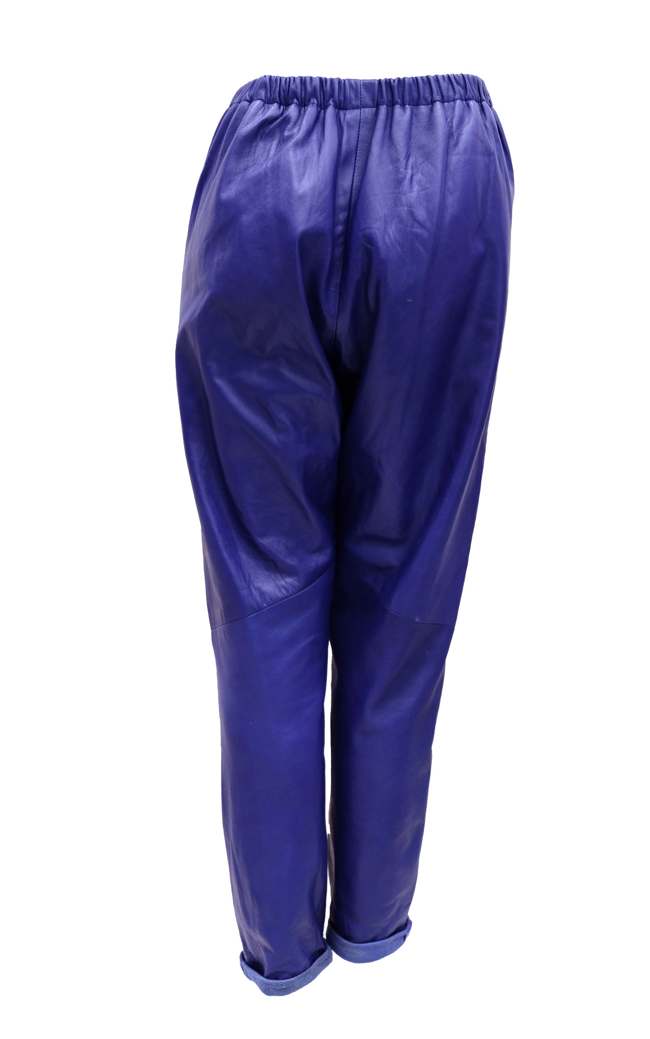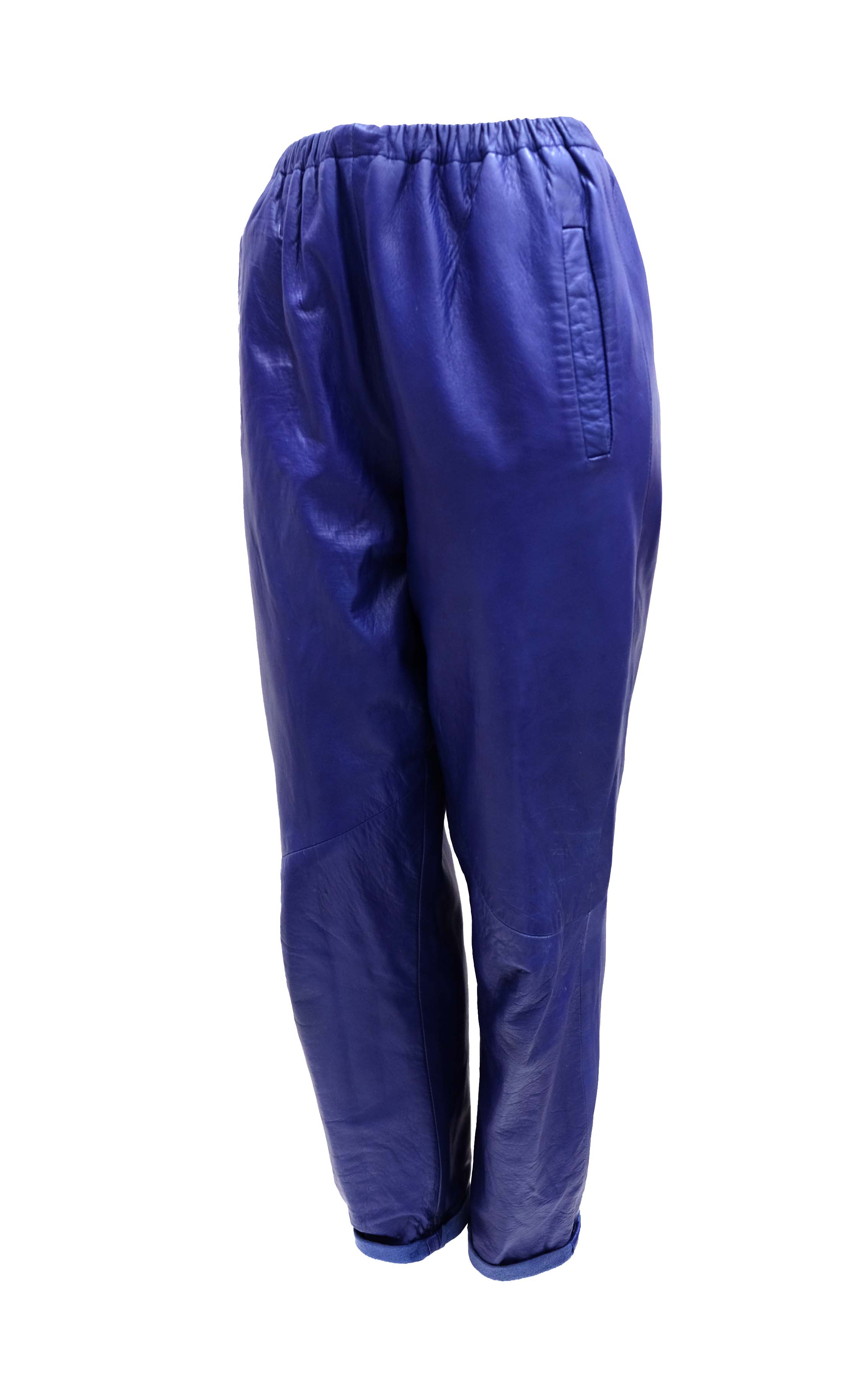 A wonderful 1980s vintage pair of jogging pants by Erez, in intense ultramarine blue, soft leather.