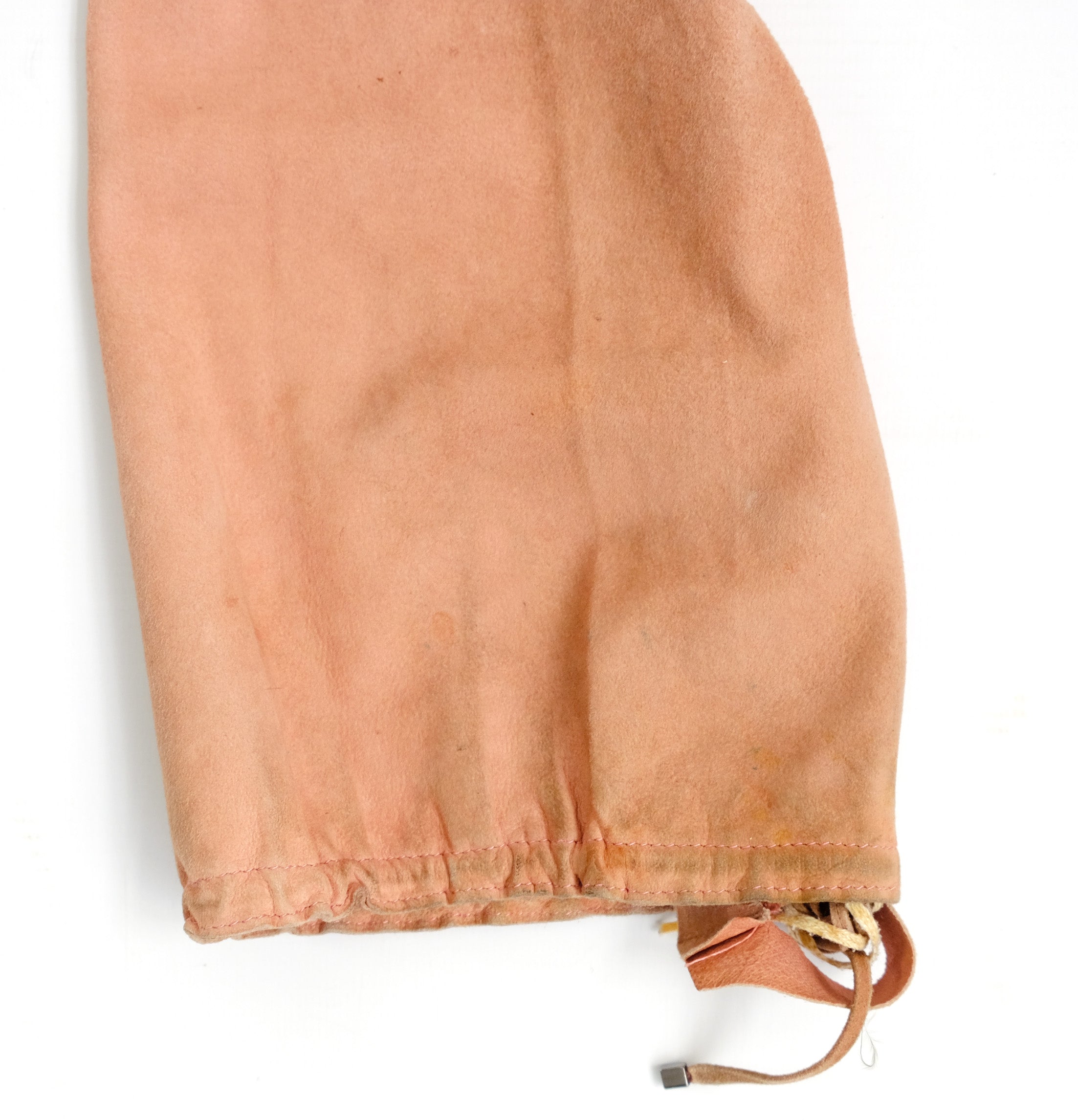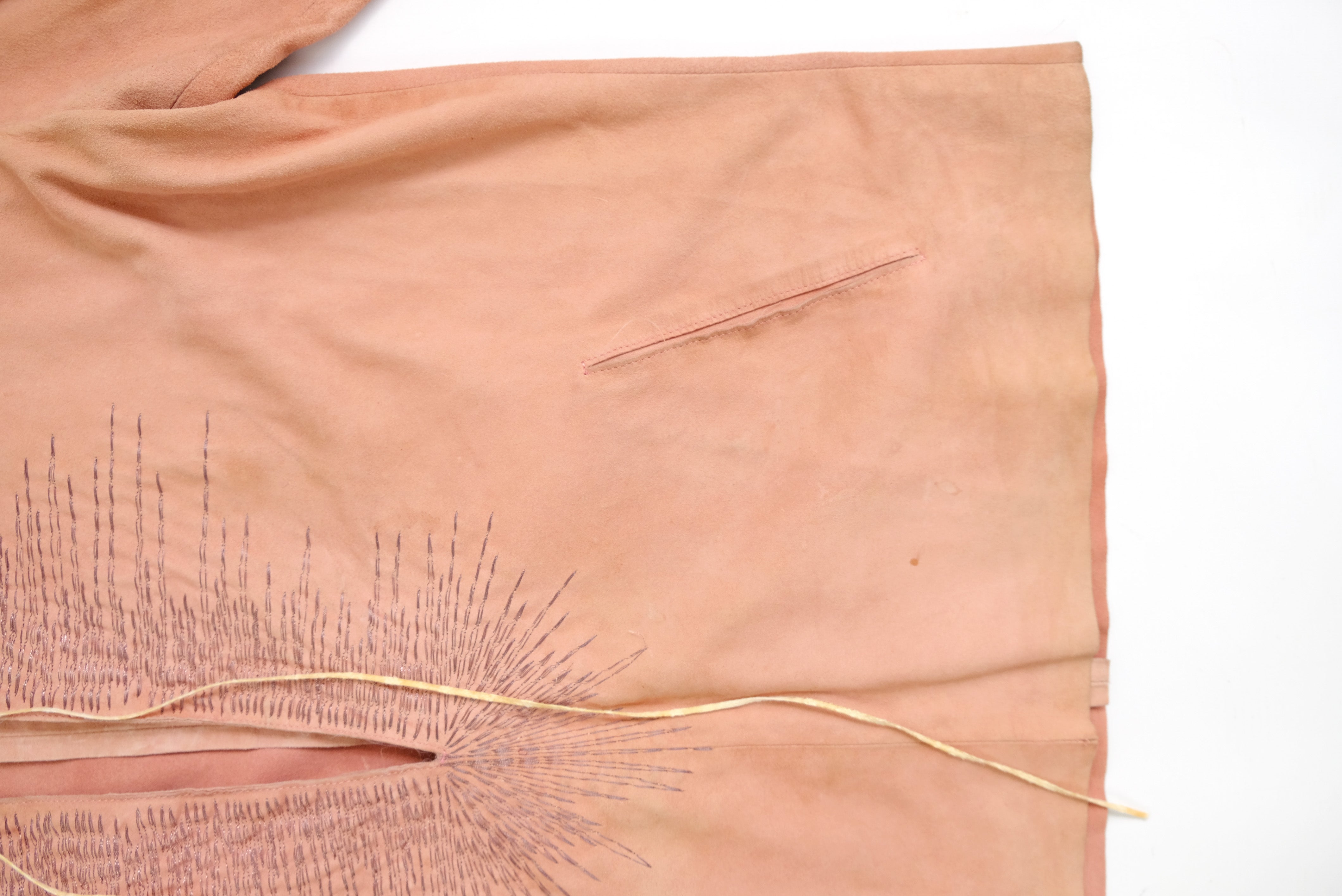 Condition: fair - the suede and embellishments are in good condition, there is historic staining at the cuffs and minor discolouration which persist after specialist cleaning. Shown in photos and priced accordingly - no returns.
