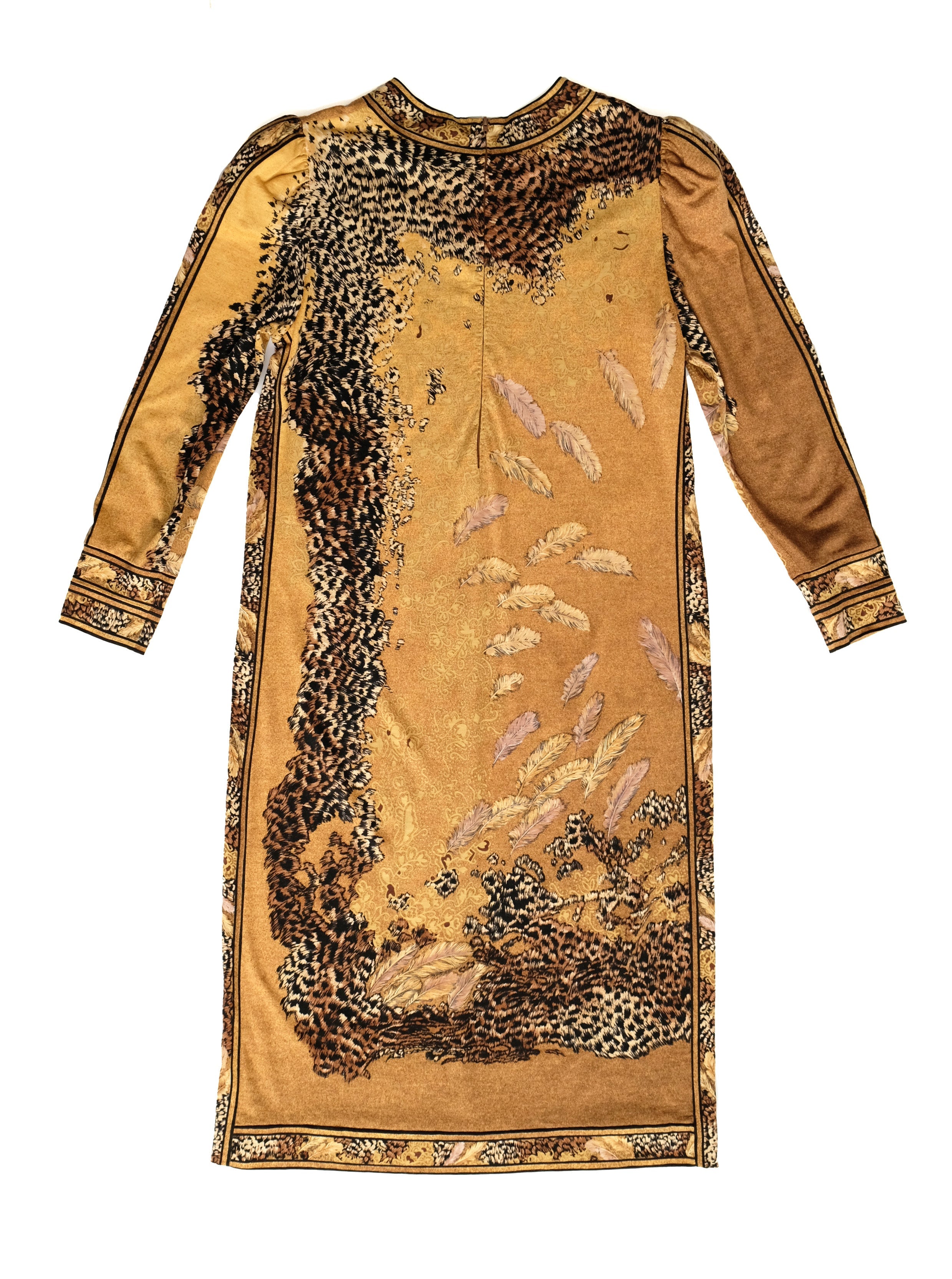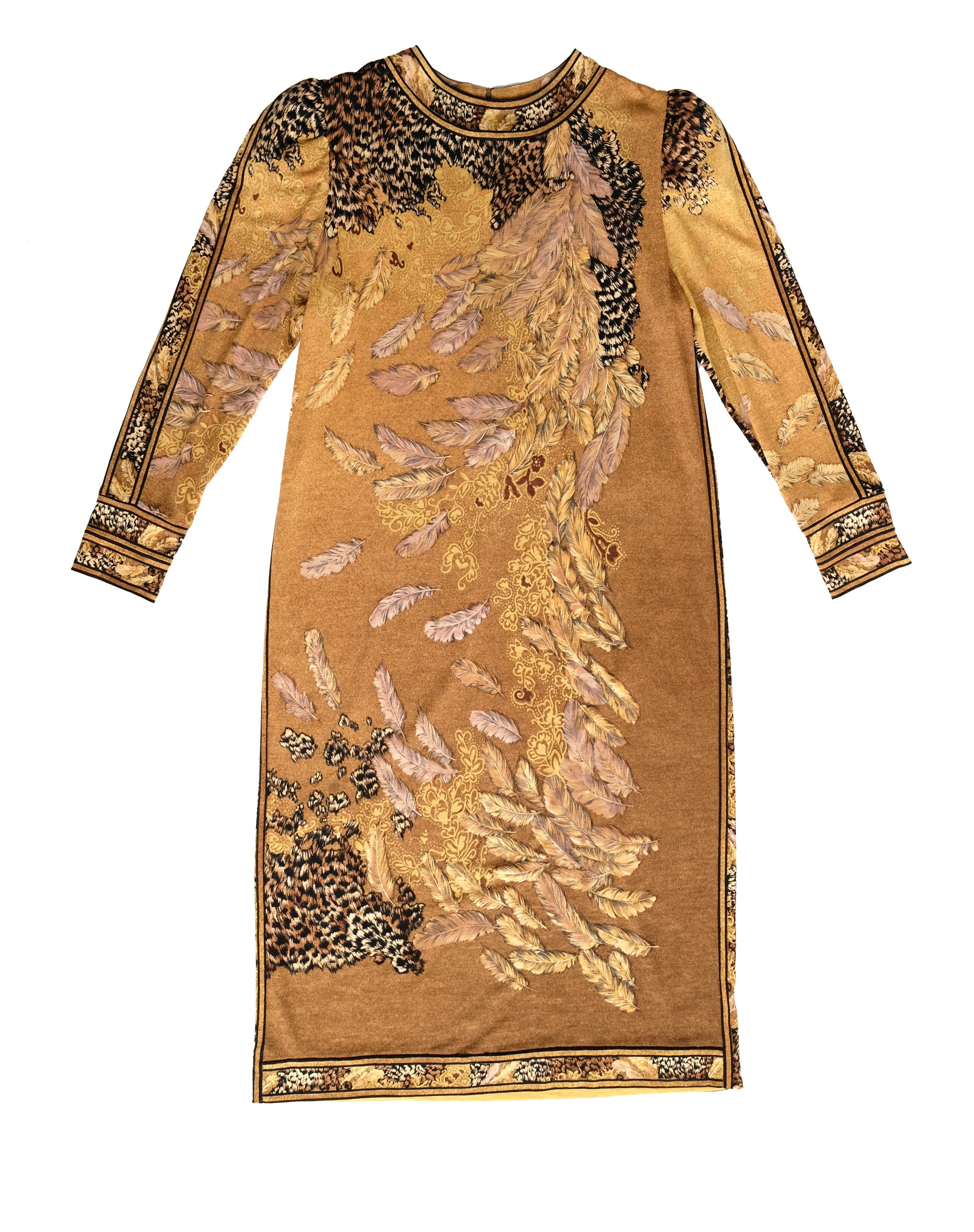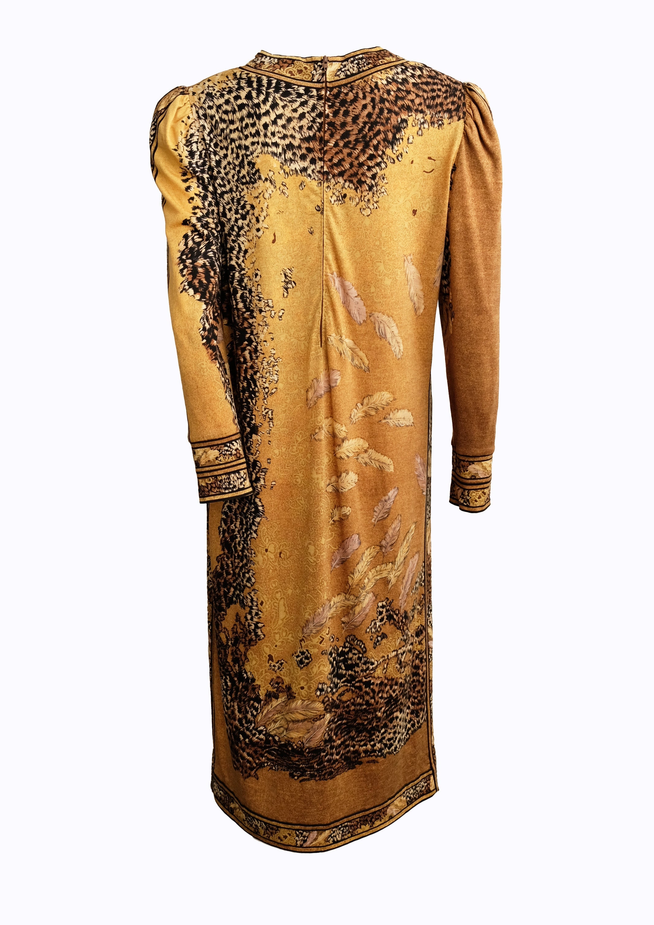 Leonard Studio 1980s Vintage Gold Jersey Dress with Feather Motif, UK10-12