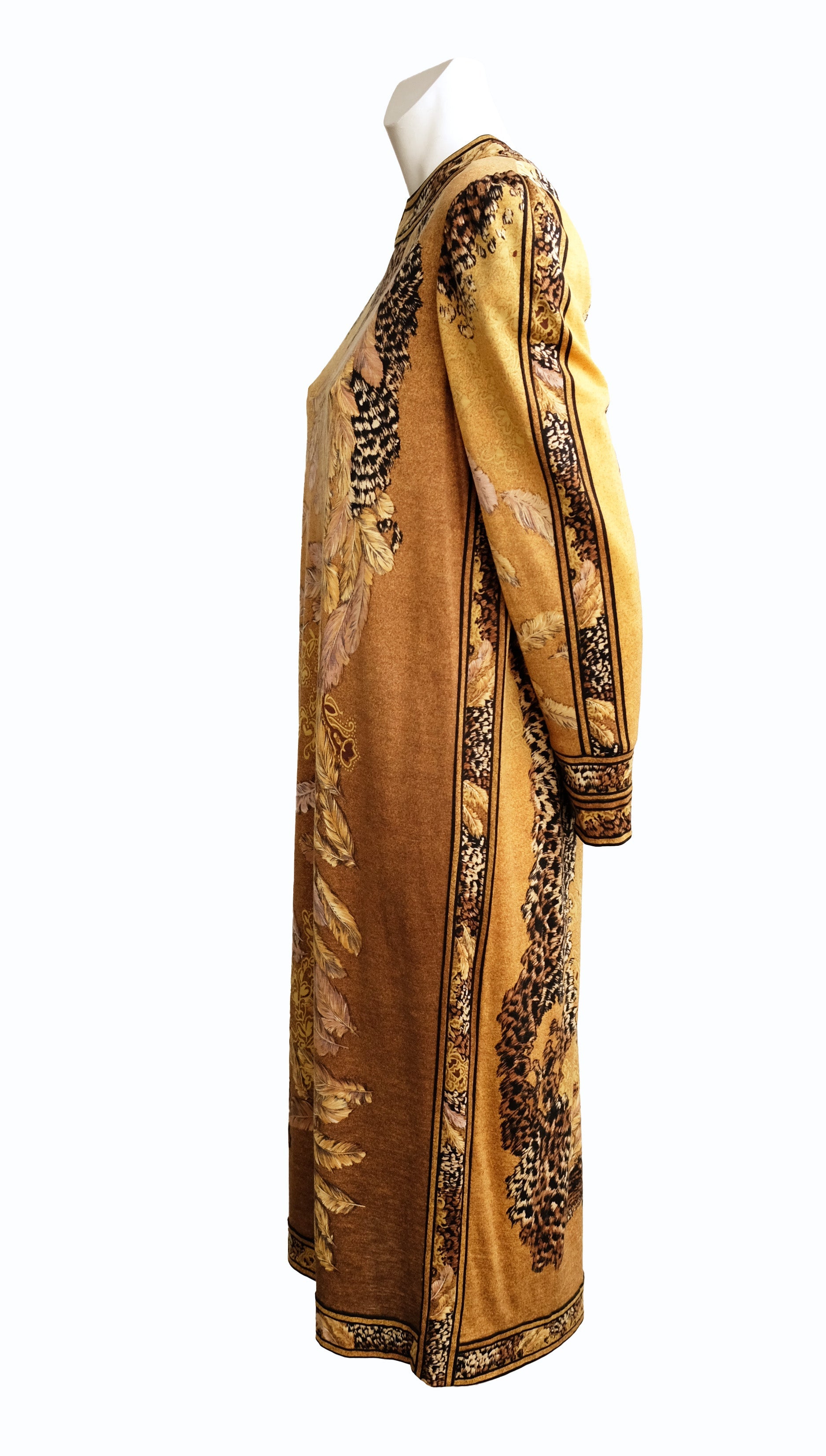A glorious 1980s vintage formal dress by Leonard Stuido Paris, in incredible gold toned fine jersey, covered with elaborate feather motifs and signature borders. As always with this favourite fashion house, the beauty is in the fabric.