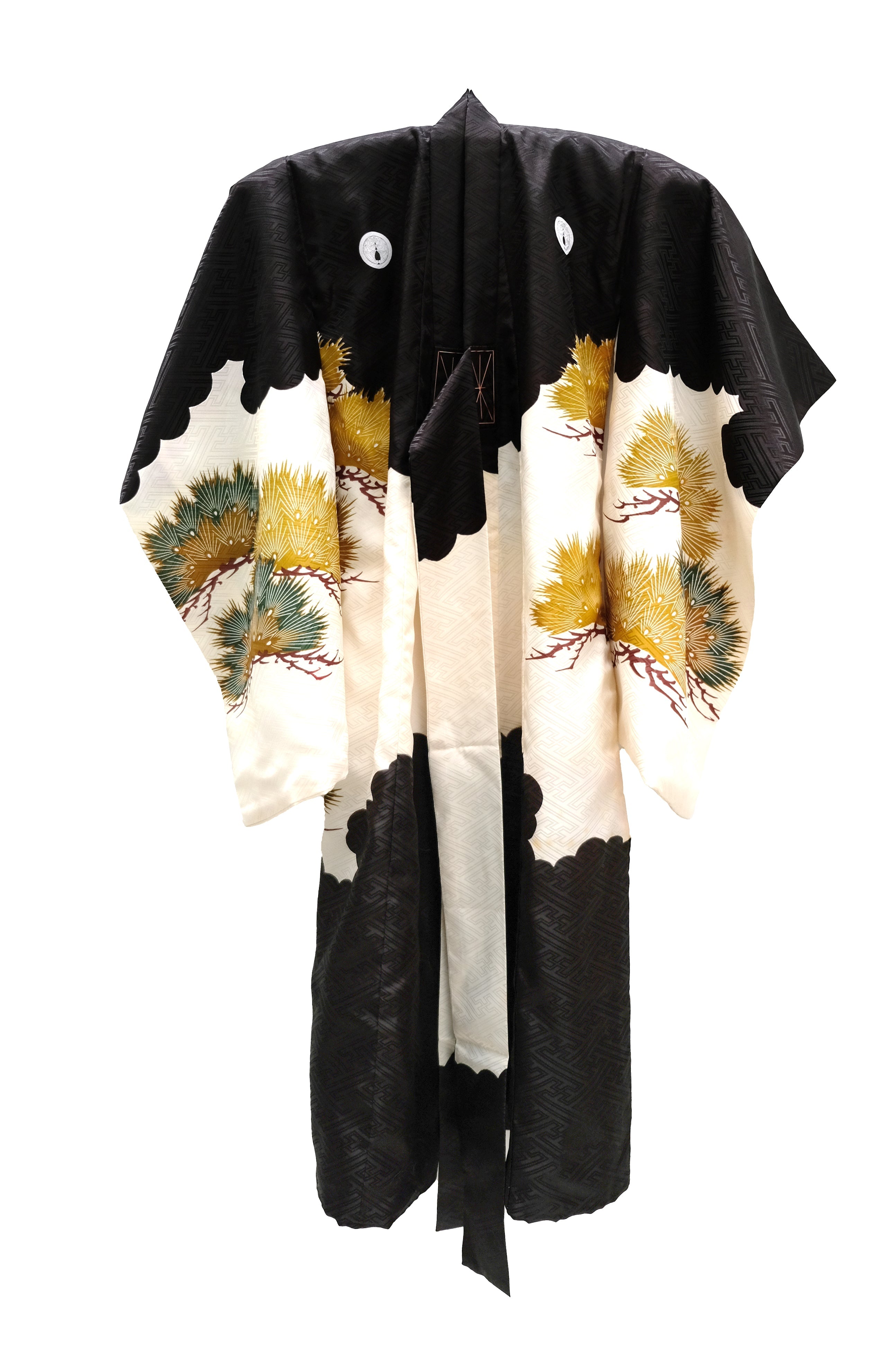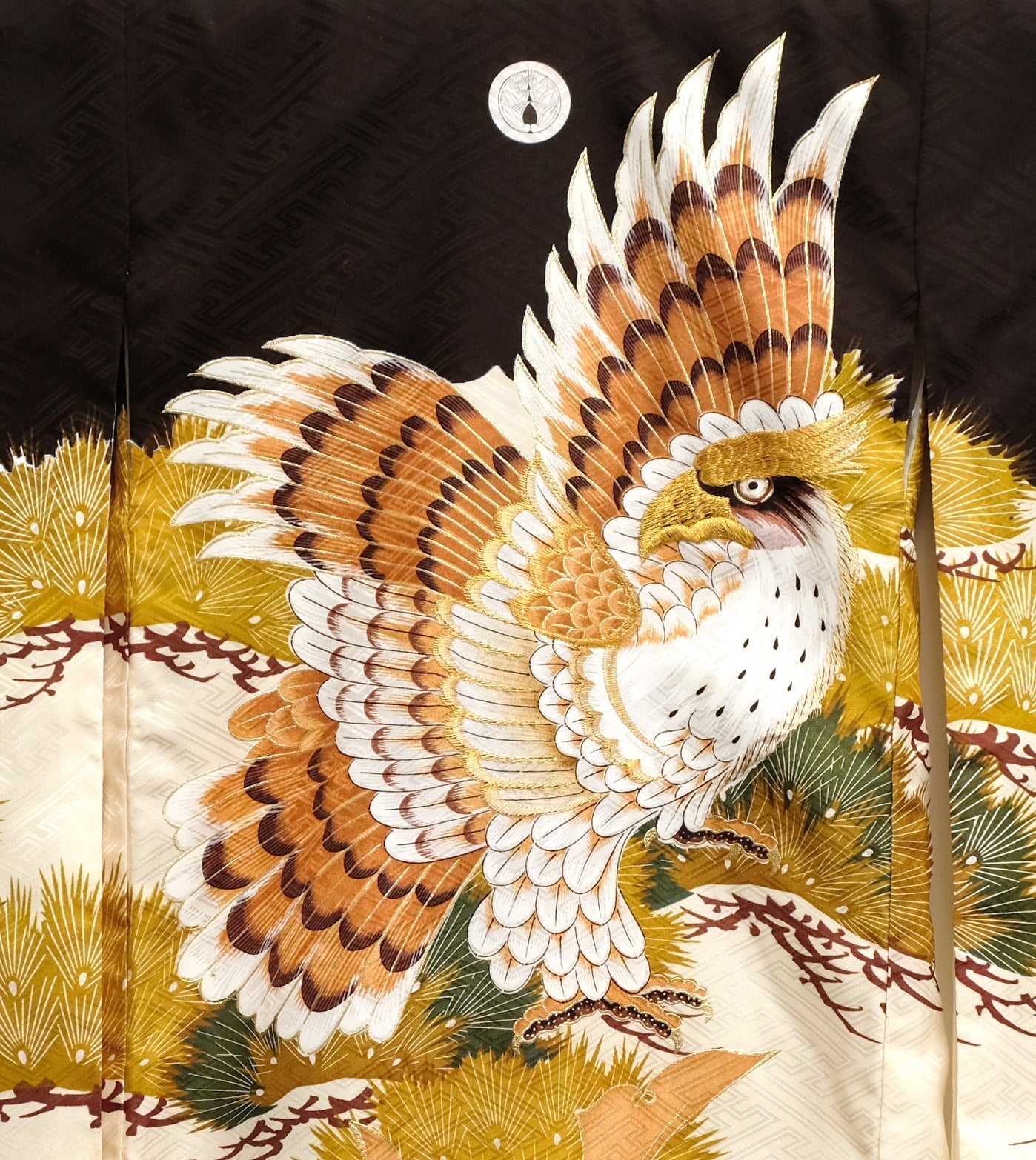 Vintage Child's Kimono in Black and White Jacquard Silk with Embroidered Eagle