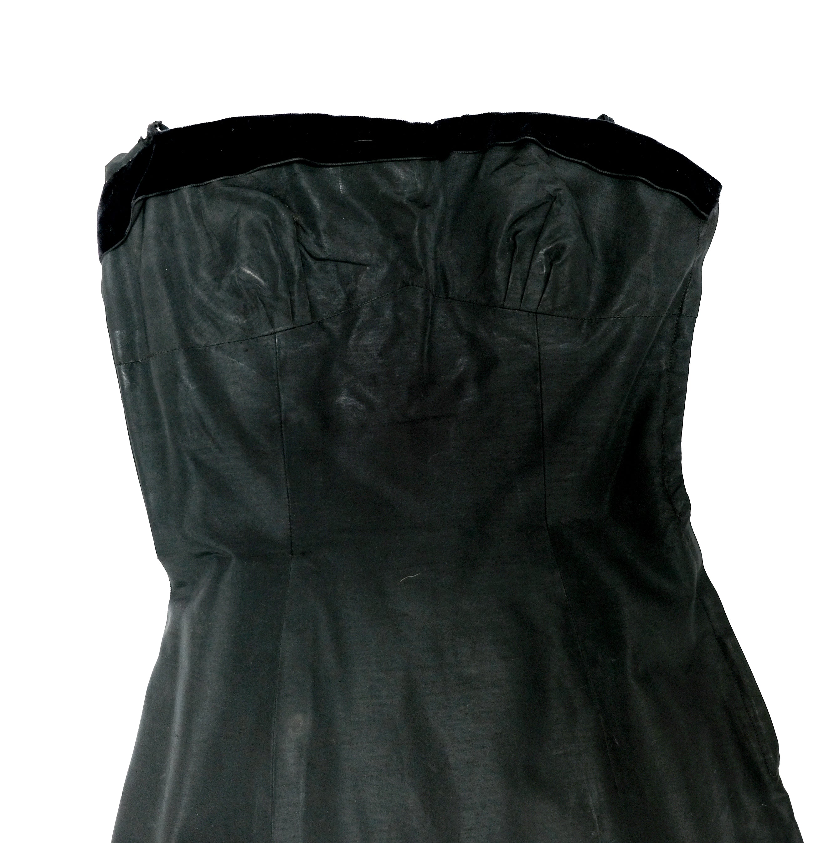 Strapless boned bodice, tight fitting to waist with velvet top edge.  Flaring out to ankle length, with a pretty frill at the hem made of polka dot black net.