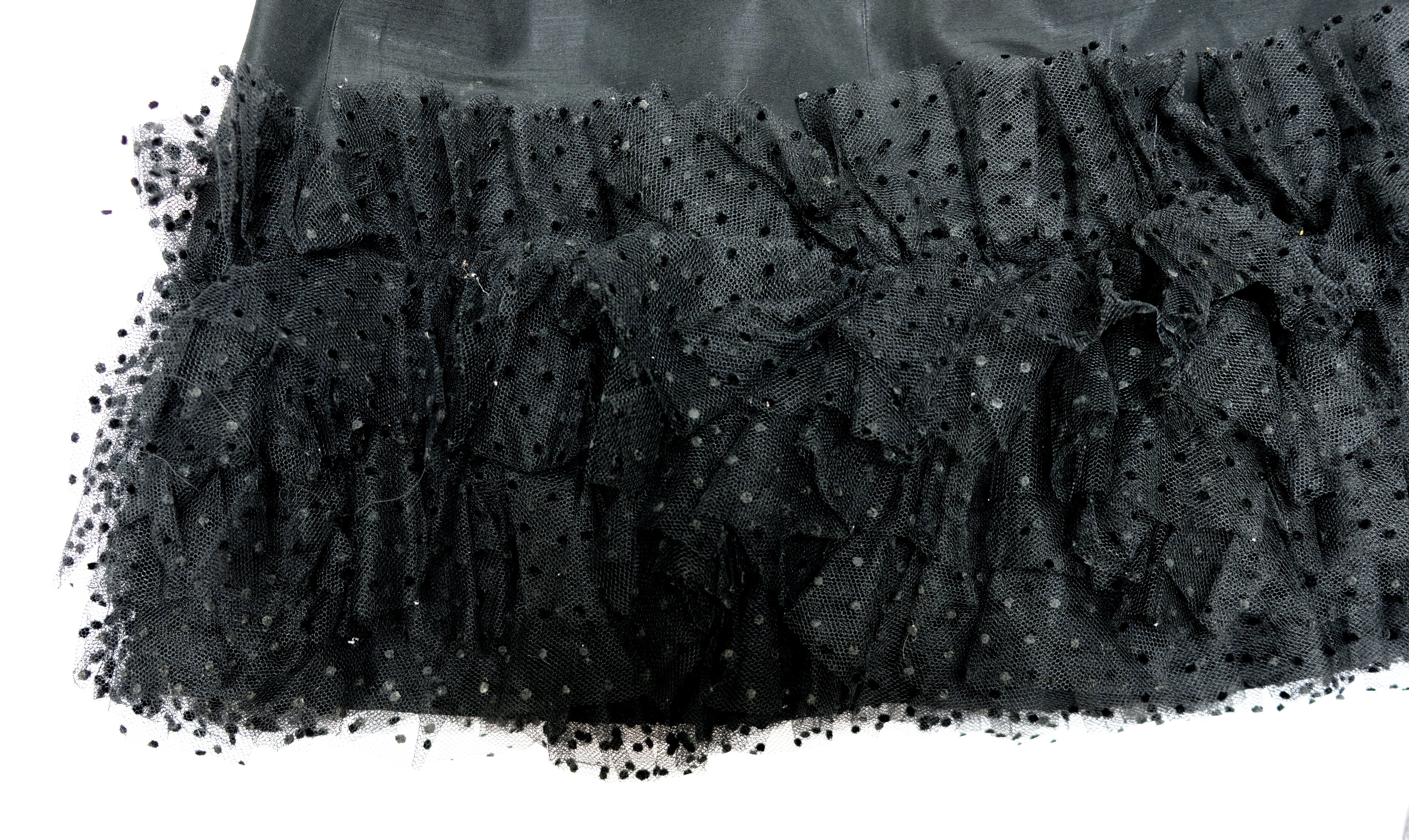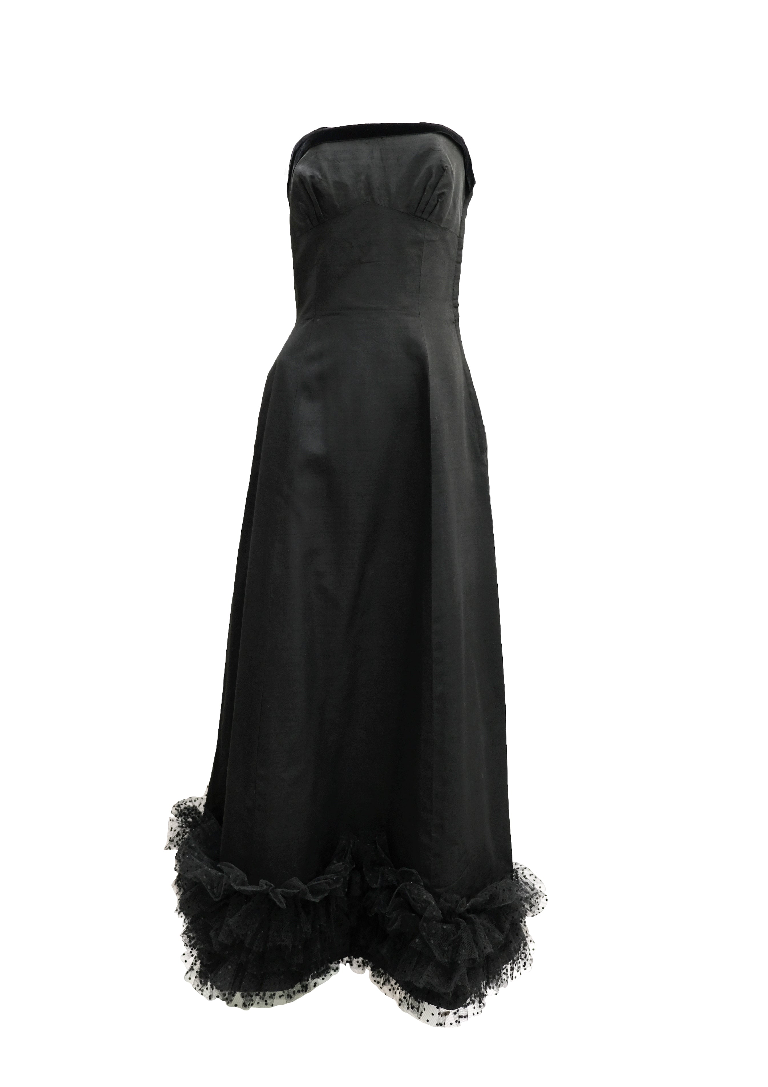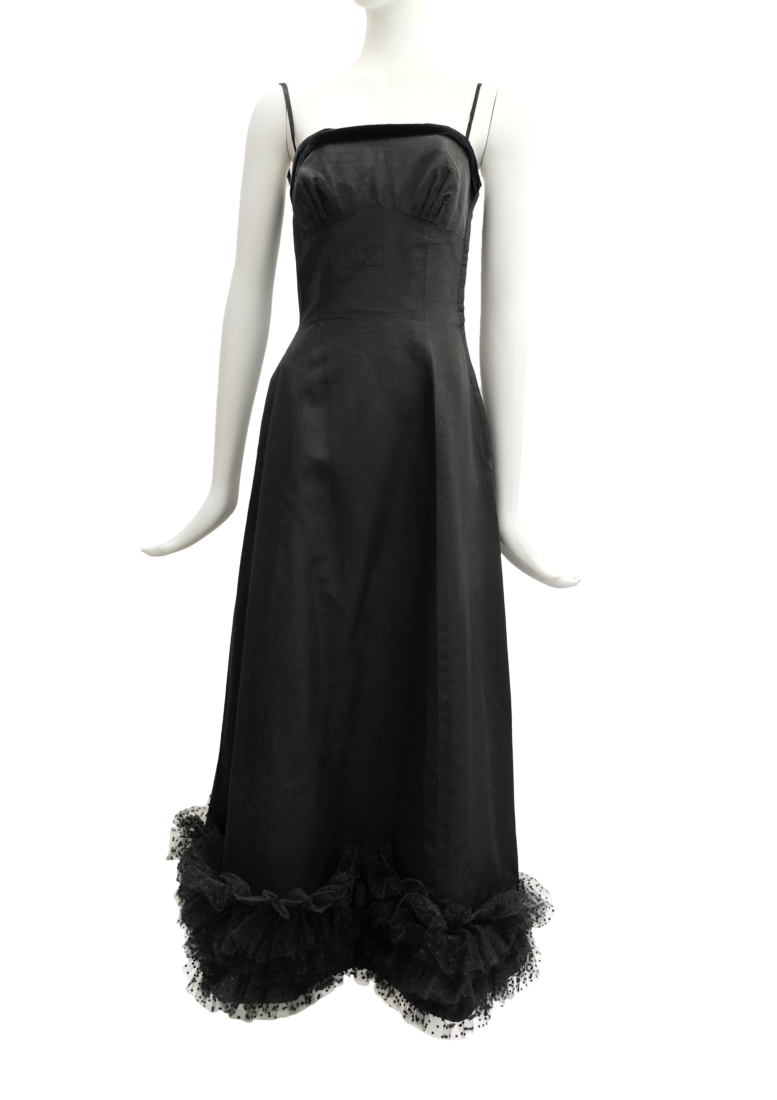 A charming 1980s vintage long evening dress by Fenwick, in black shantung silk with tulle ruffle at the hem.