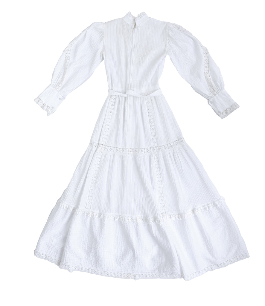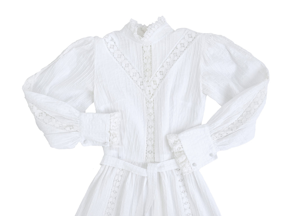 Made of wonderful, unbleached, crisp white cotton, the dress has a high neck edged with crochet lace, on a fitted bodice with pin tuck panel and lace inserts. Wide puff sleeves with crochet lace inserts and buttoned cuffs.