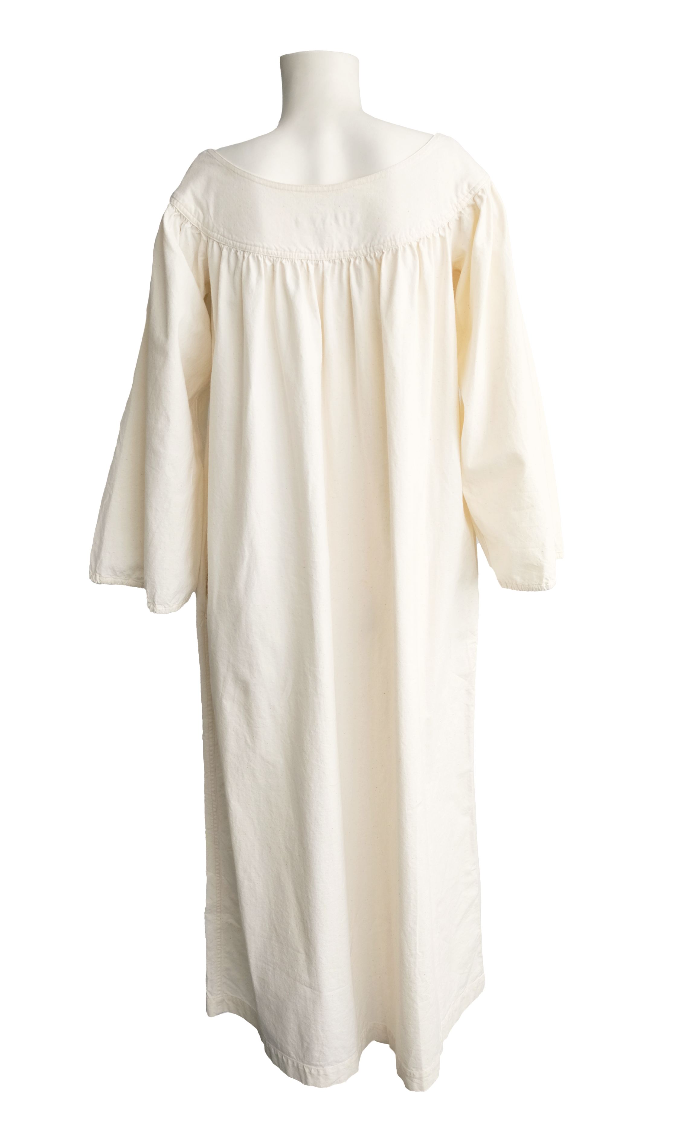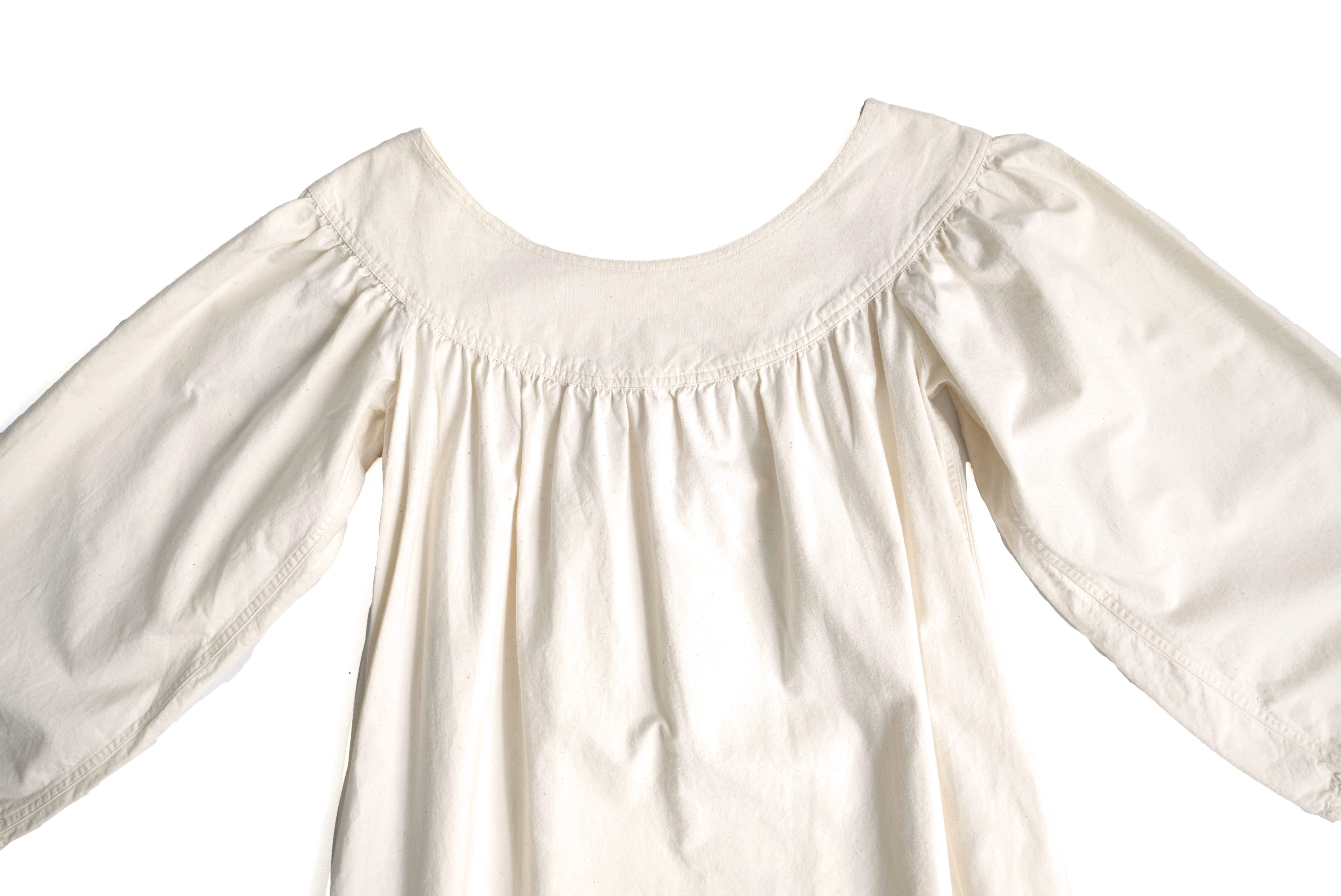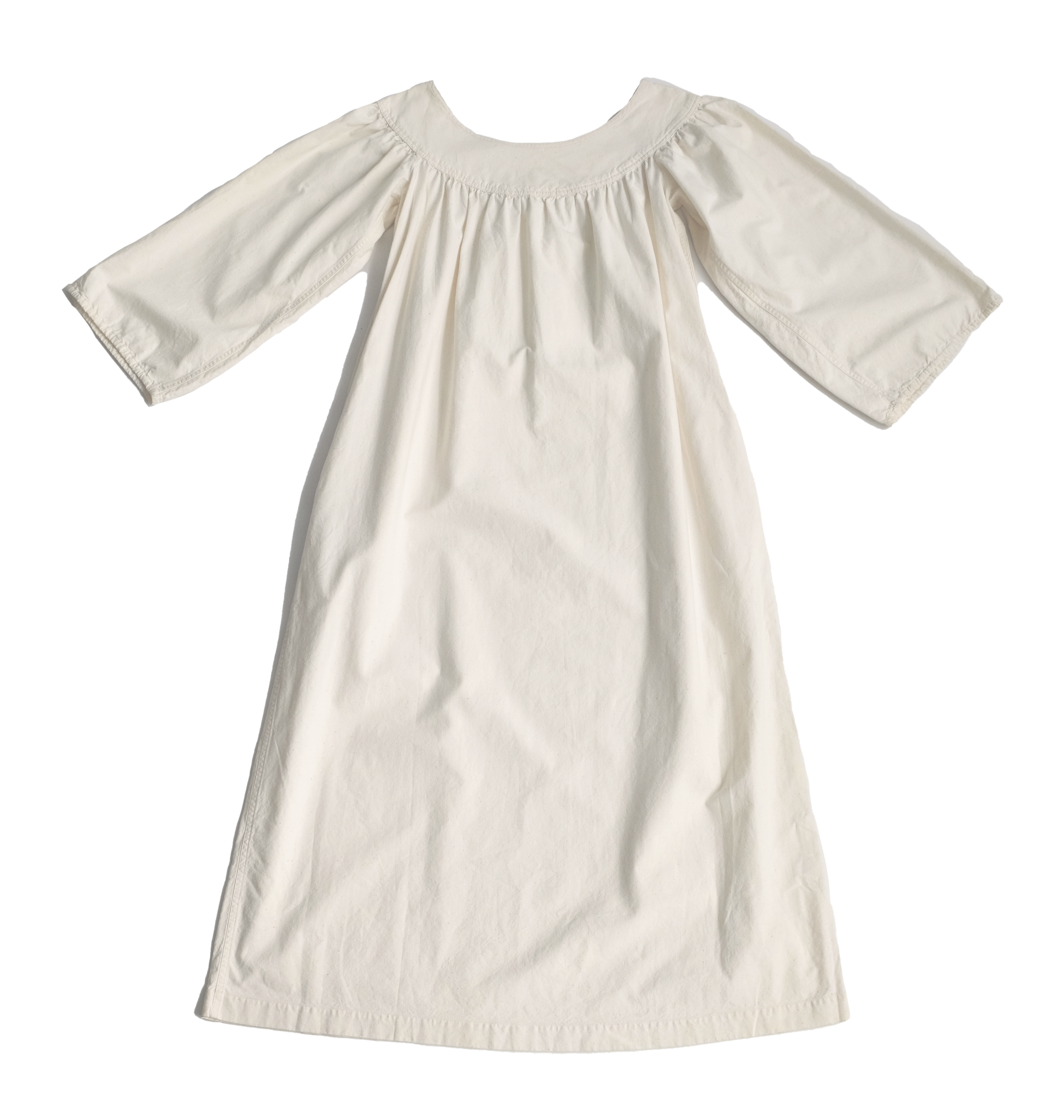 Wide boat neck, with rounded yoke. Softly gathered and falling loosely to mid calf. Wide 3/4 length sleeves.