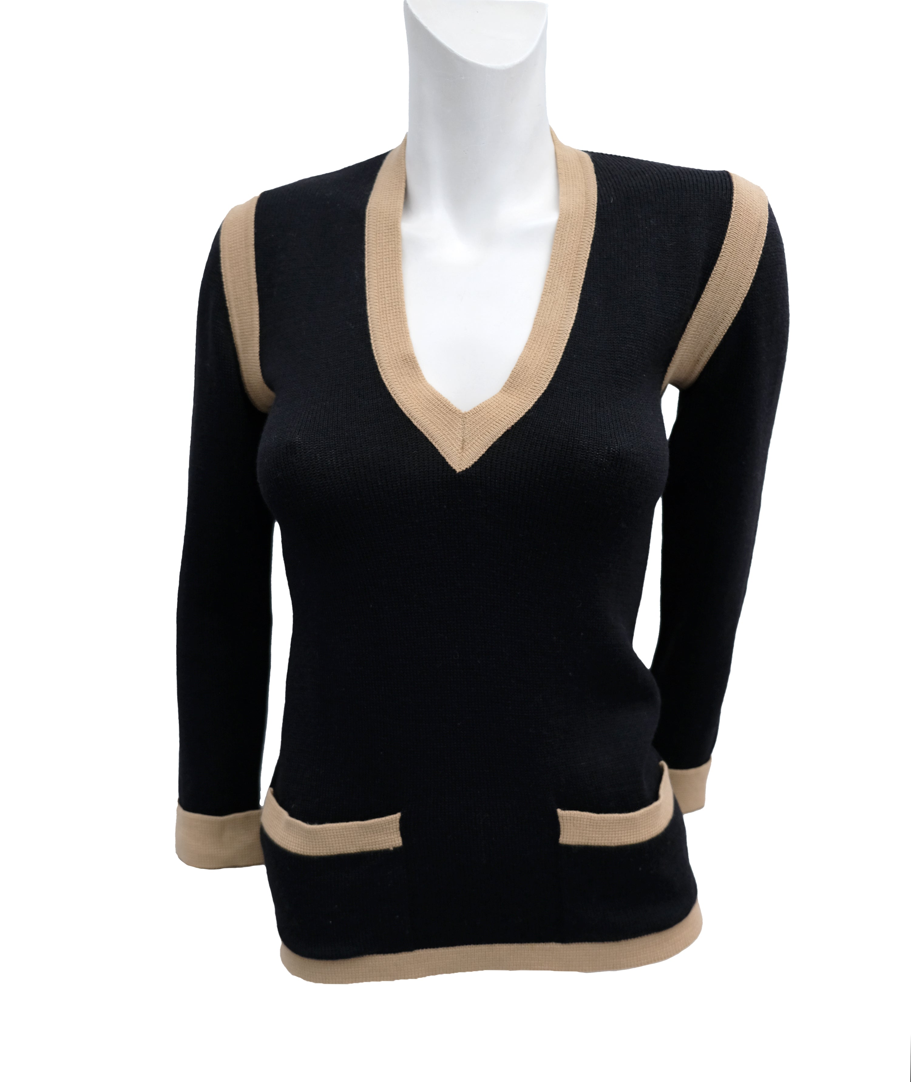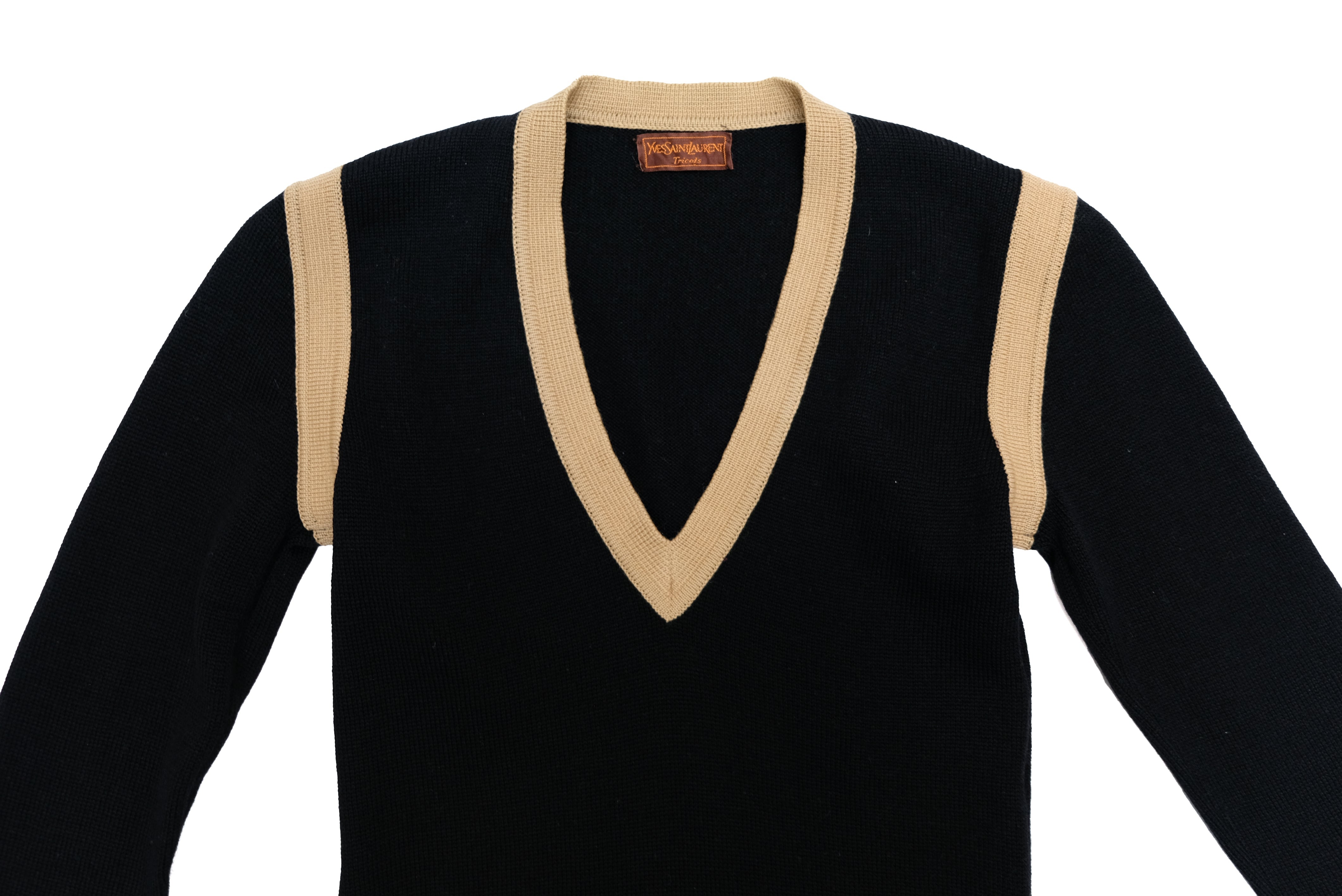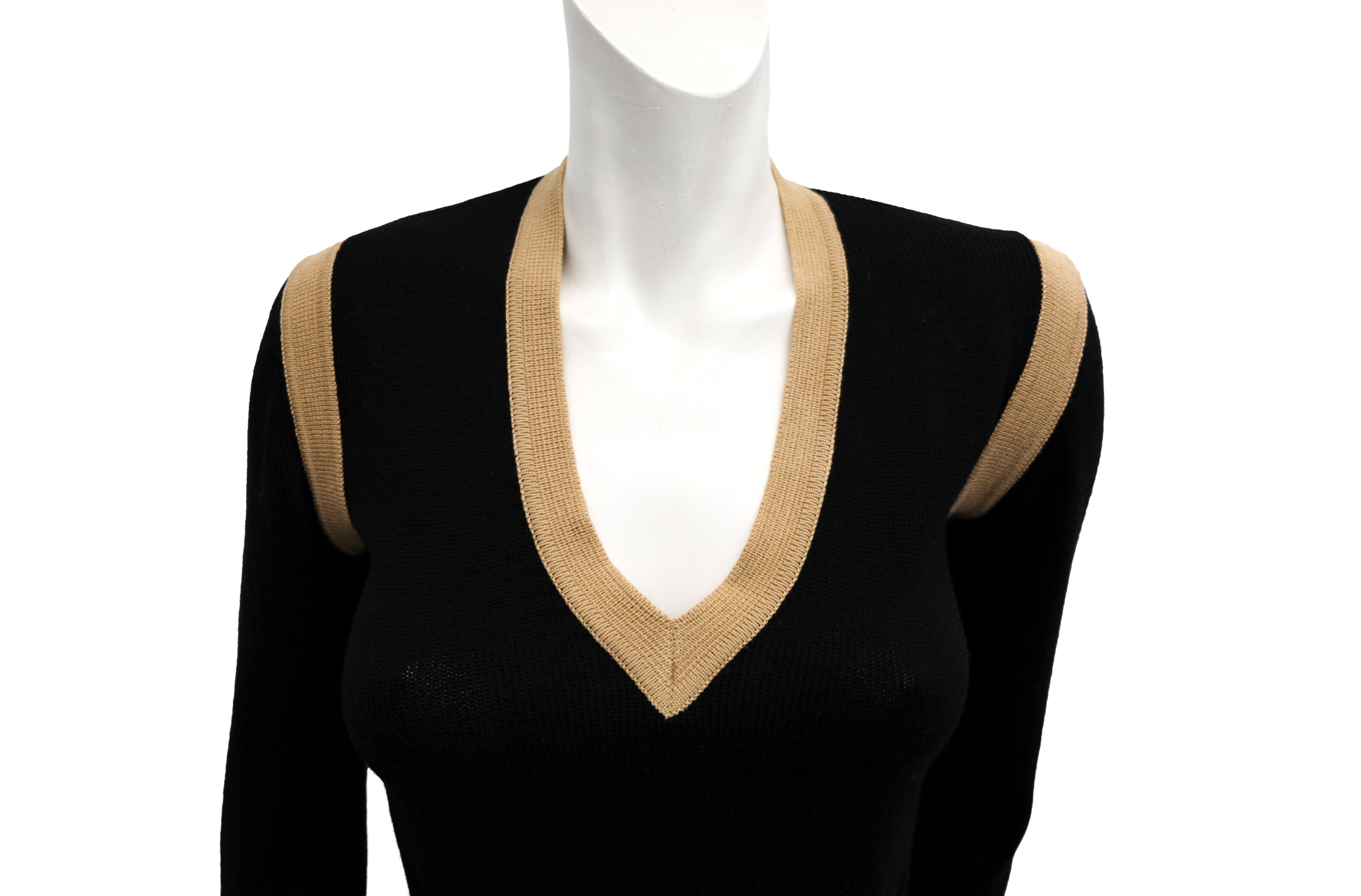 A classic 1970s vintage V neck sweater by Yves Saint Laurent Tricot, in black wool knit with camel trim, in incredible condition.