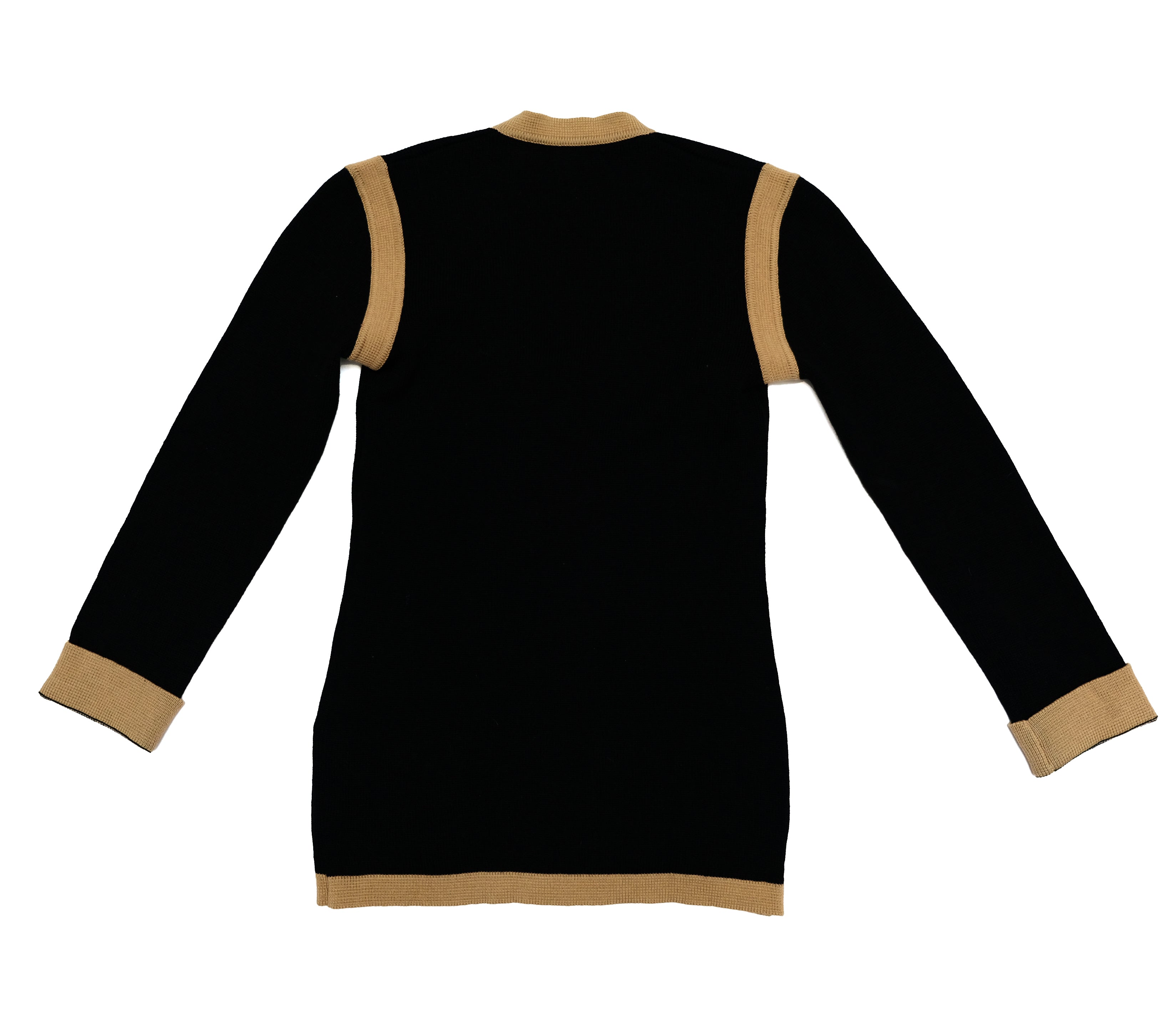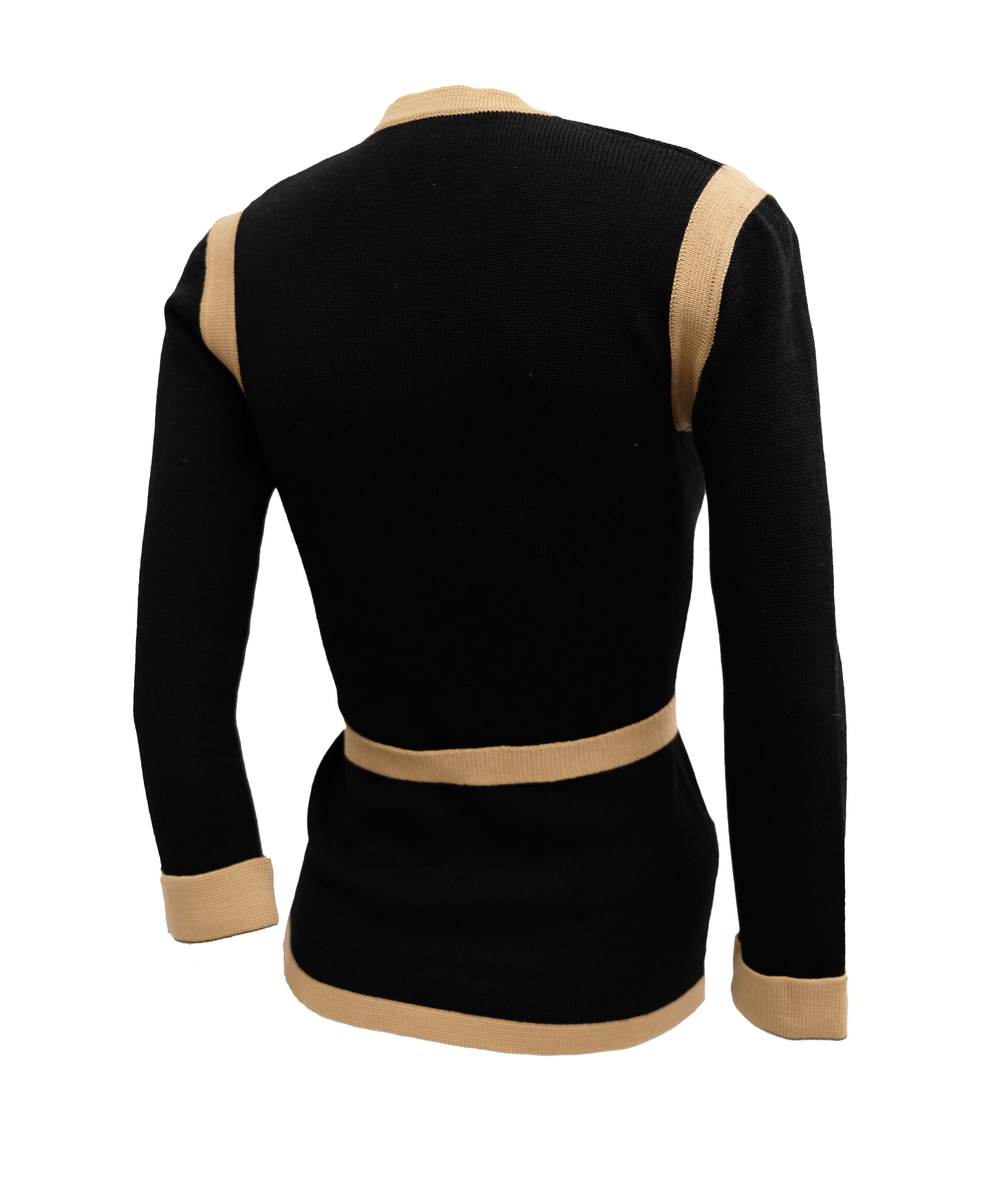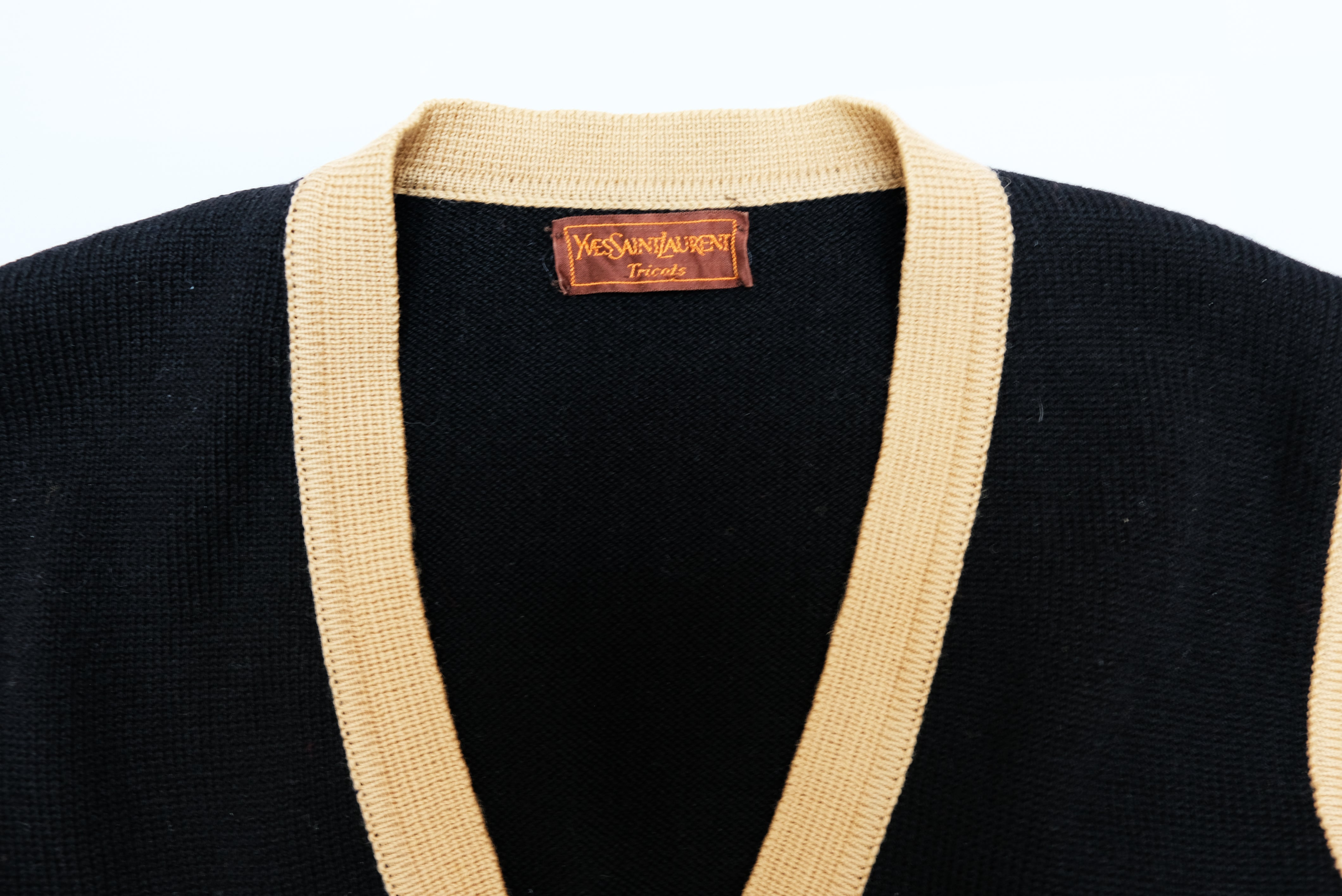 A classic 1970s vintage V neck sweater by Yves Saint Laurent Tricot, in black wool knit with camel trim, in incredible condition.