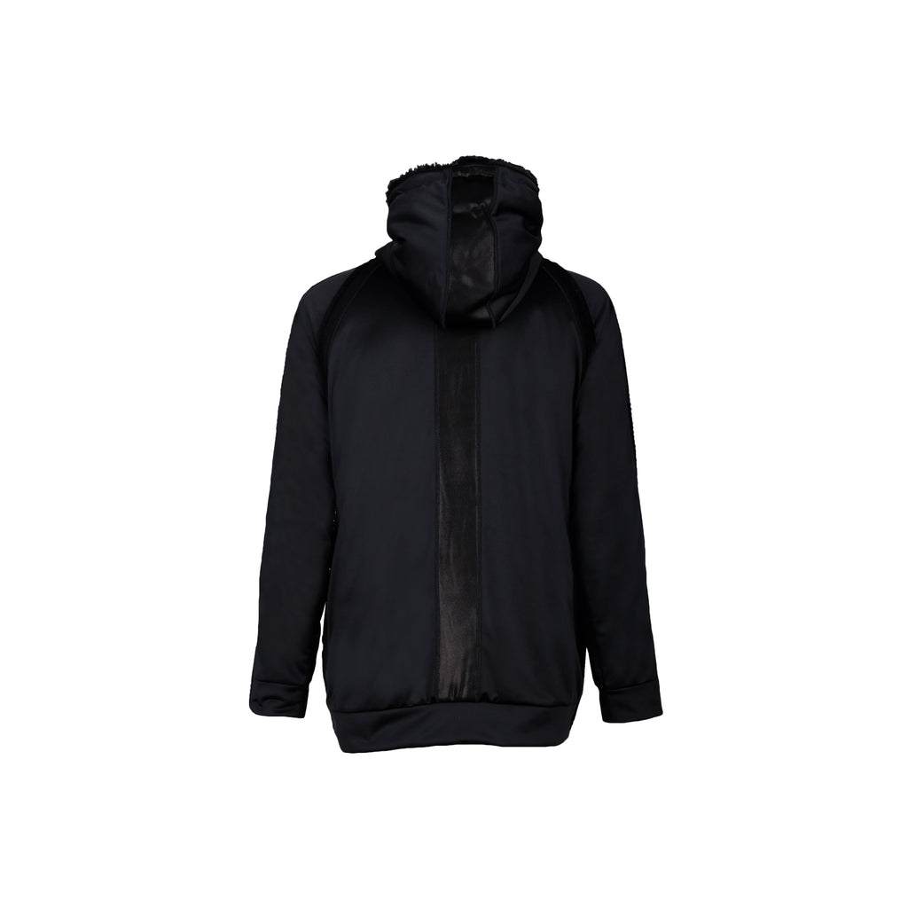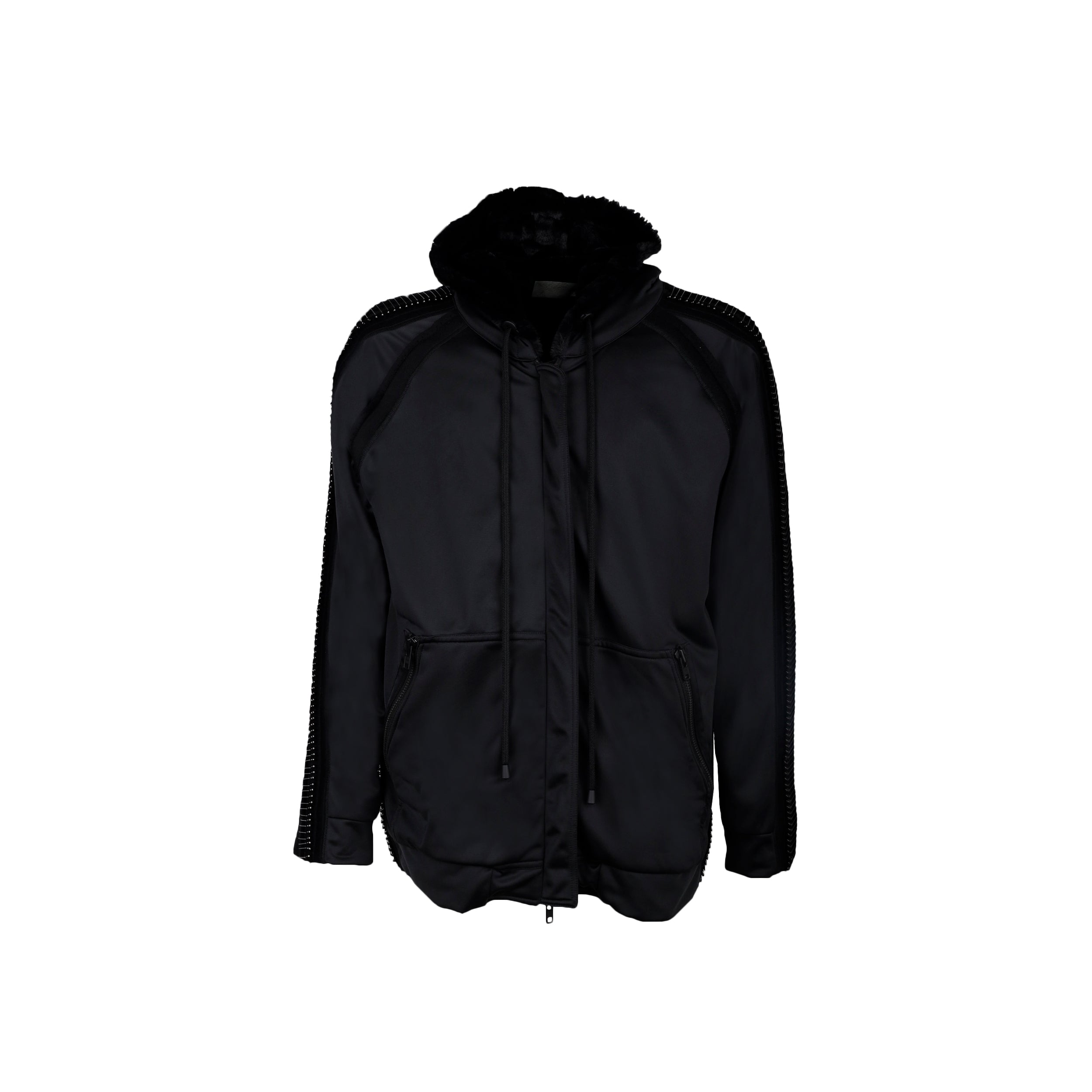Diliborio black hooded jacket embellished with pins and faux fur, zip fastening, two pocket.