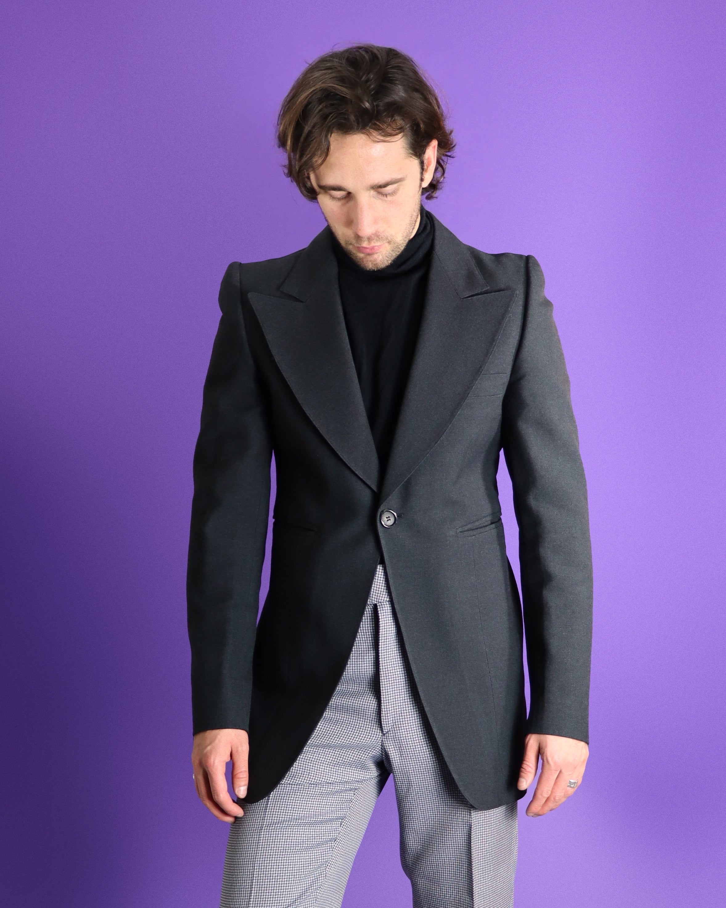 Vintage 1970s peaked lapel blazer, made in France. Beautiful soft woollen mix fabric in a gorgeous, timeless charcoal grey. Cut with sharp lapel, elegant shoulder pads and finished with multiple welt pockets and full lining. In impeccable condition.
