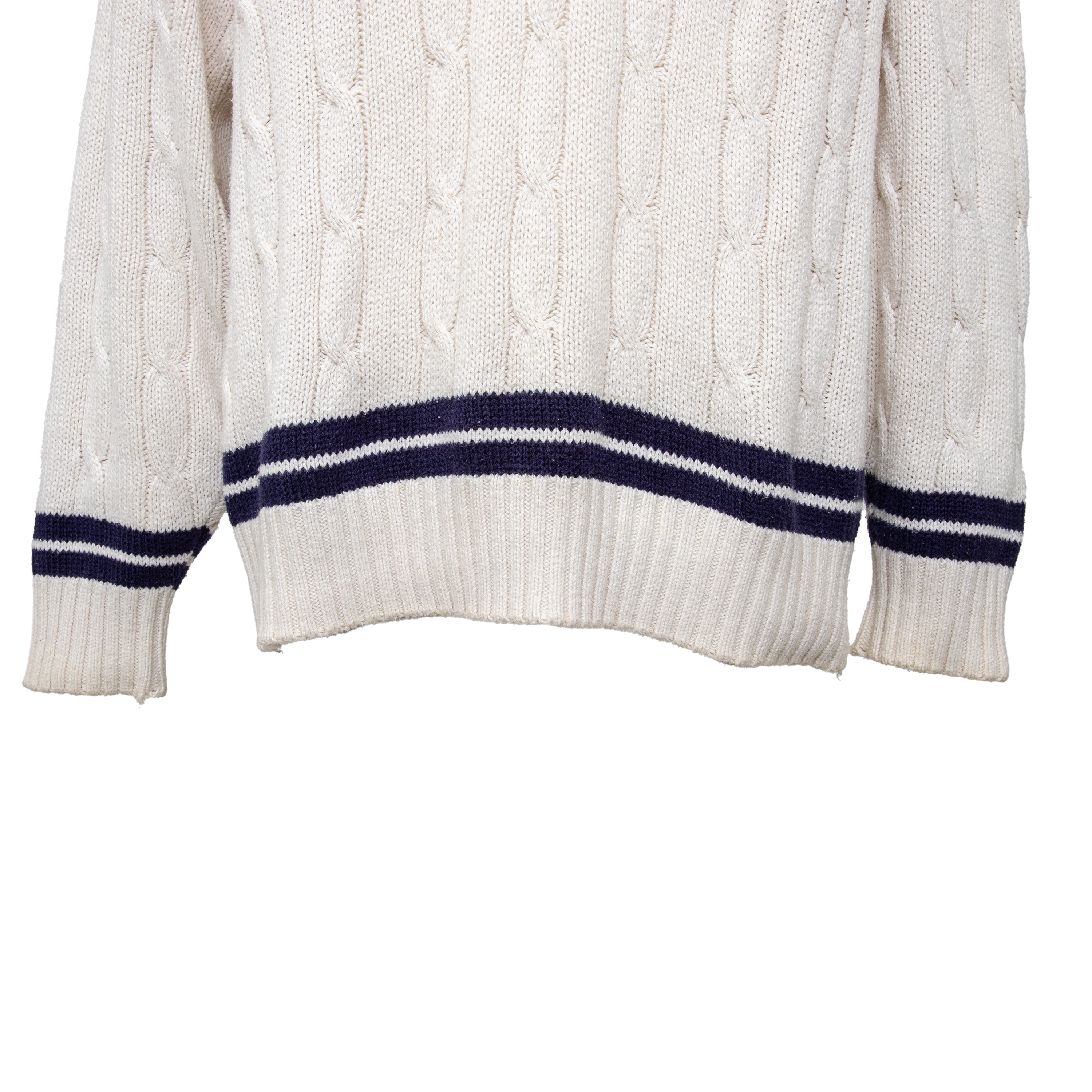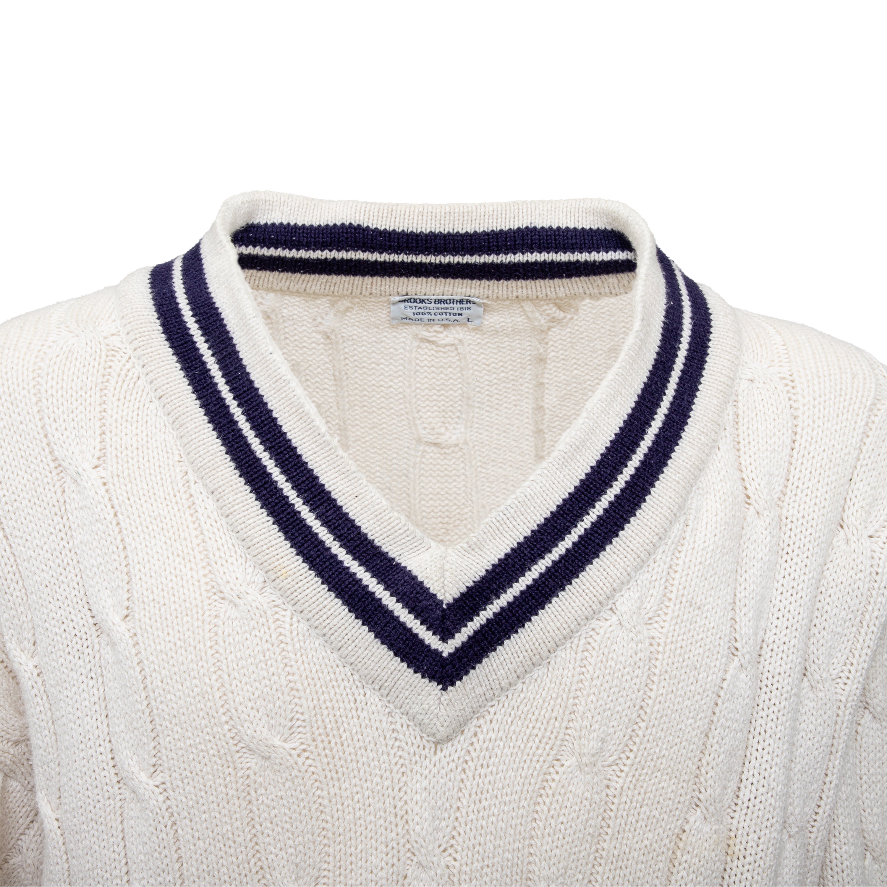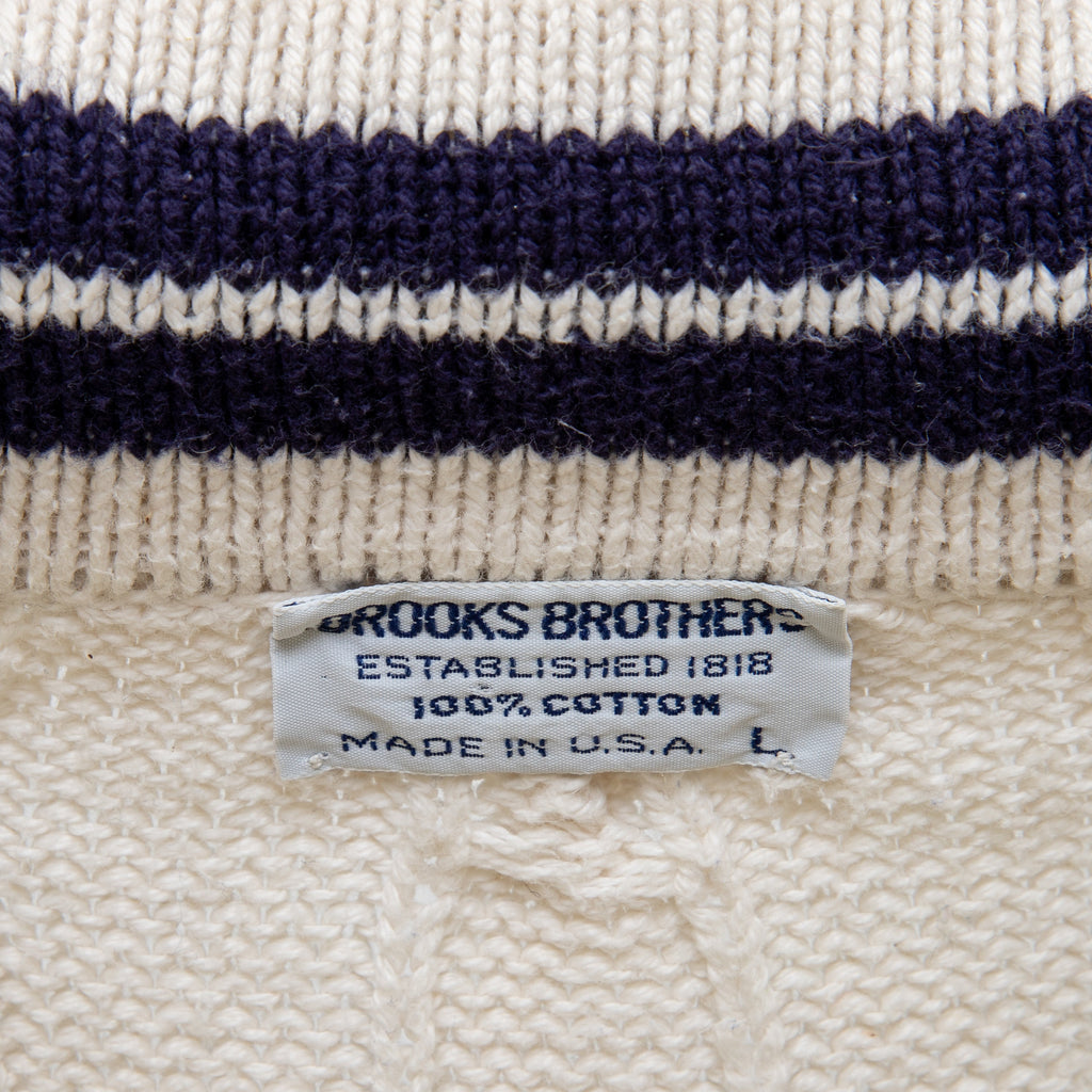Expertly crafted from soft cotton, the Brooks Brothers Cotton Knit Sweater is a classic addition to any wardrobe. It features cable stitching in rope pattern and v-neck design, accented with a blue stripe. The off-white color and stripe details at the hem and sleeve hem make this sweater a classic knitwear staple.