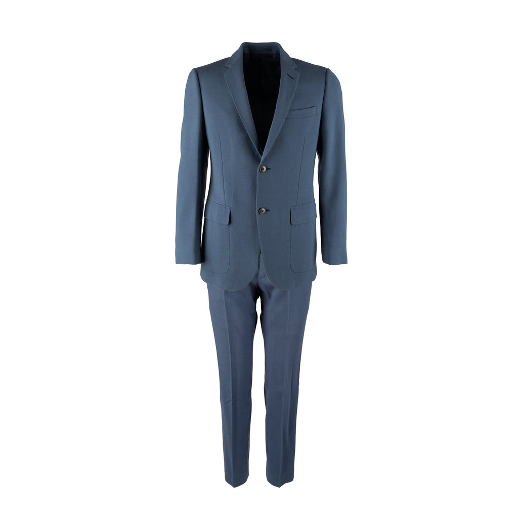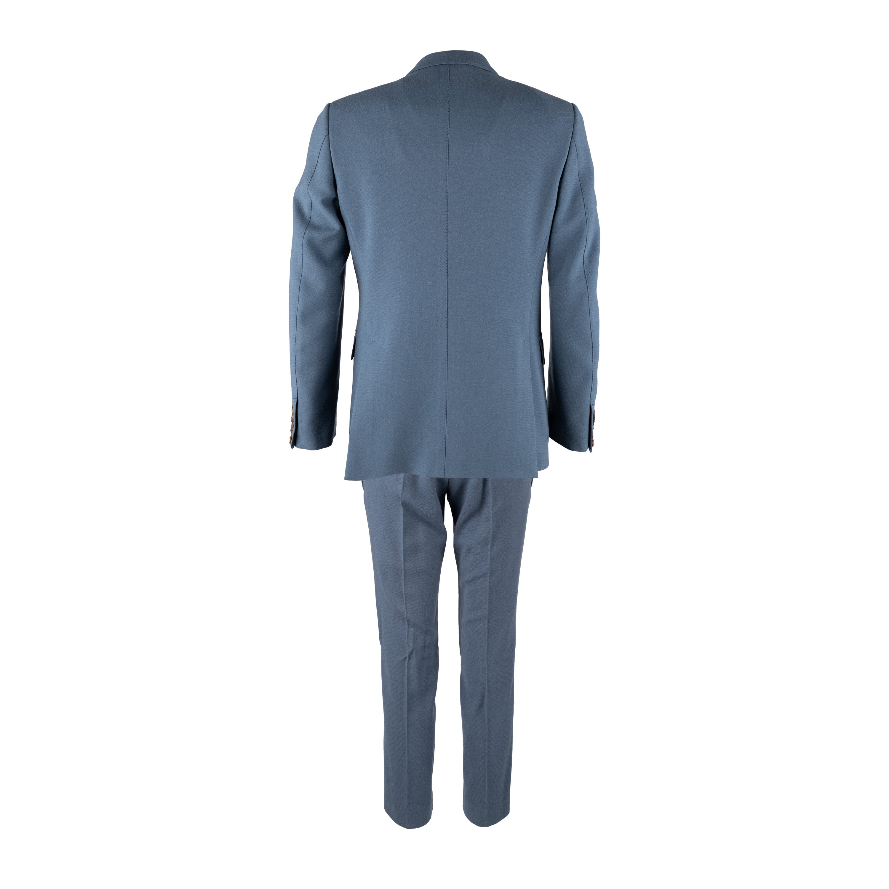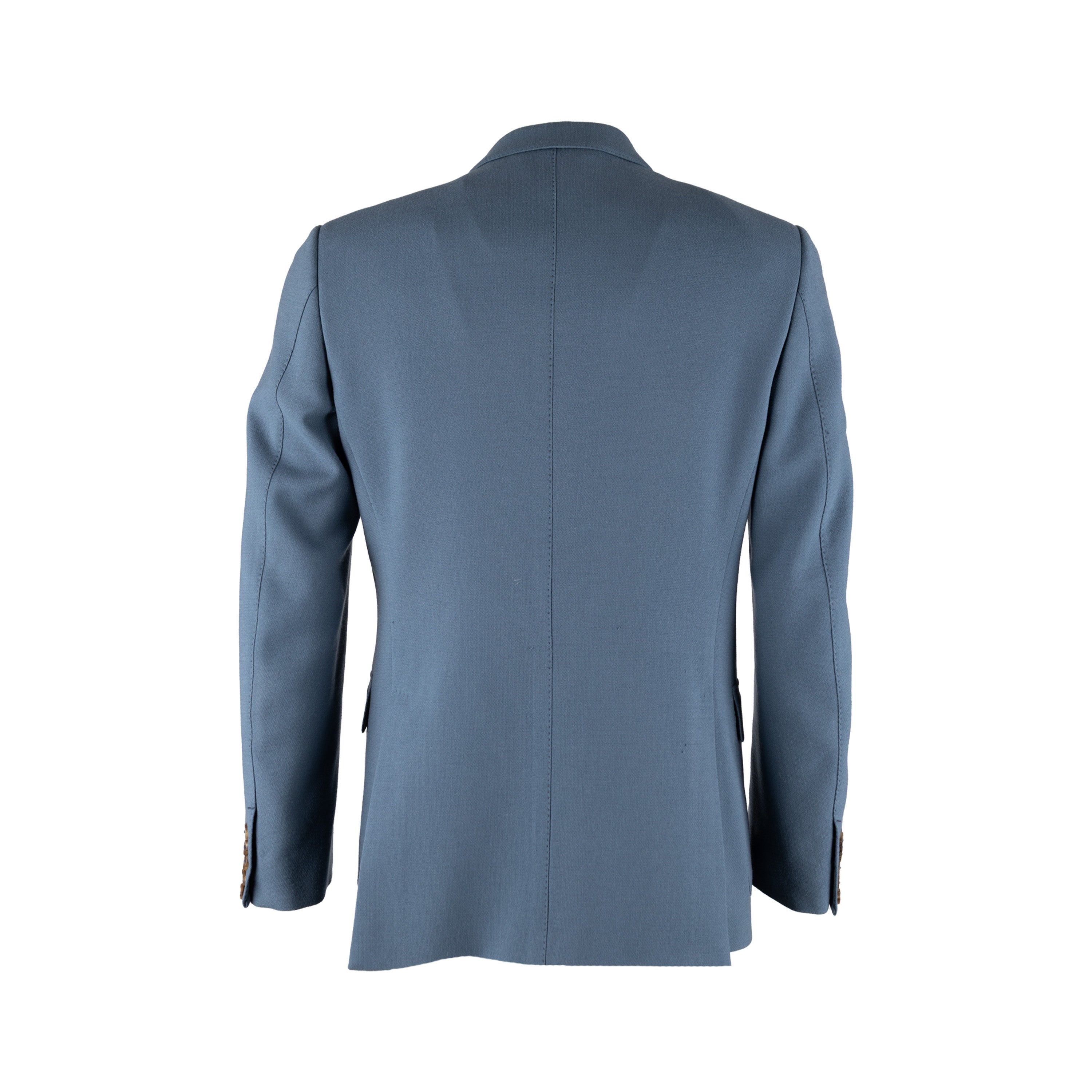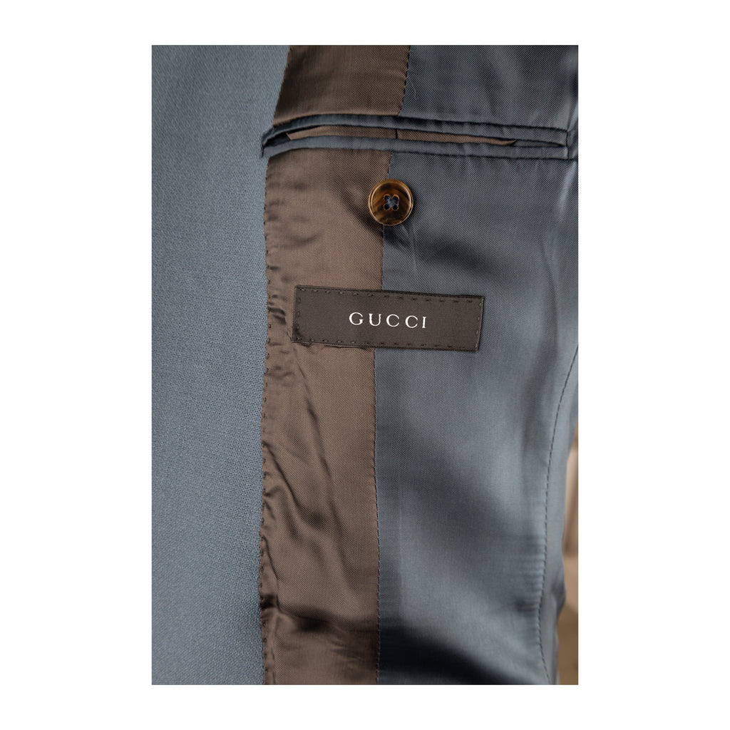 This classic Gucci Blue Suit from the 2000s features a blend of wool and elastane for a comfortable, tailored fit. Details include a notched lapel collar with two front buttons, along with front flap pockets and tailored pants with a front zip closure.