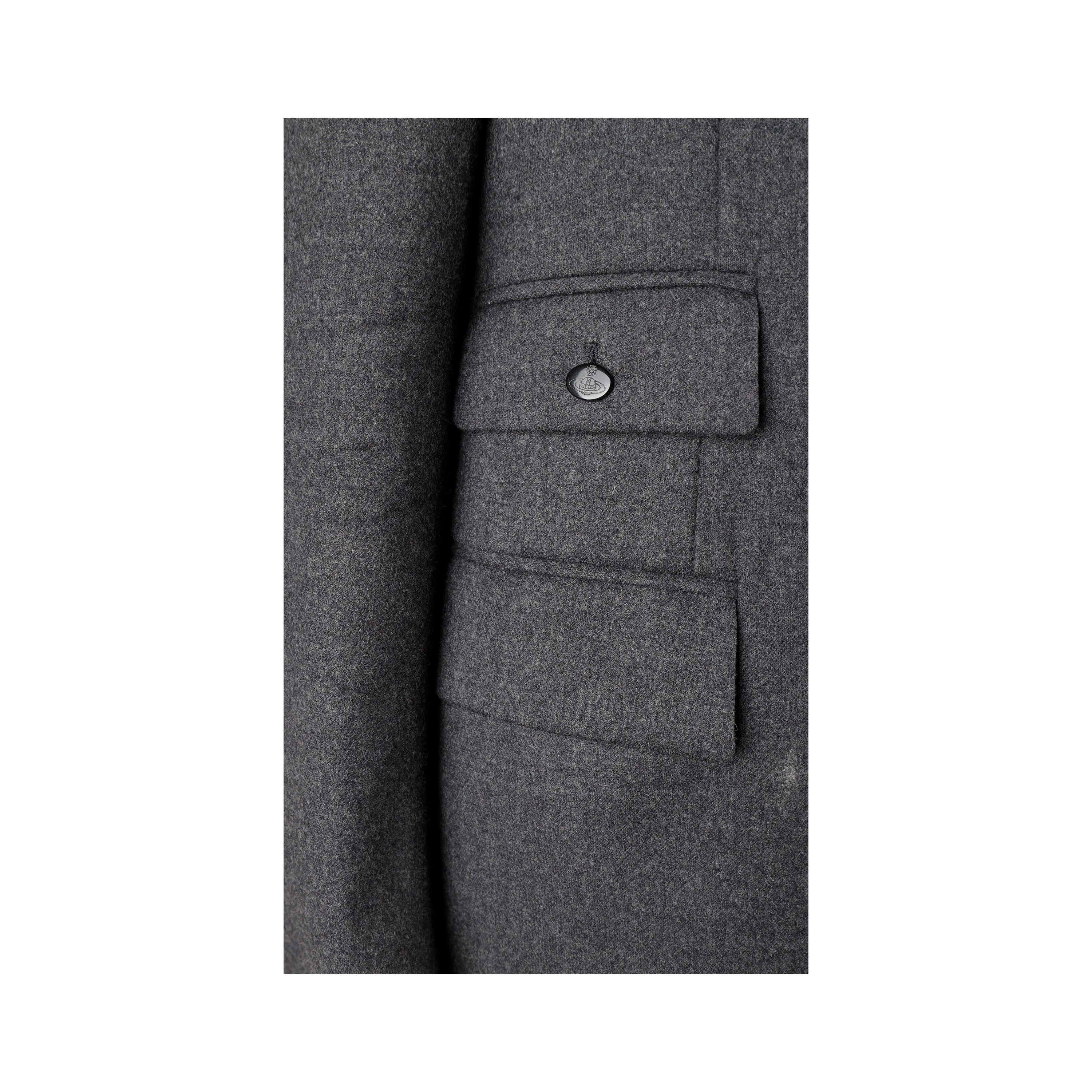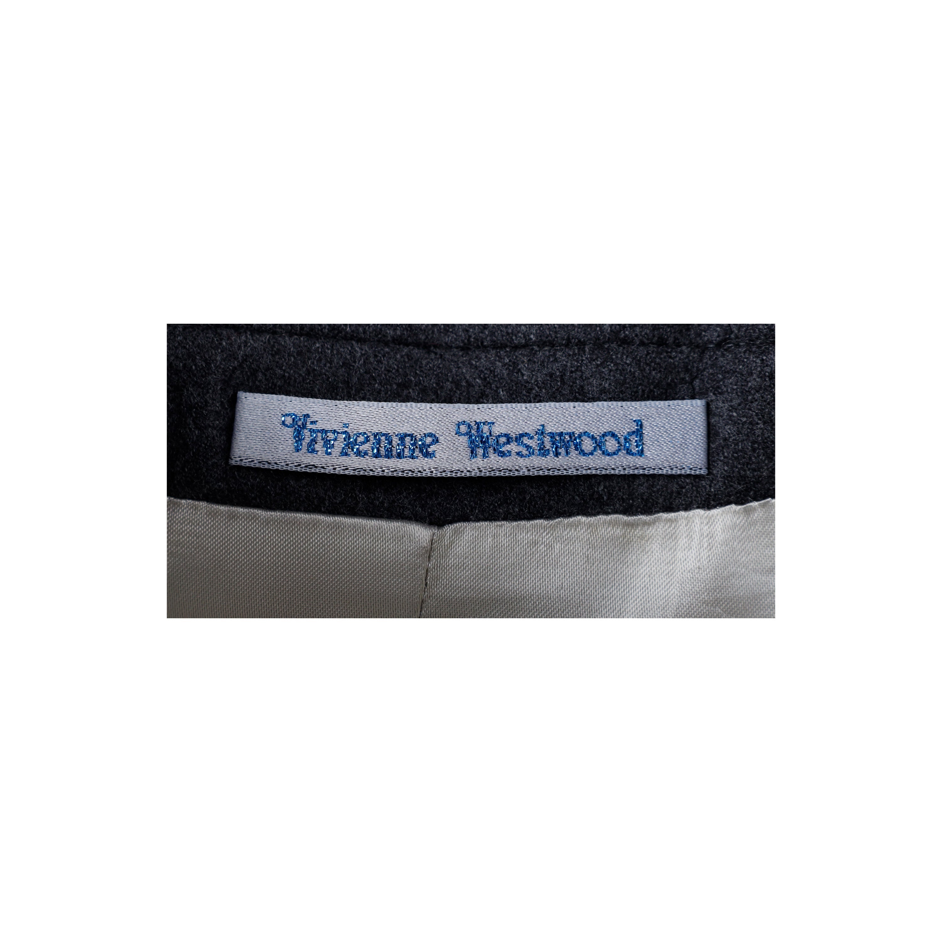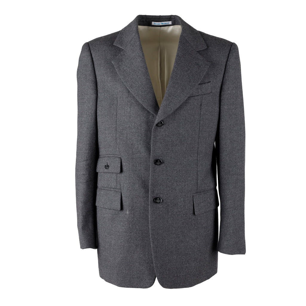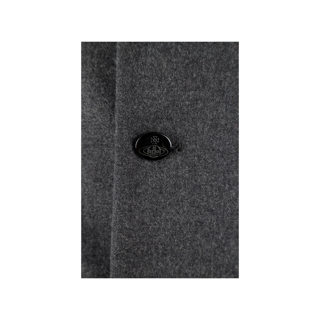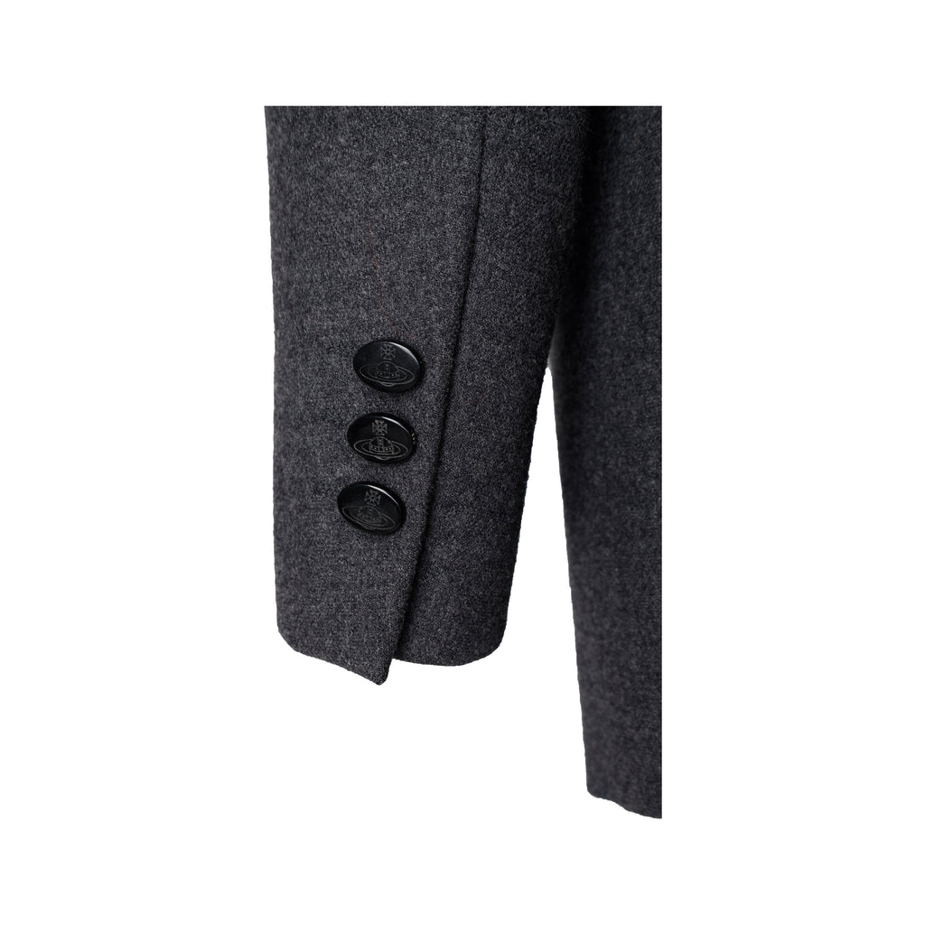 This Vivienne Westwood grey wool suit is tailored with a mix of wool, nylon, and elastomer for comfort and durability. The suit features a notched lapel collar with 3 black logo embossed buttons, front flap pockets, and tailored pants with a button closure.