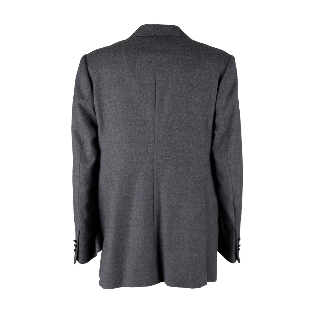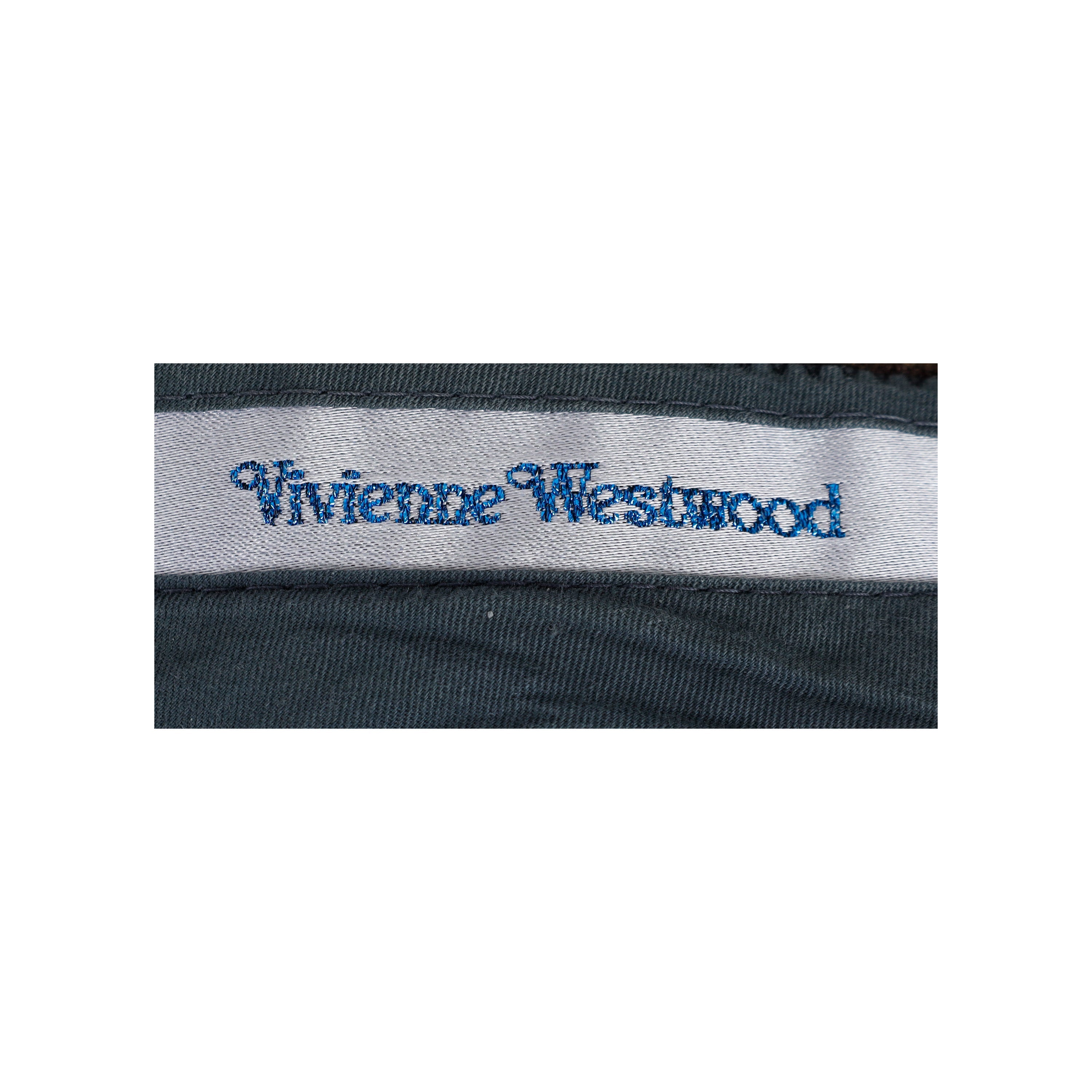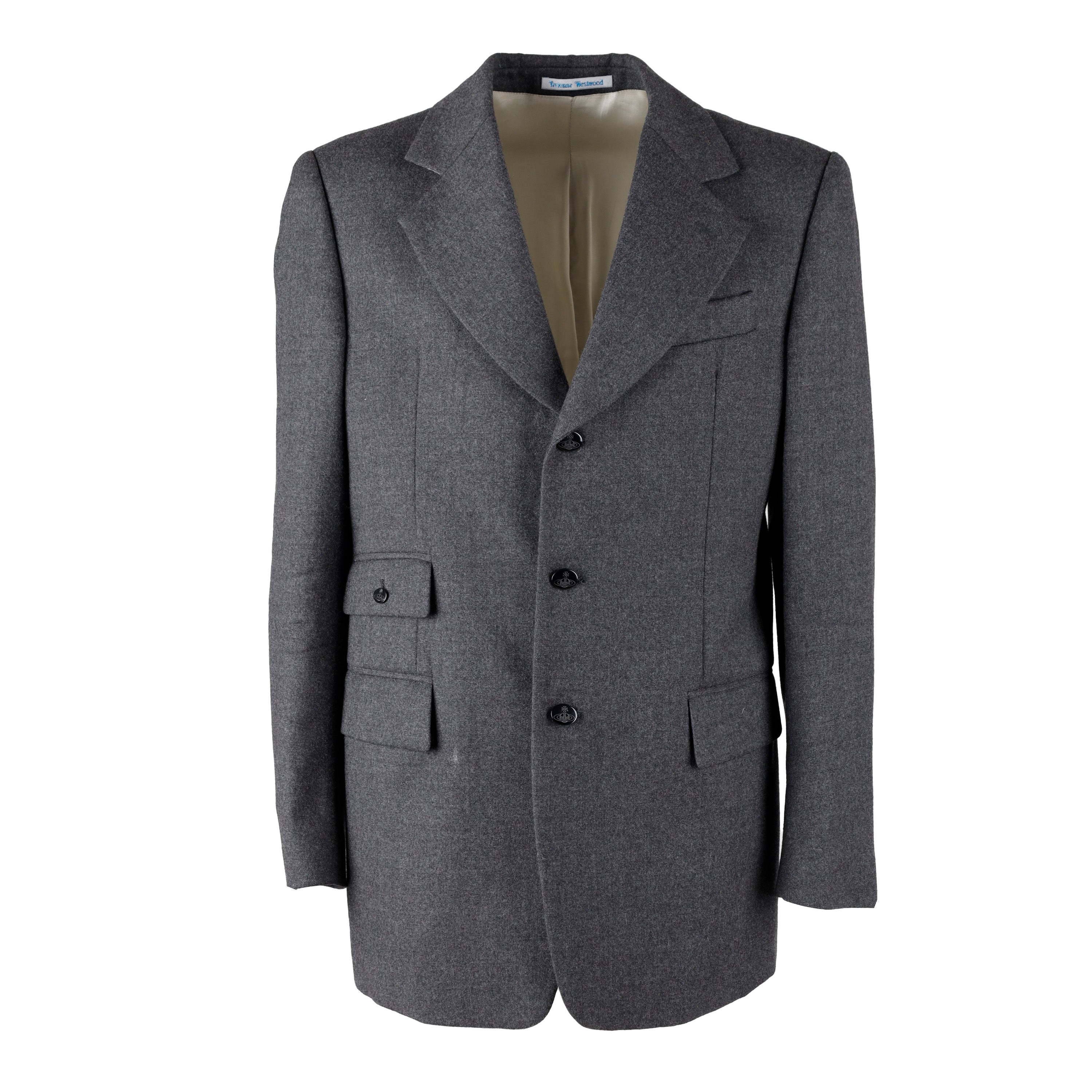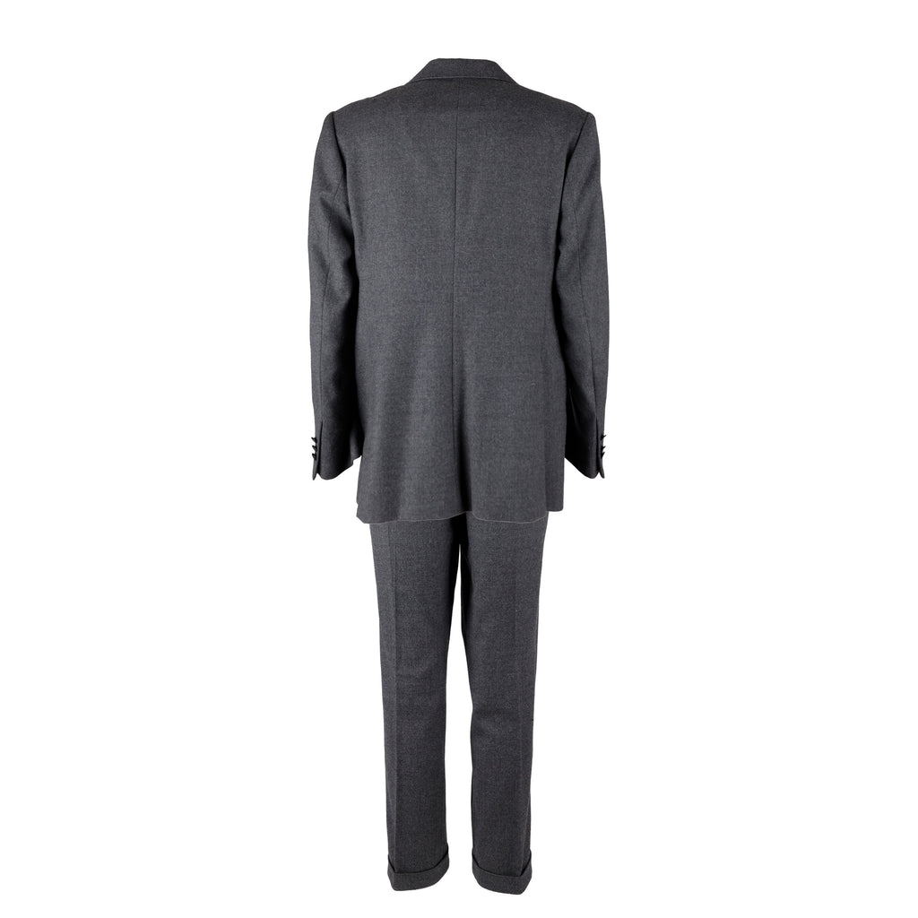 This Vivienne Westwood grey wool suit is tailored with a mix of wool, nylon, and elastomer for comfort and durability. The suit features a notched lapel collar with 3 black logo embossed buttons, front flap pockets, and tailored pants with a button closure.