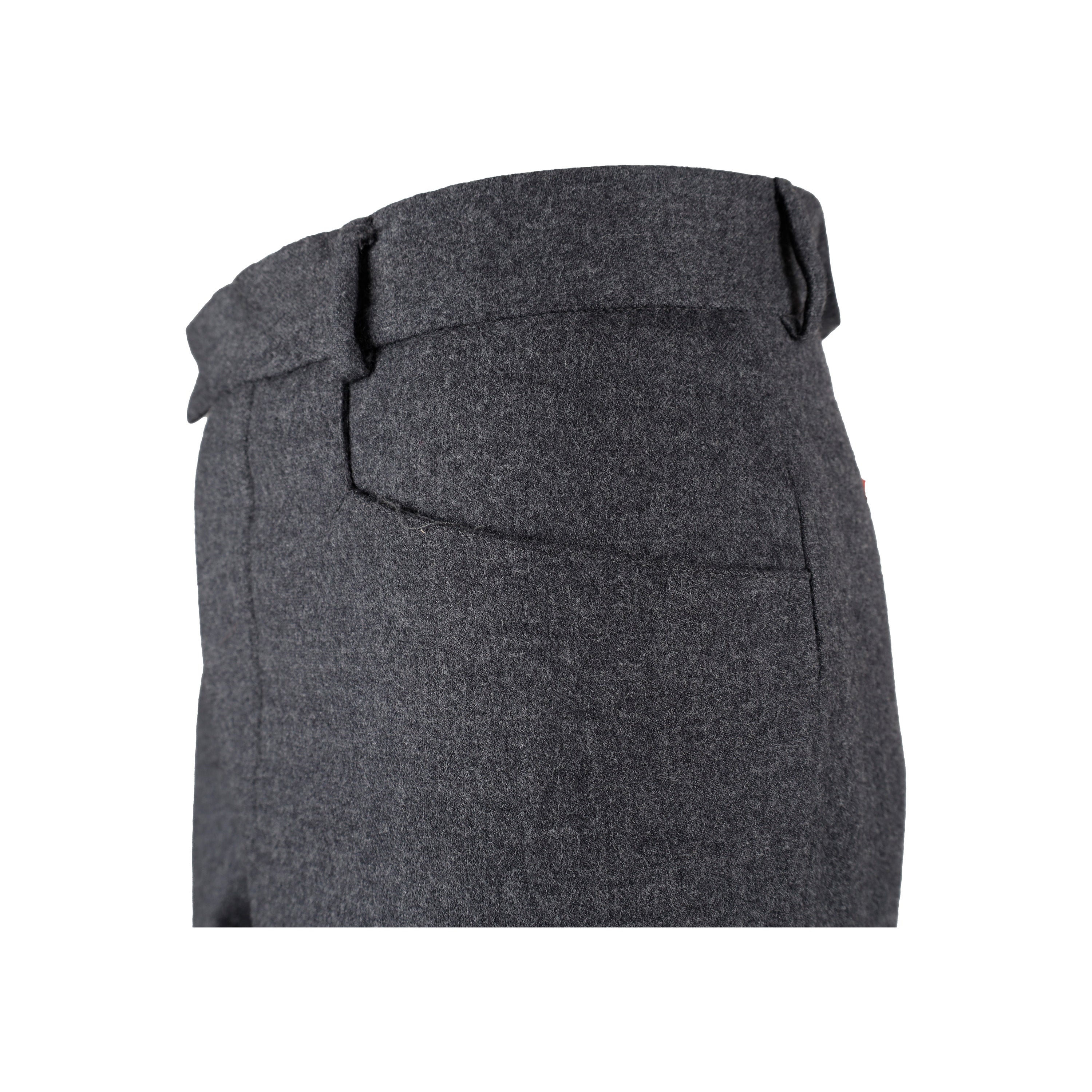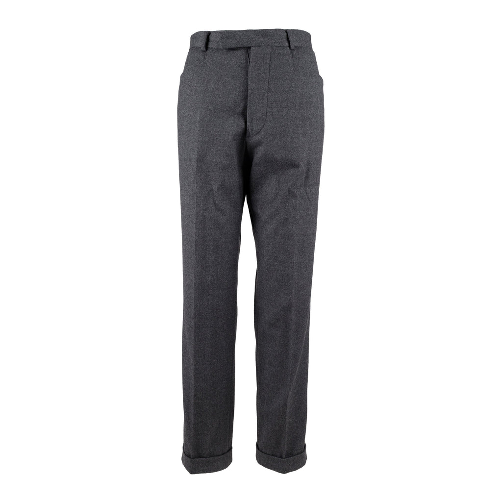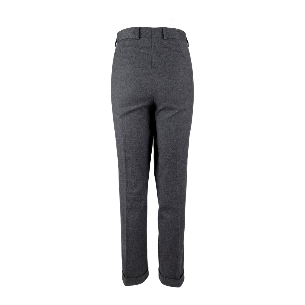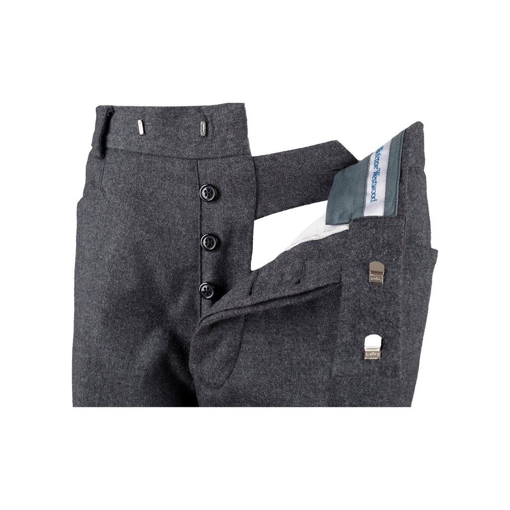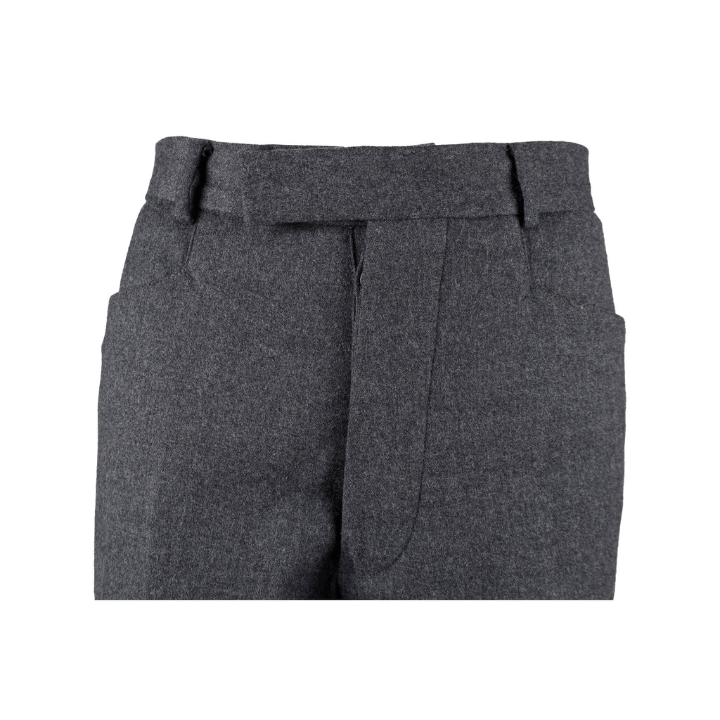 This Vivienne Westwood grey wool suit is tailored with a mix of wool, nylon, and elastomer for comfort and durability. The suit features a notched lapel collar with 3 black logo embossed buttons, front flap pockets, and tailored pants with a button closure.