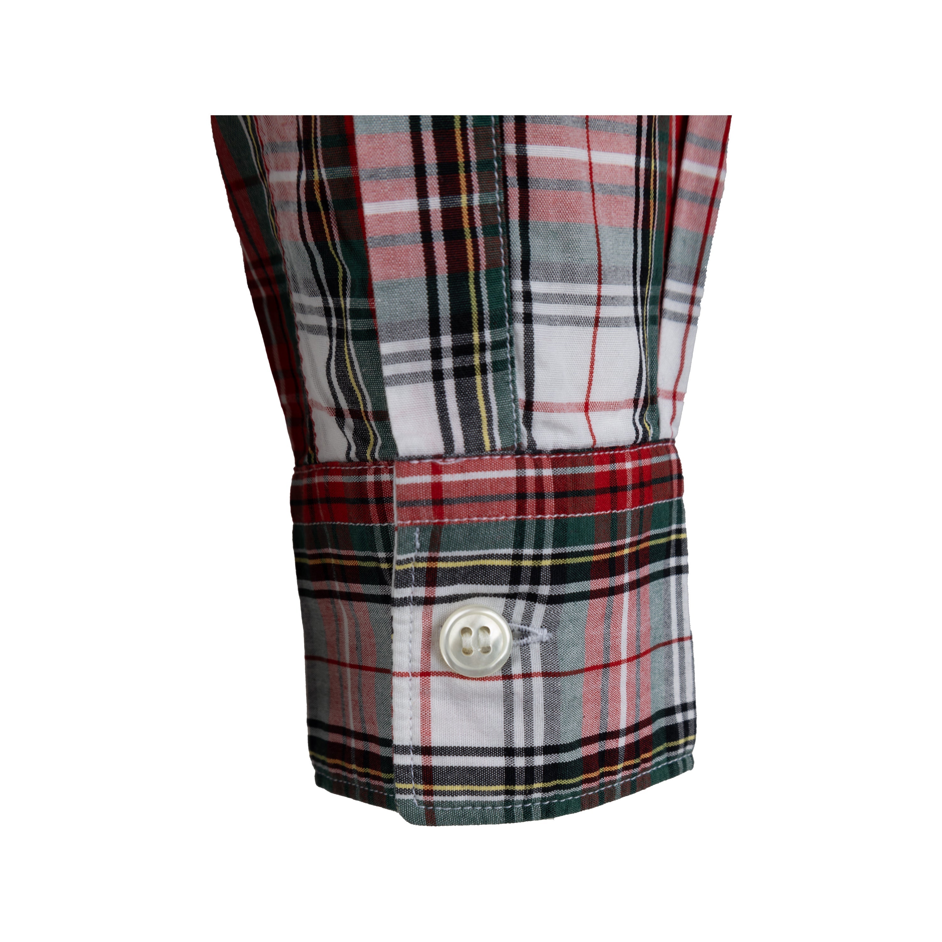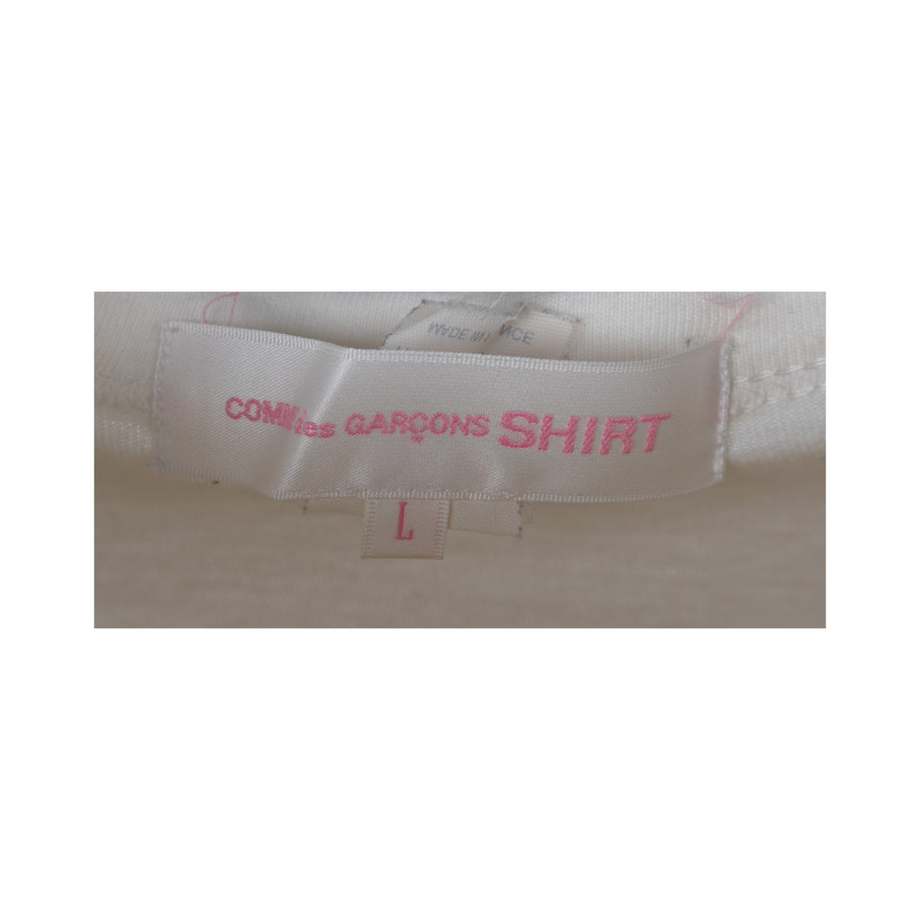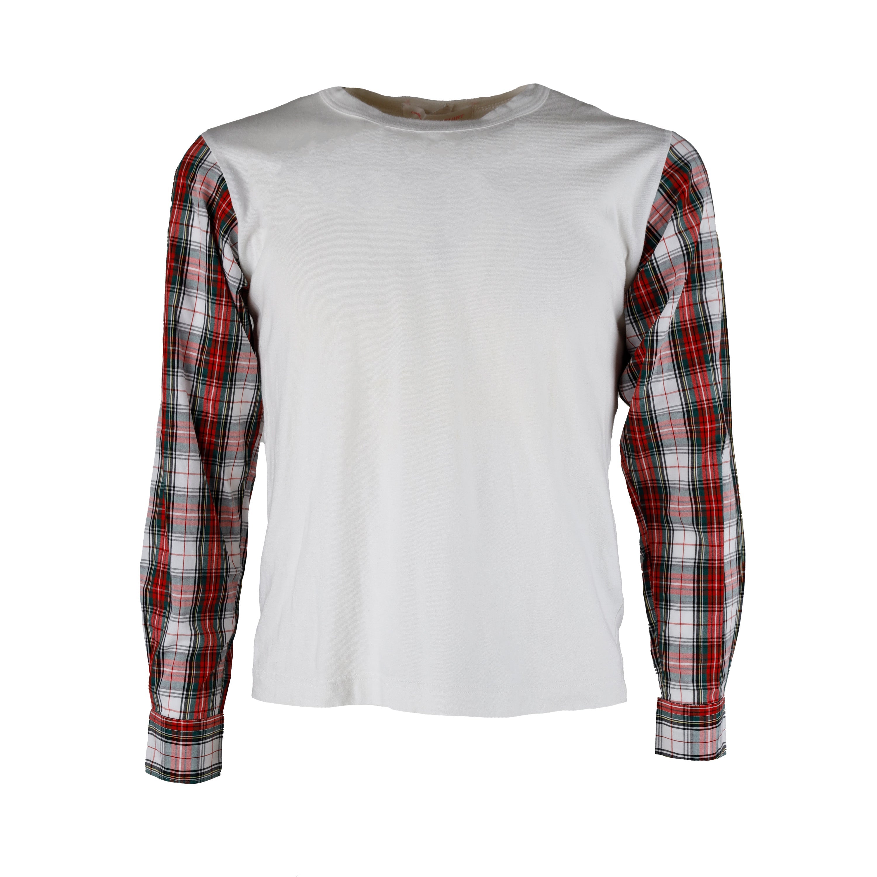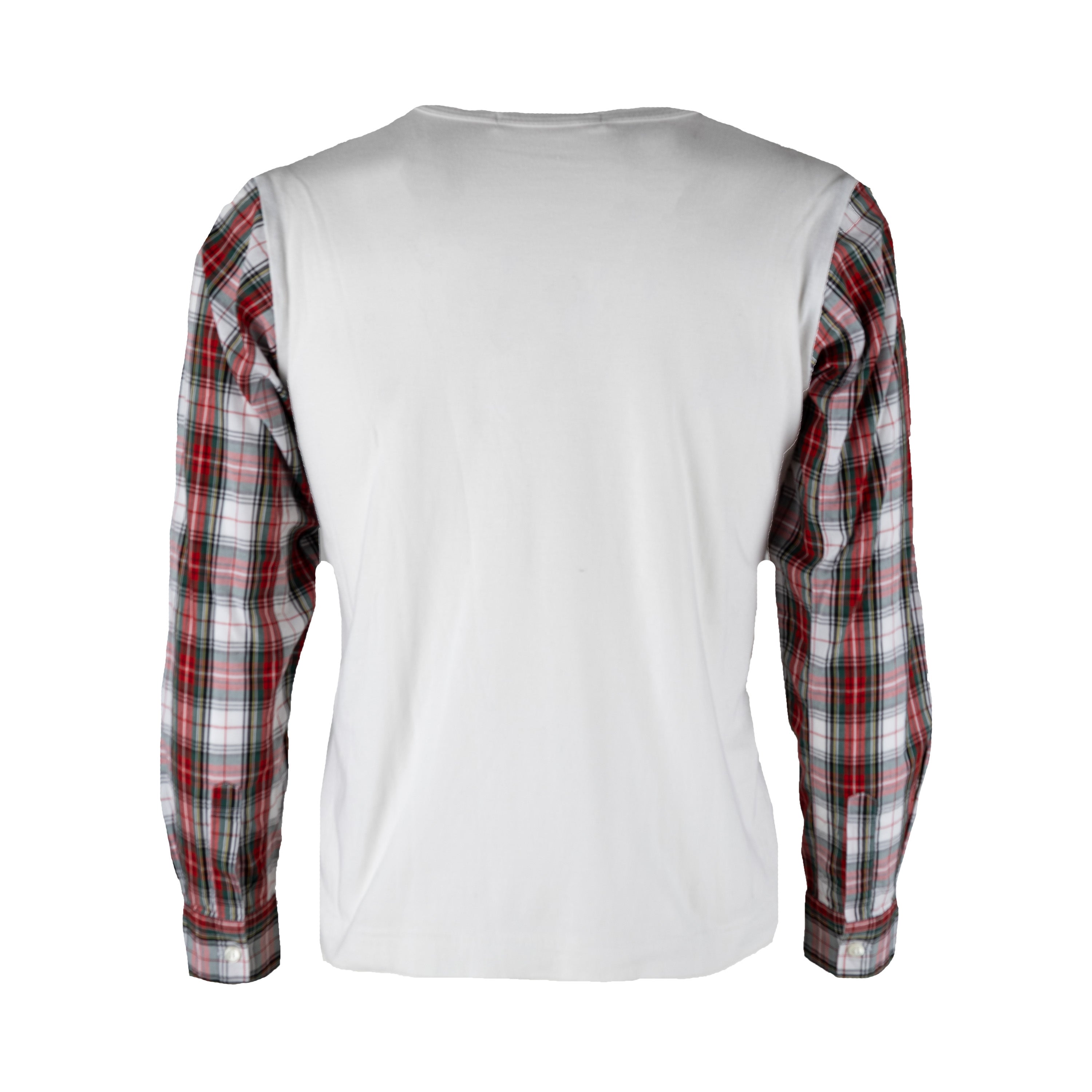 This Comme des Garçons t-shirt features a unique multicolor checkered pattern on the sleeves, elevating the classic white base. With a round neck and long sleeves with cuffs, this shirt is a perfect blend of style and comfort.
