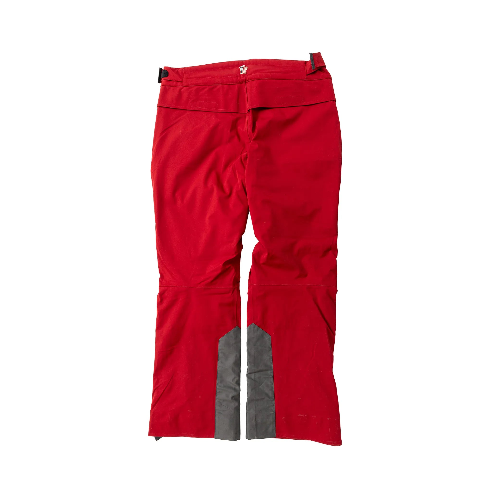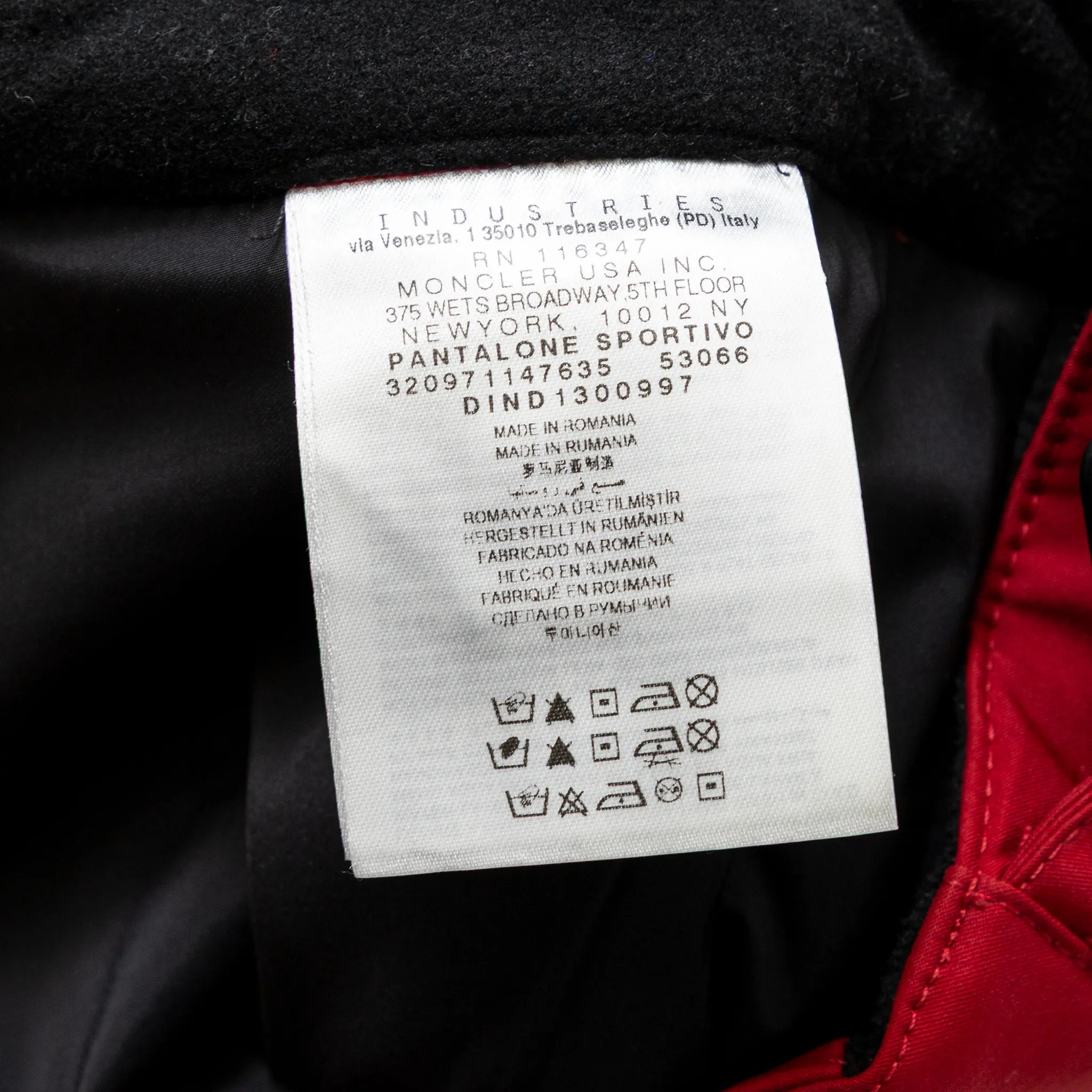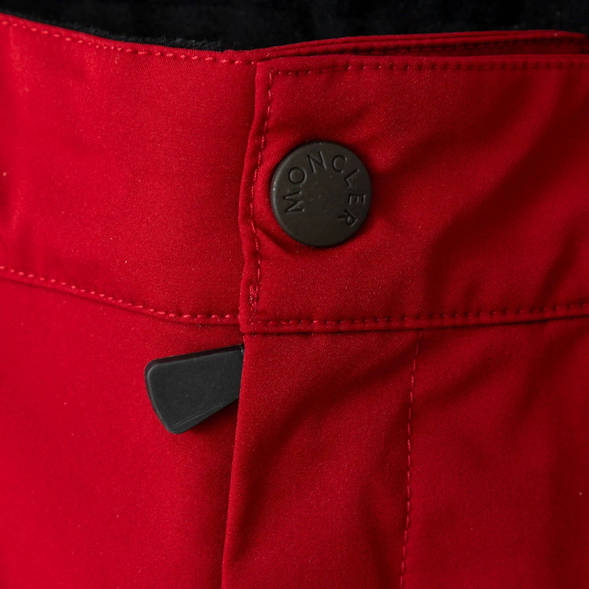 Designed for comfort and style on the slopes, these Moncler ski pants in red with grey trims feature an adjustable waistband, warm lining, and strategically placed pockets.