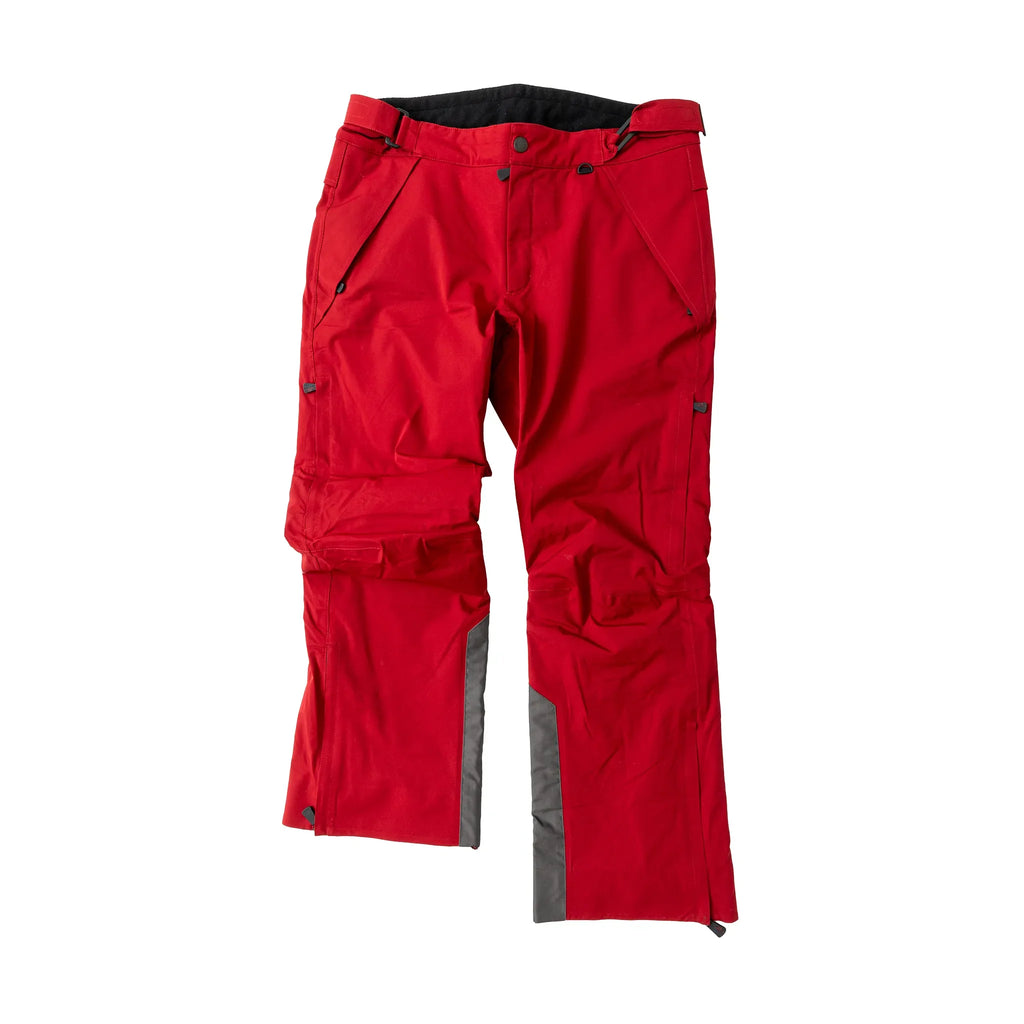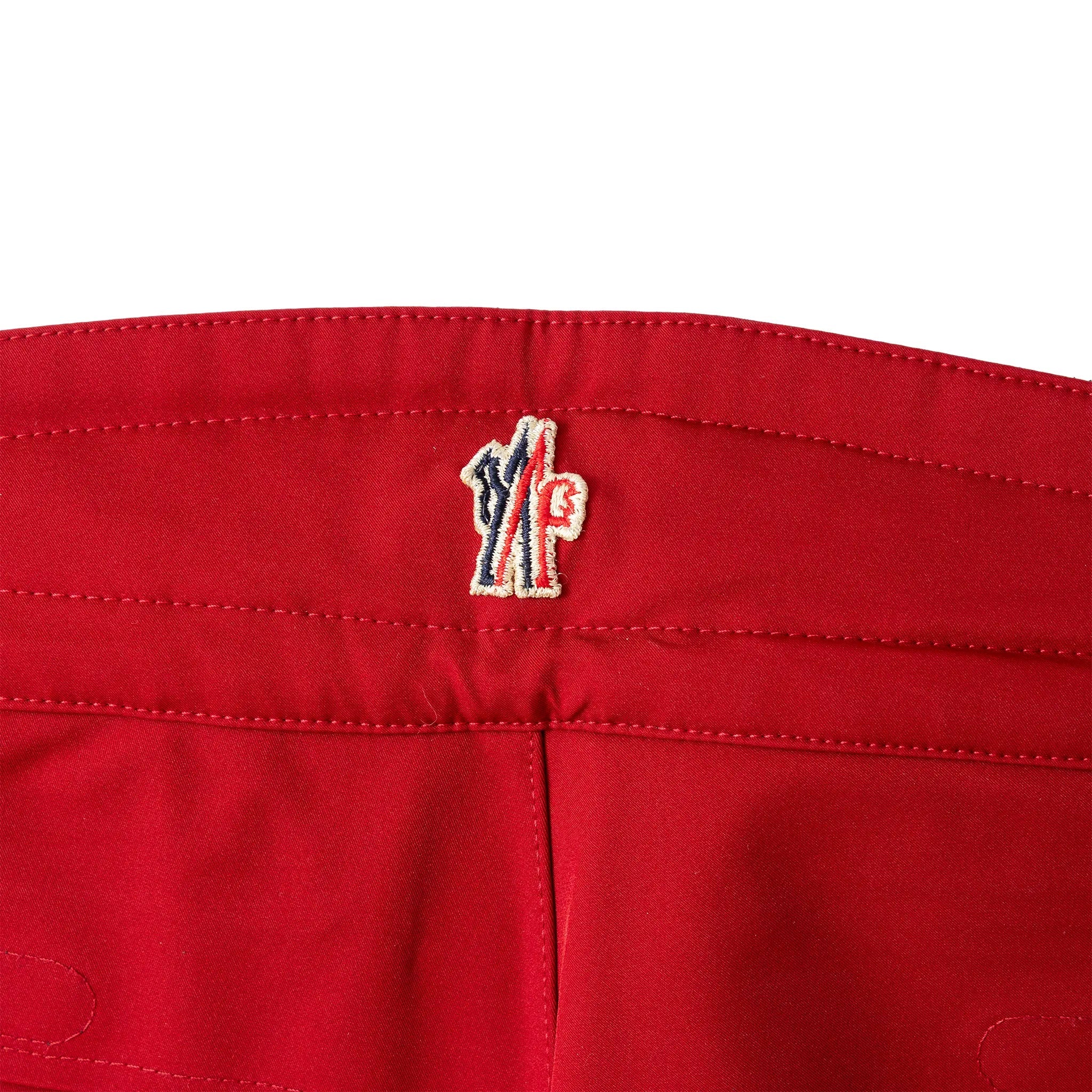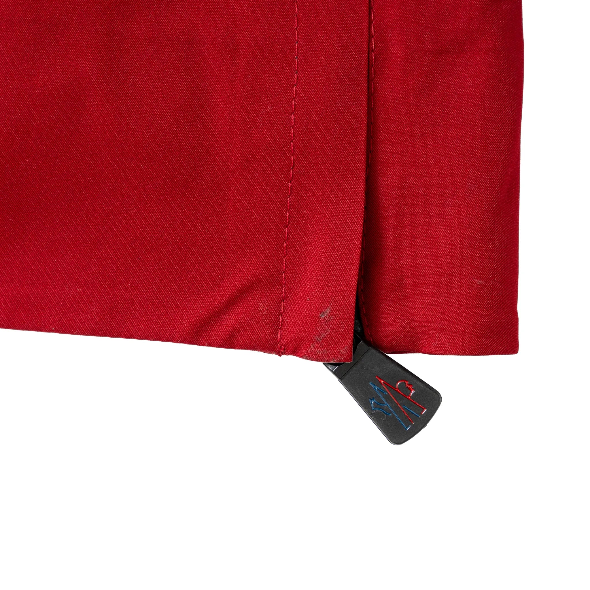 Designed for comfort and style on the slopes, these Moncler ski pants in red with grey trims feature an adjustable waistband, warm lining, and strategically placed pockets.