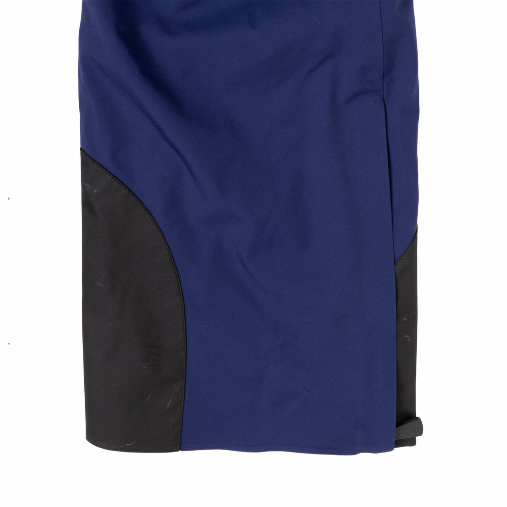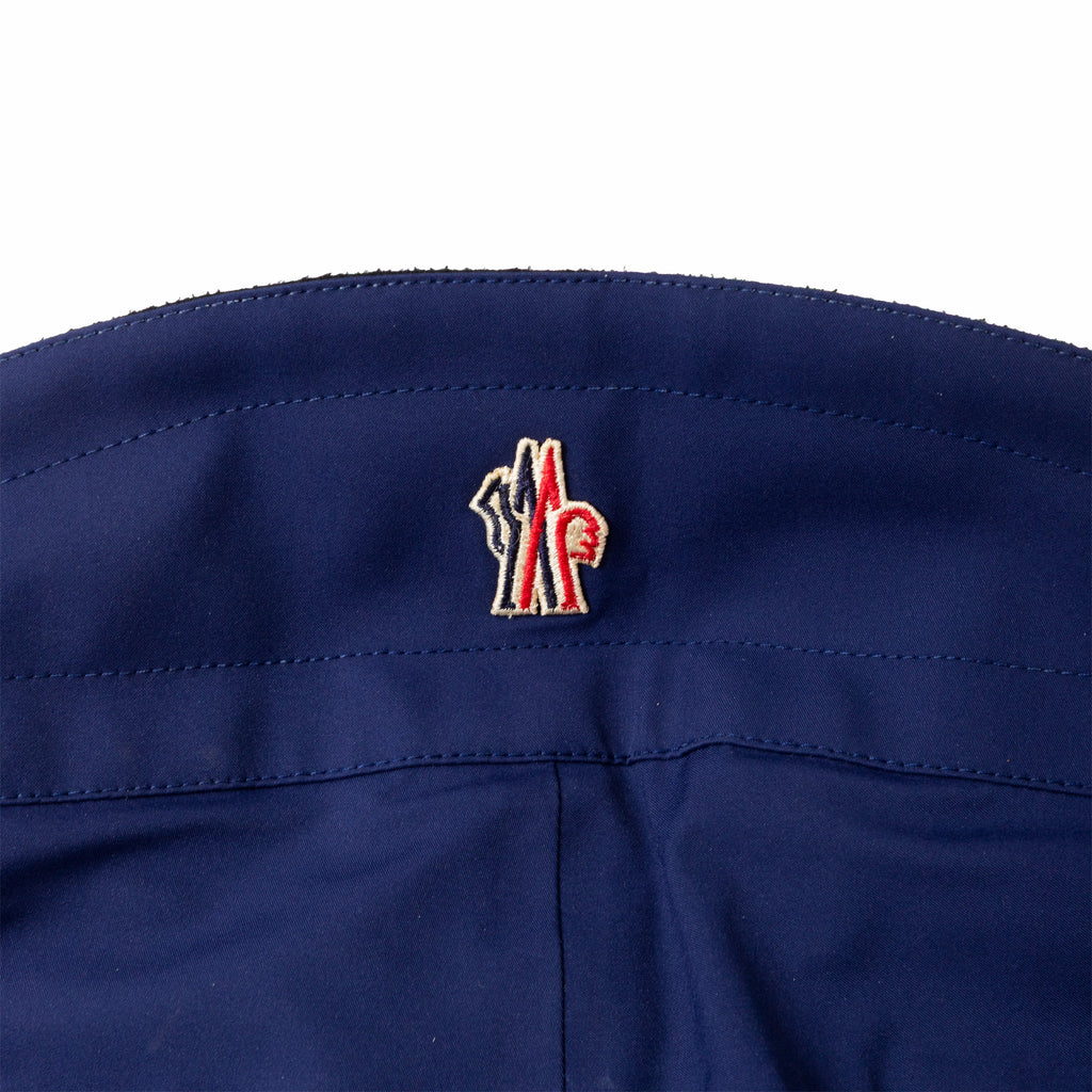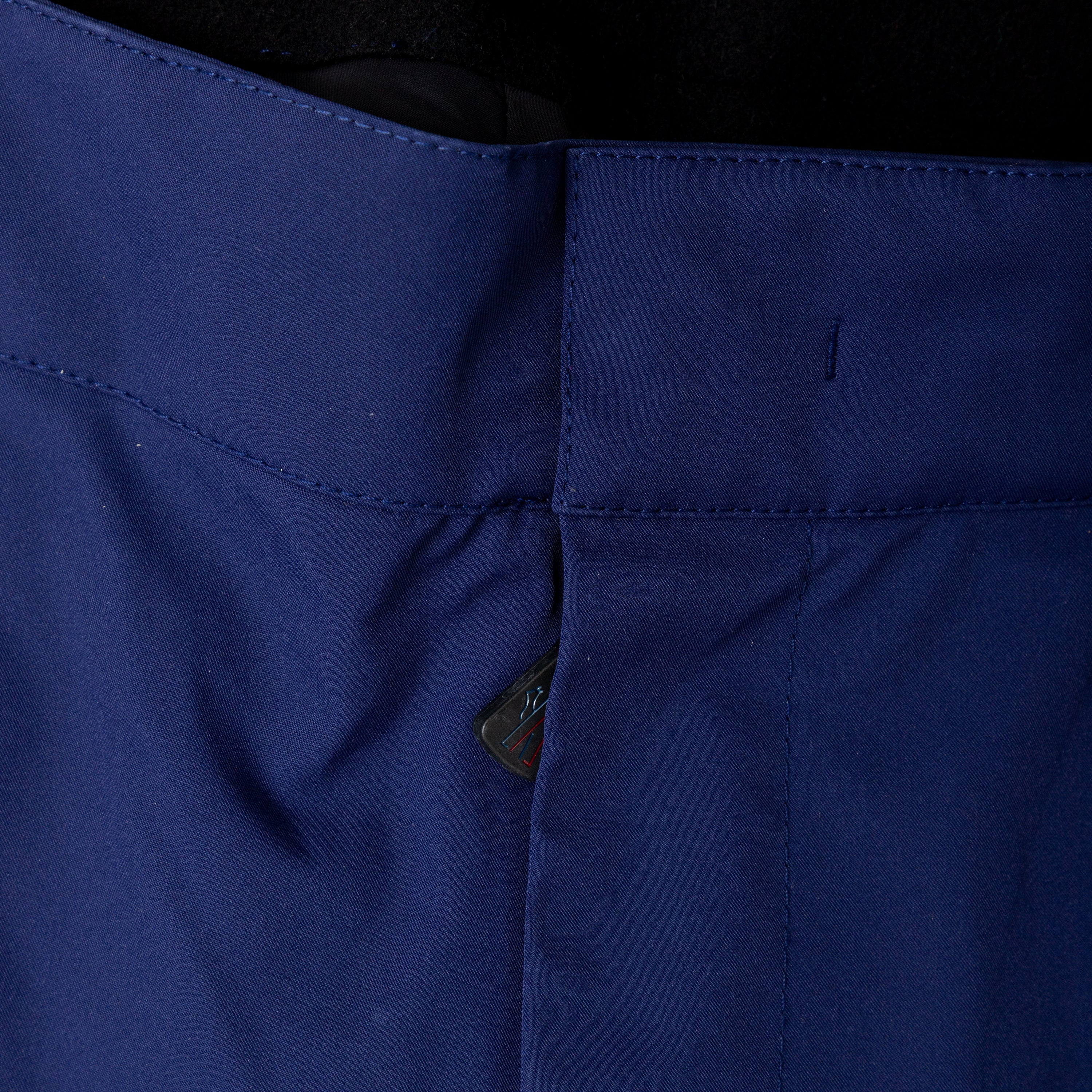 Crafted from high-performance fabric, these Moncler ski pants in dark blue with black trims feature an adjustable waistband for comfort and style on the slopes.
