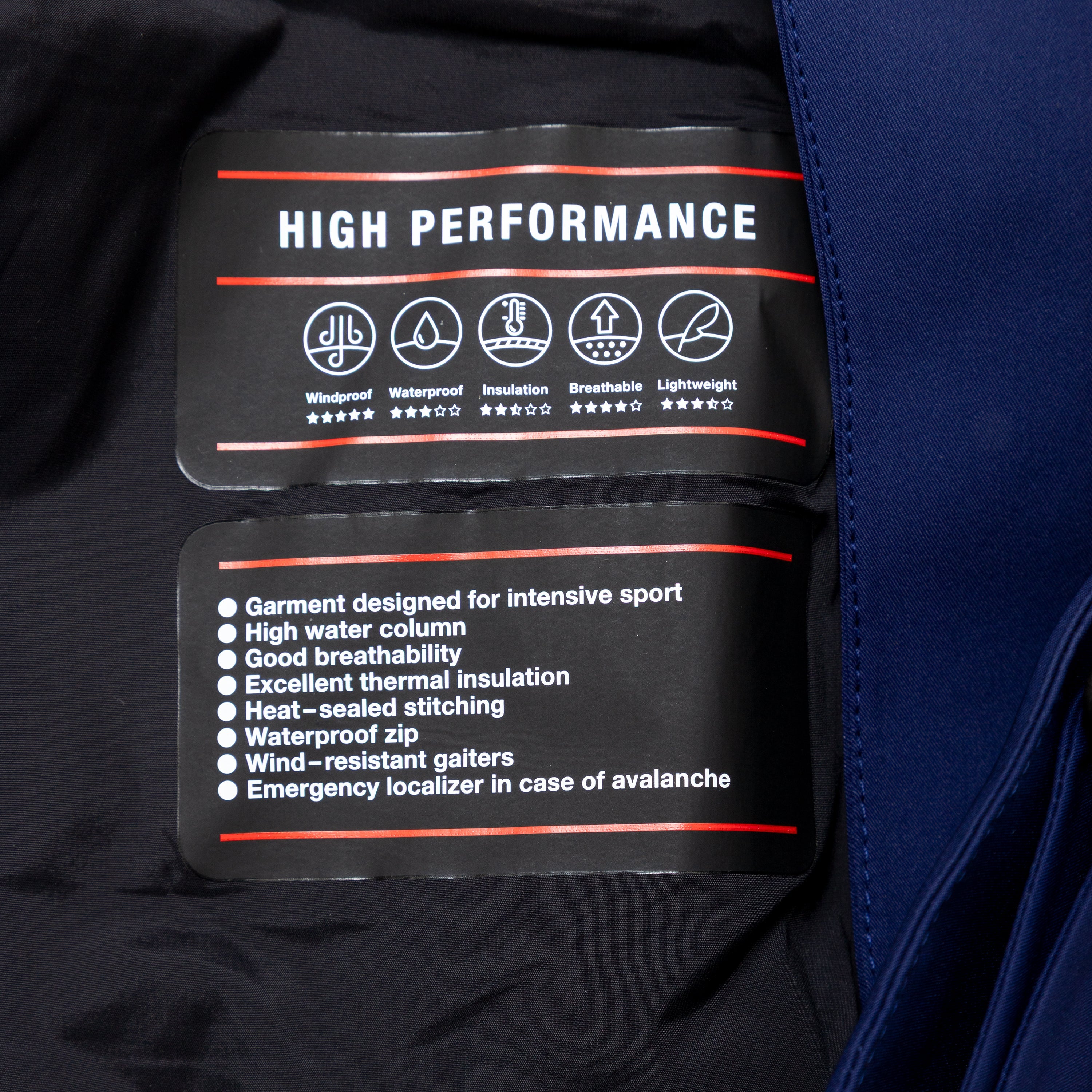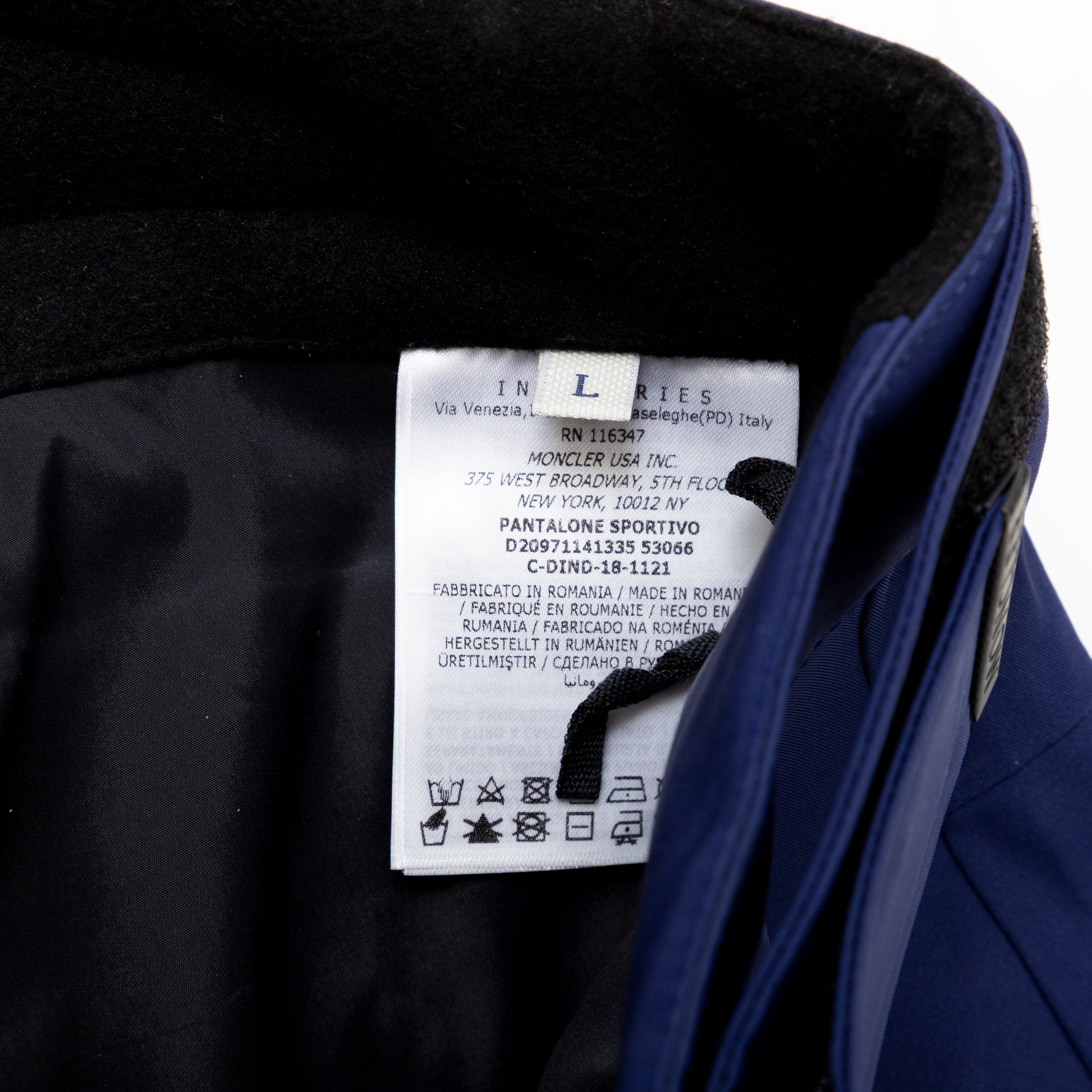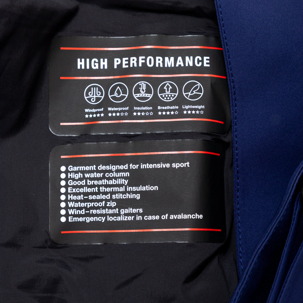 Crafted from high-performance fabric, these Moncler ski pants in dark blue with black trims feature an adjustable waistband for comfort and style on the slopes.