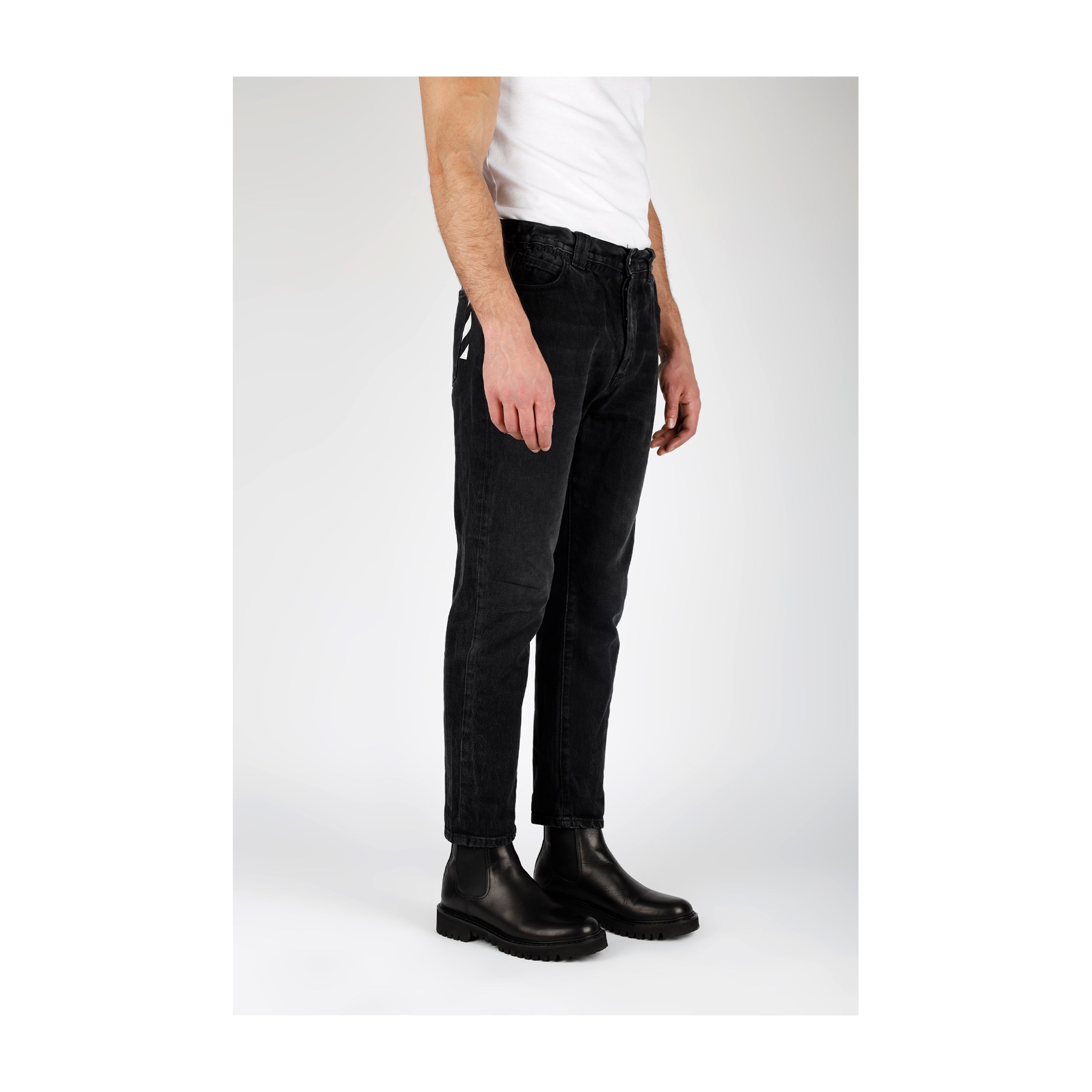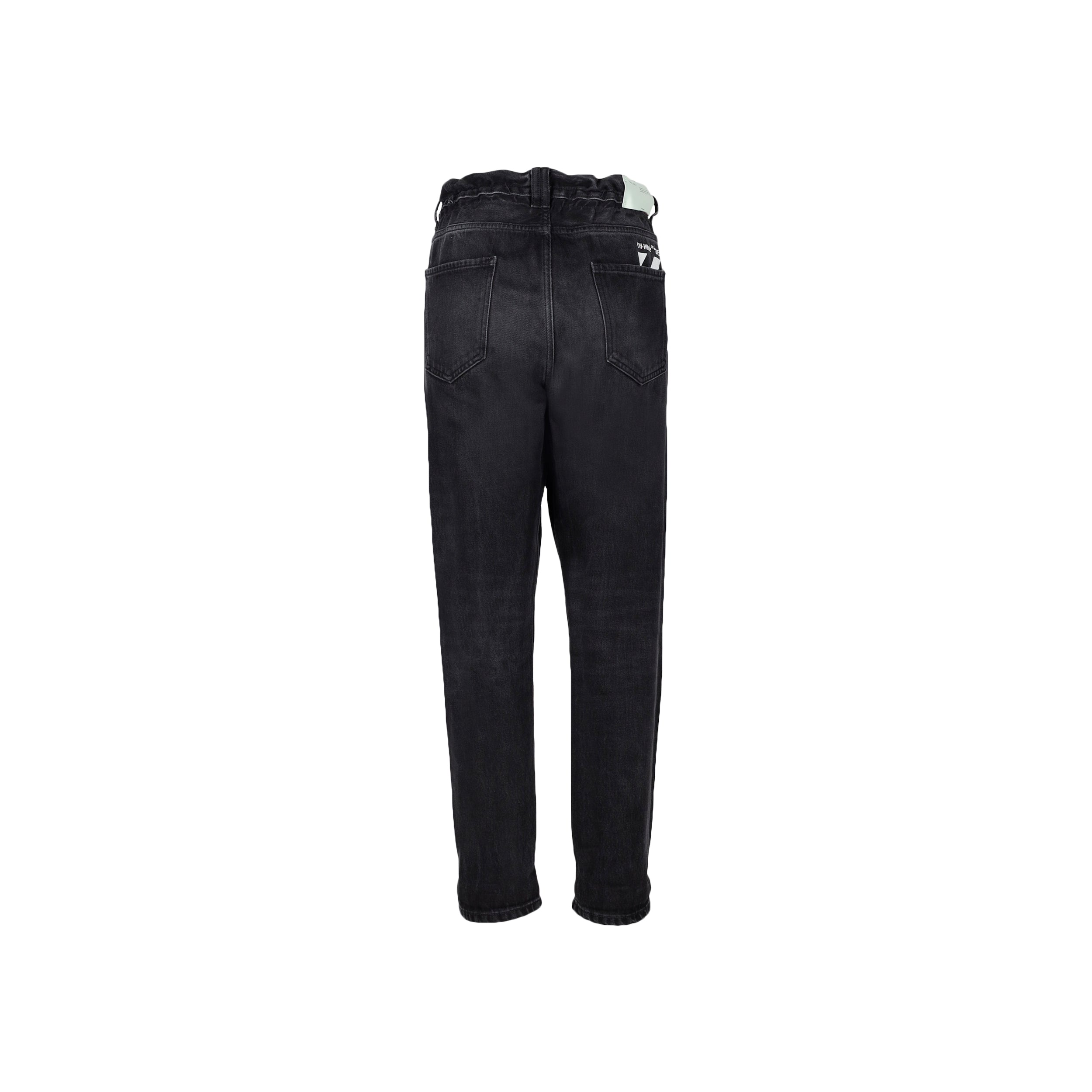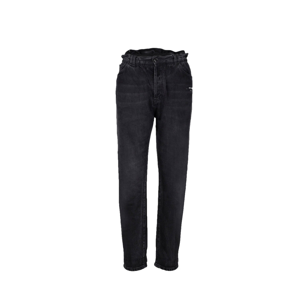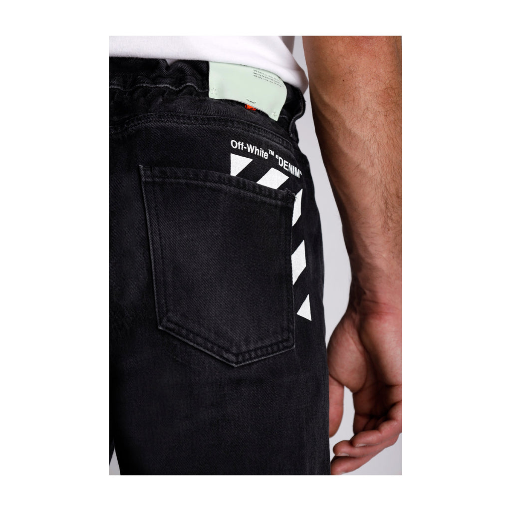 Off-White Denim Label black jeans, concealed front button closure, five pockets.