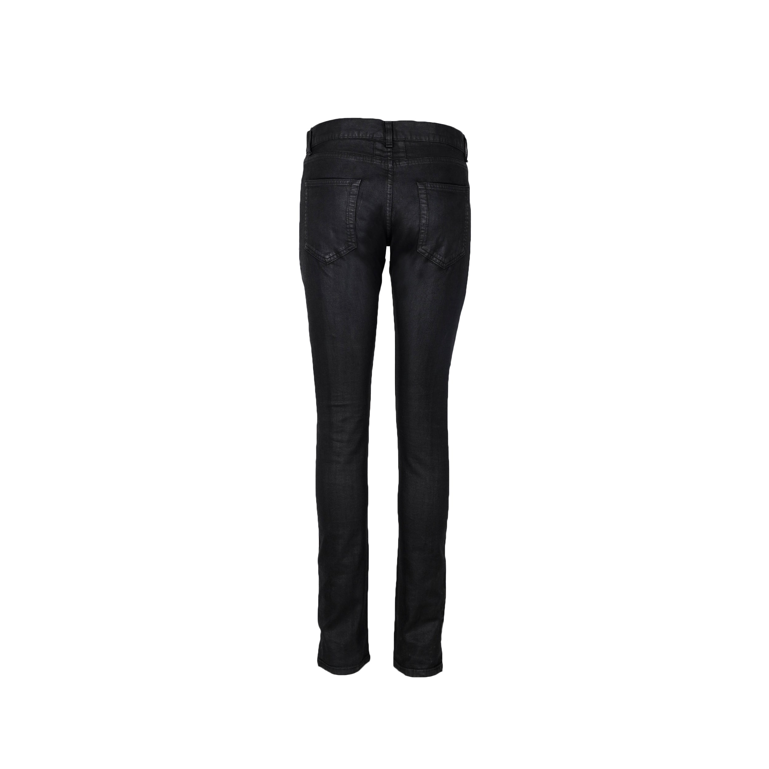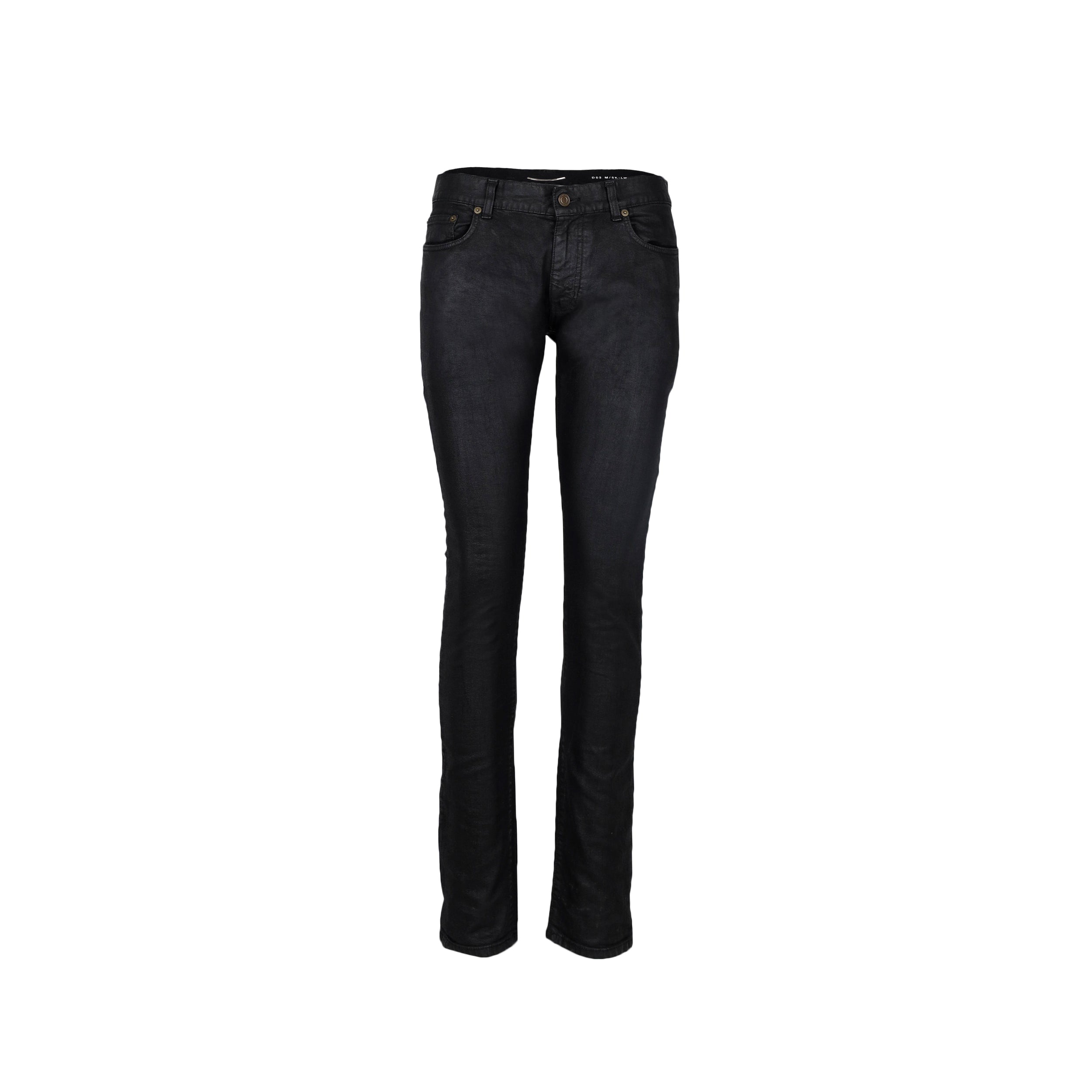 Saint Laurent skinny coated black jeans, zip fastening, five pockets.